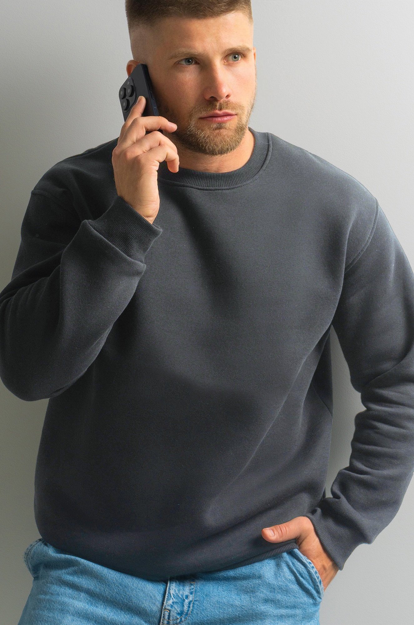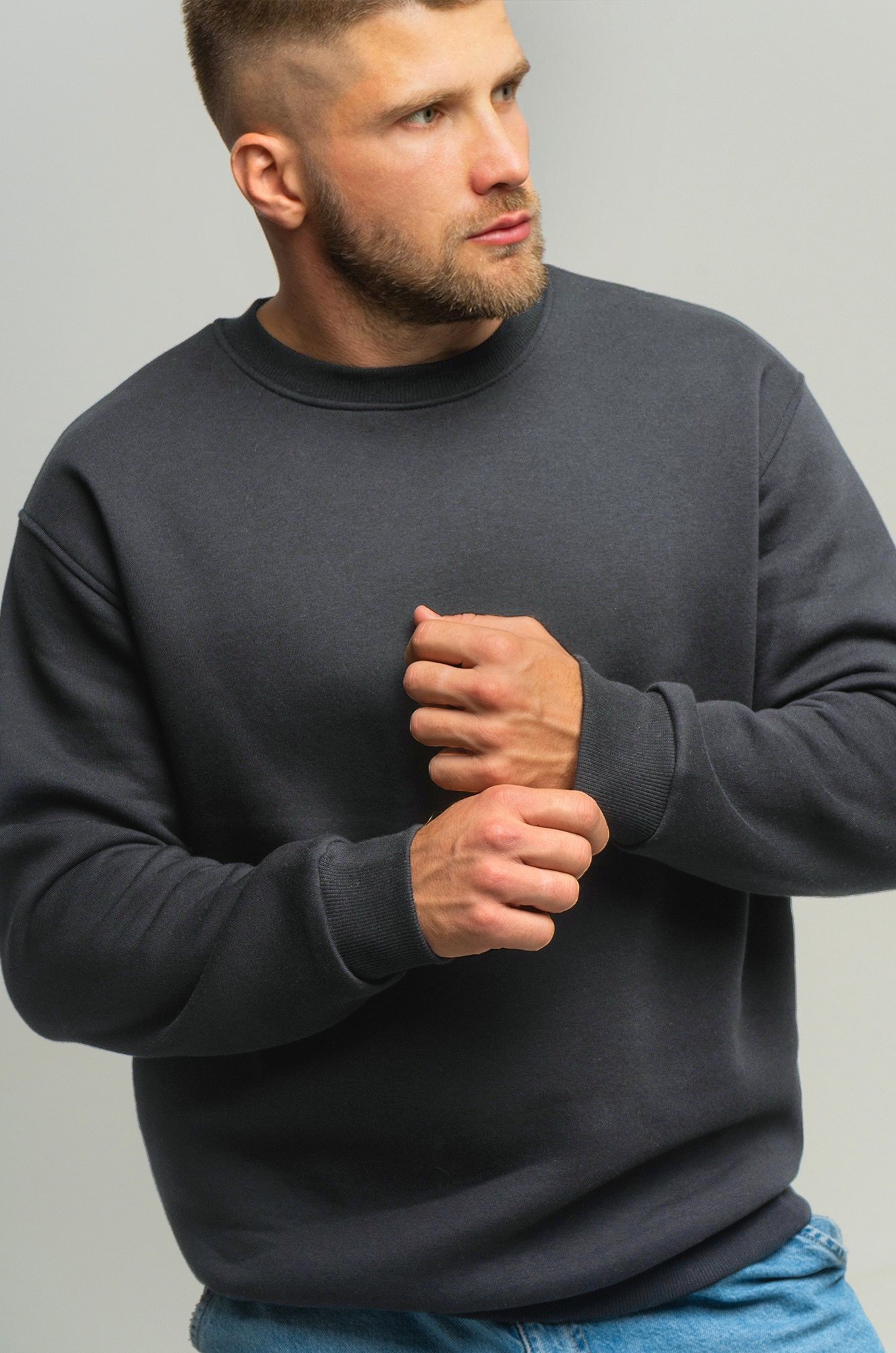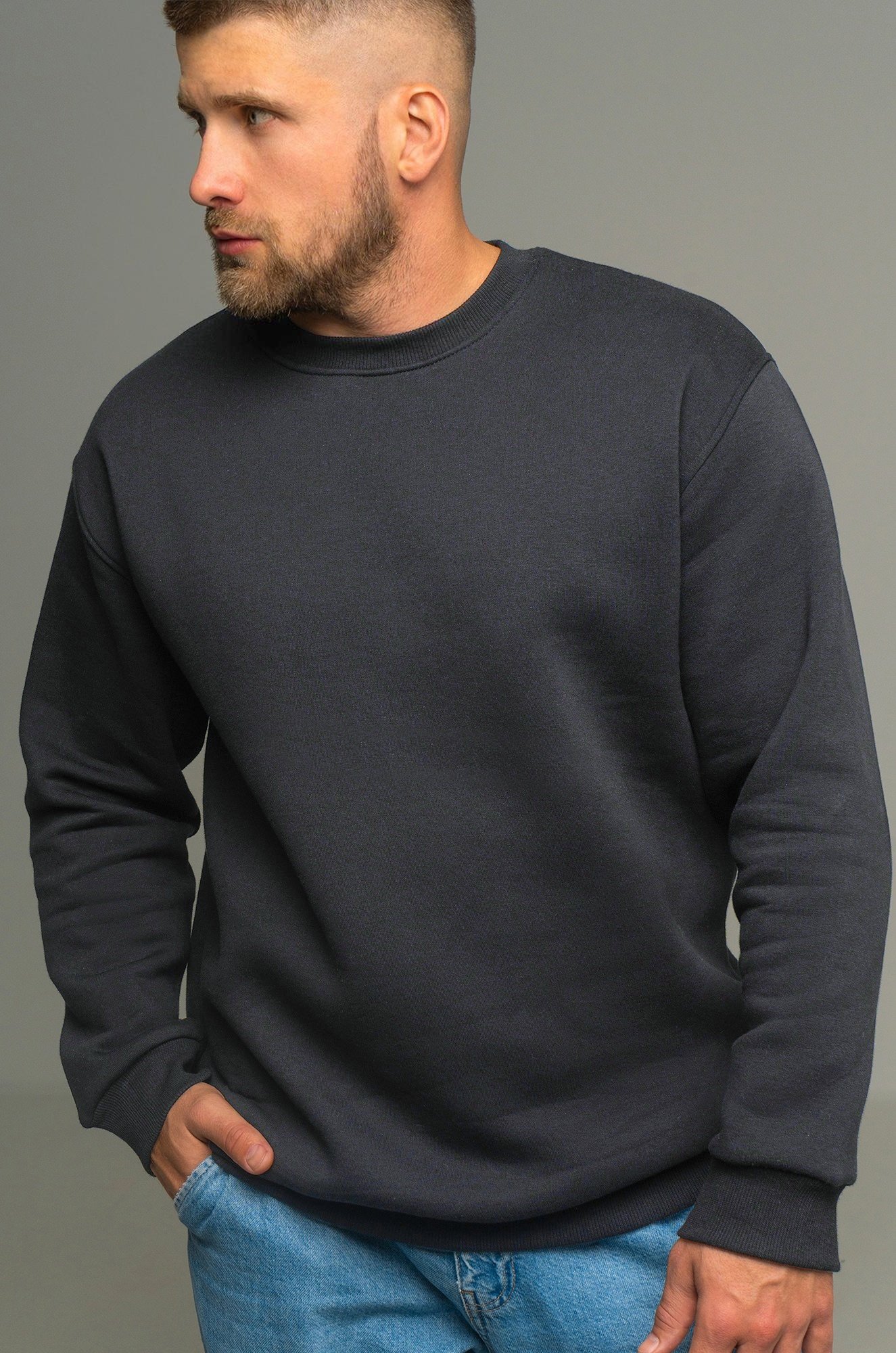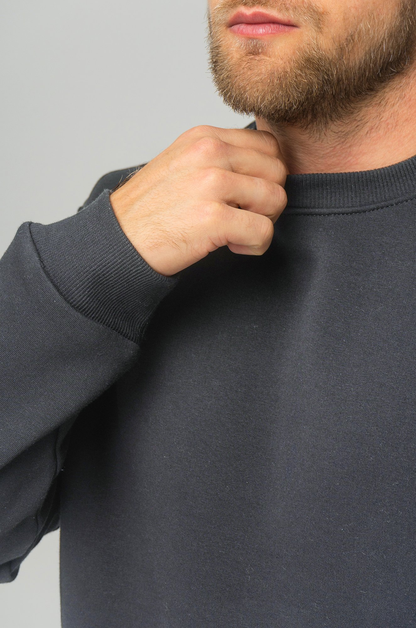 — однотонный темно-серый свитшот для мужчин выполнен из футера с начёсом;