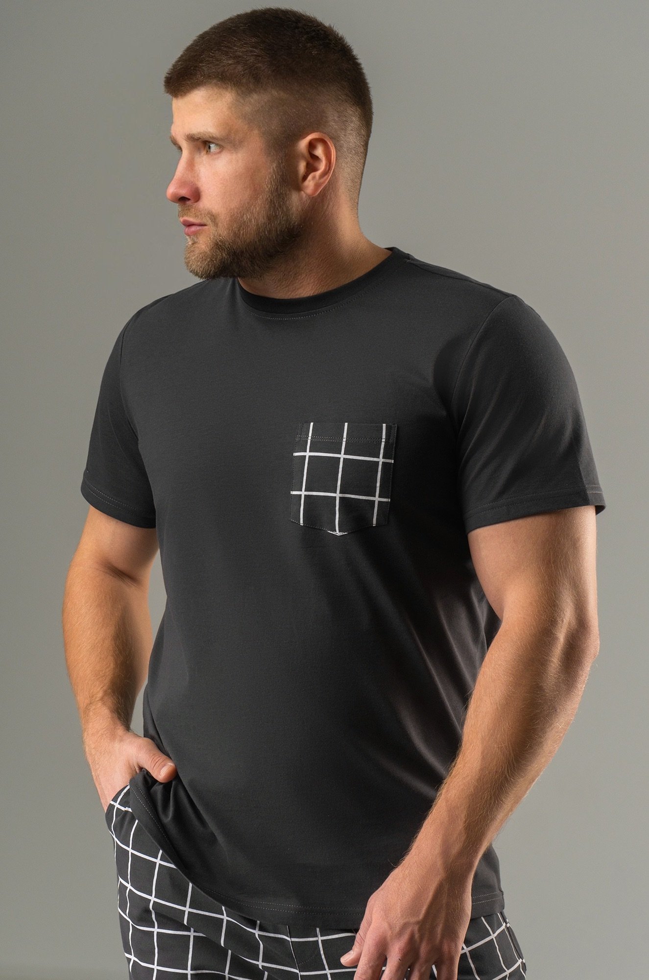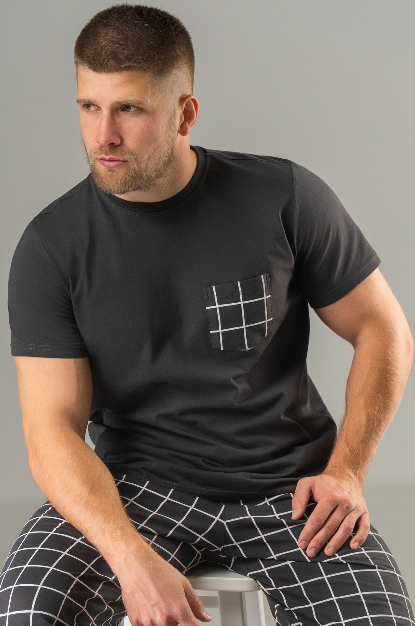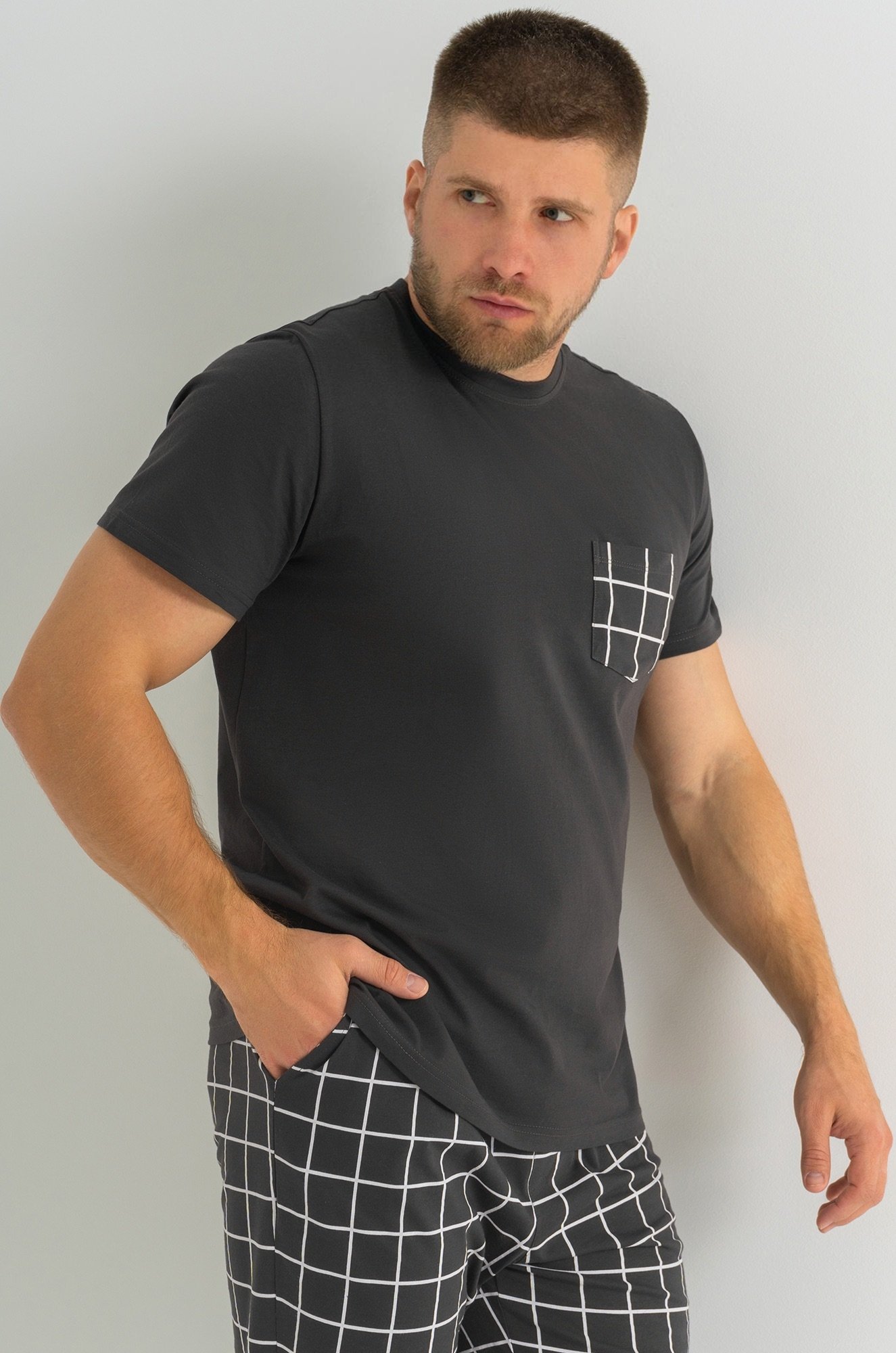 Мужская пижама с брюками выполнена из хлопкового трикотажа кулирная гладь. Удобный клетчатый костюм для дома, в который входят футболка с коротким рукавом и прямые брюки на эластичной резинке. На груди предусмотрен накладной карман.