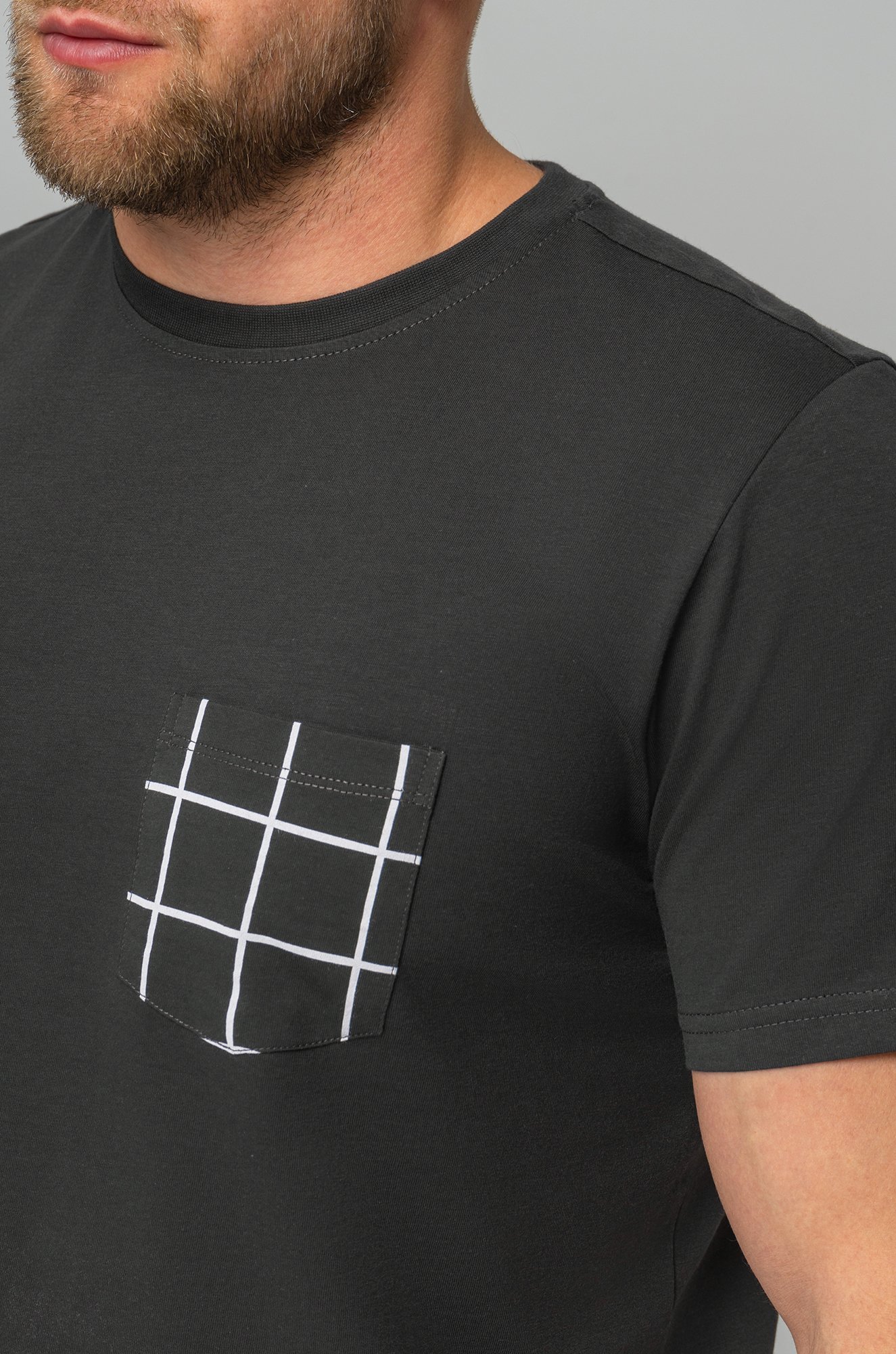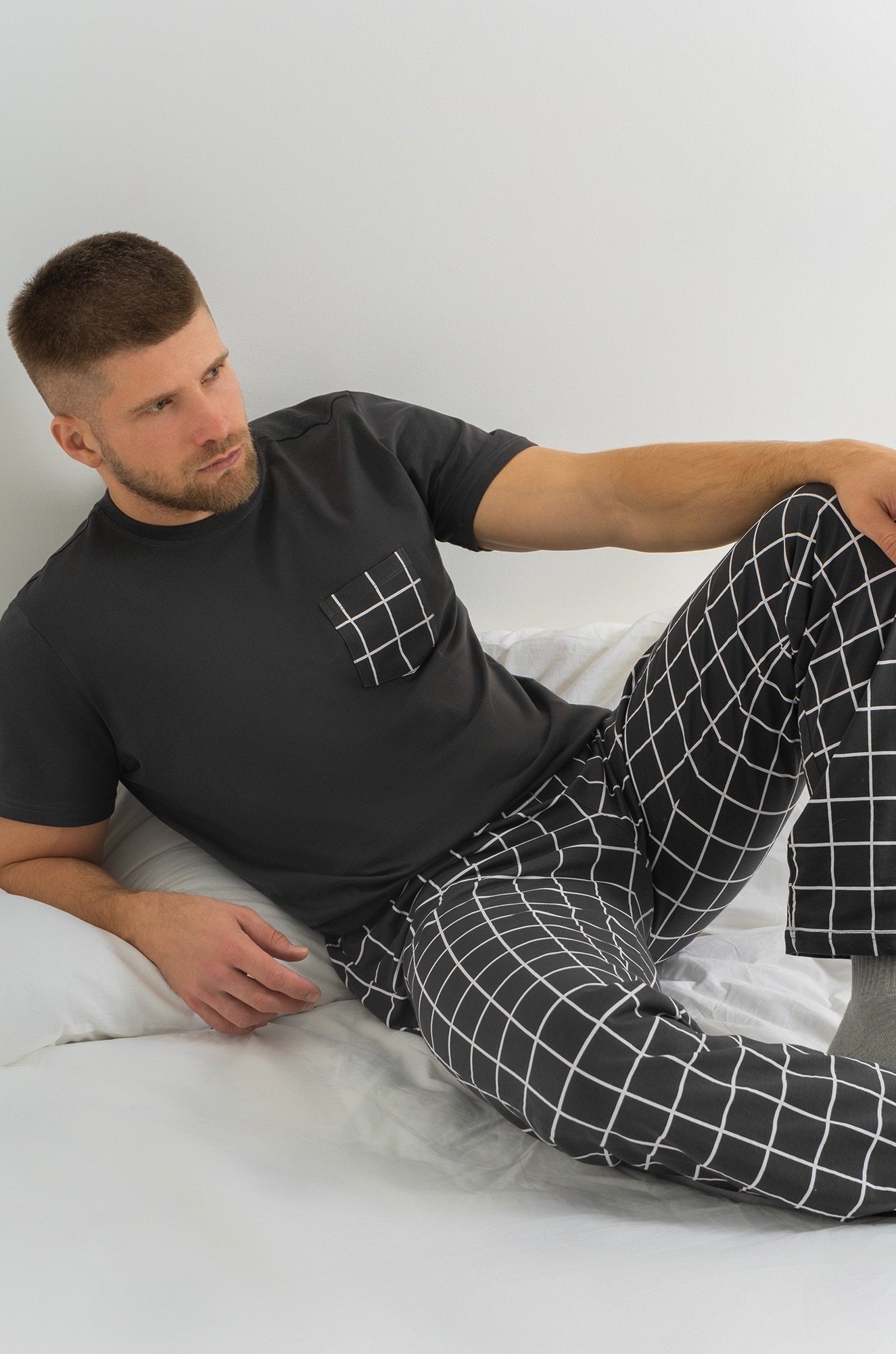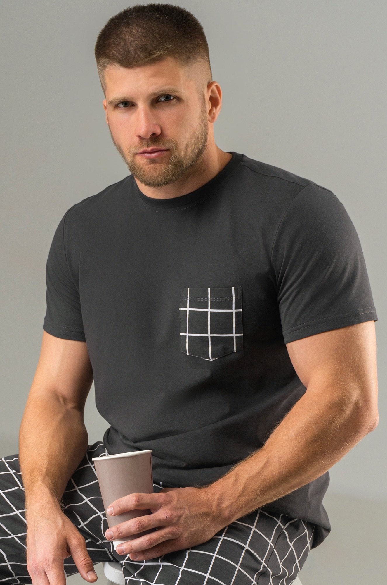 Мужская пижама с брюками выполнена из хлопкового трикотажа кулирная гладь. Удобный клетчатый костюм для дома, в который входят футболка с коротким рукавом и прямые брюки на эластичной резинке. На груди предусмотрен накладной карман.
