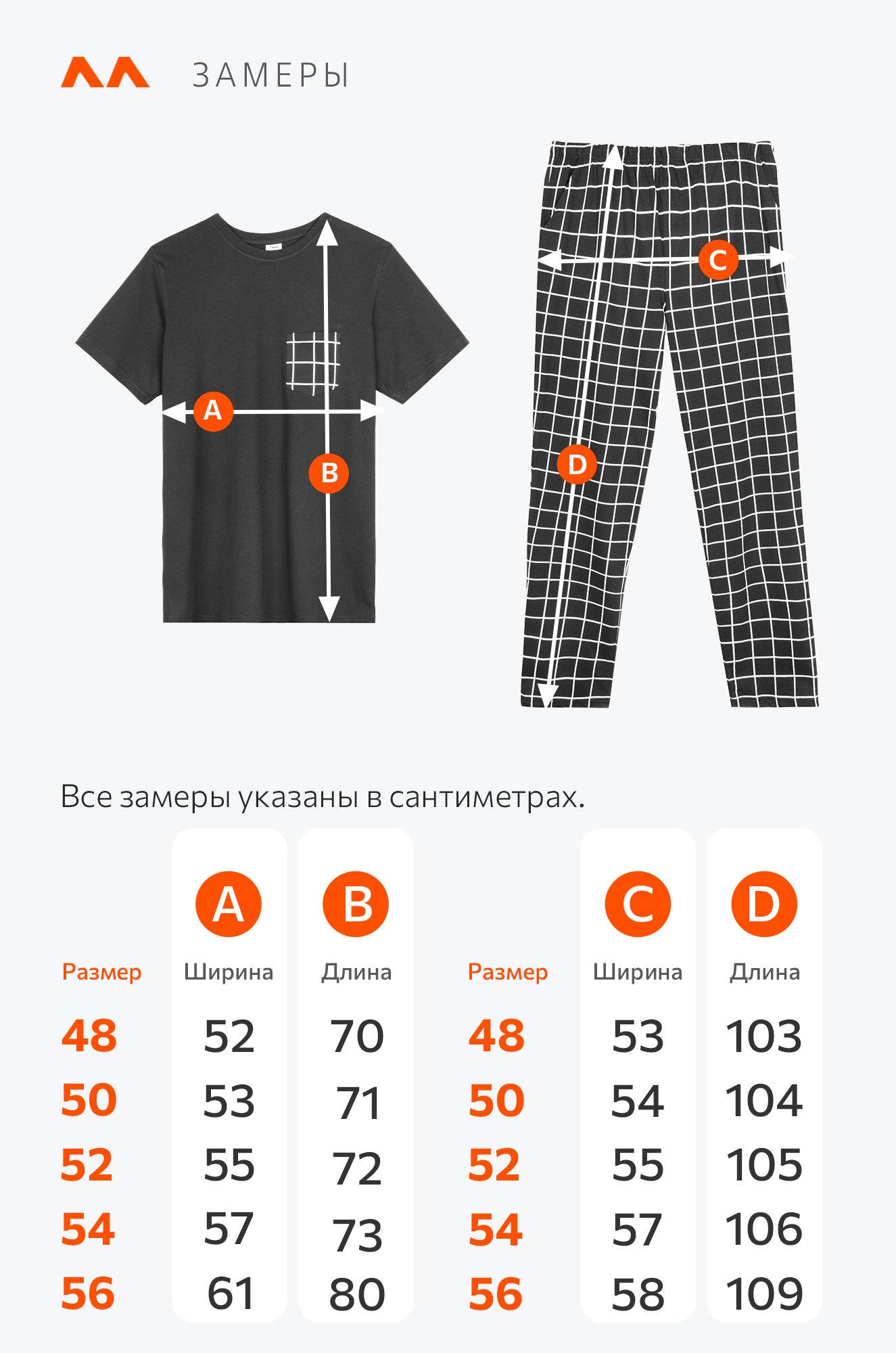 брюки: длина: 105 см; ширина по бедрам: 55 см.