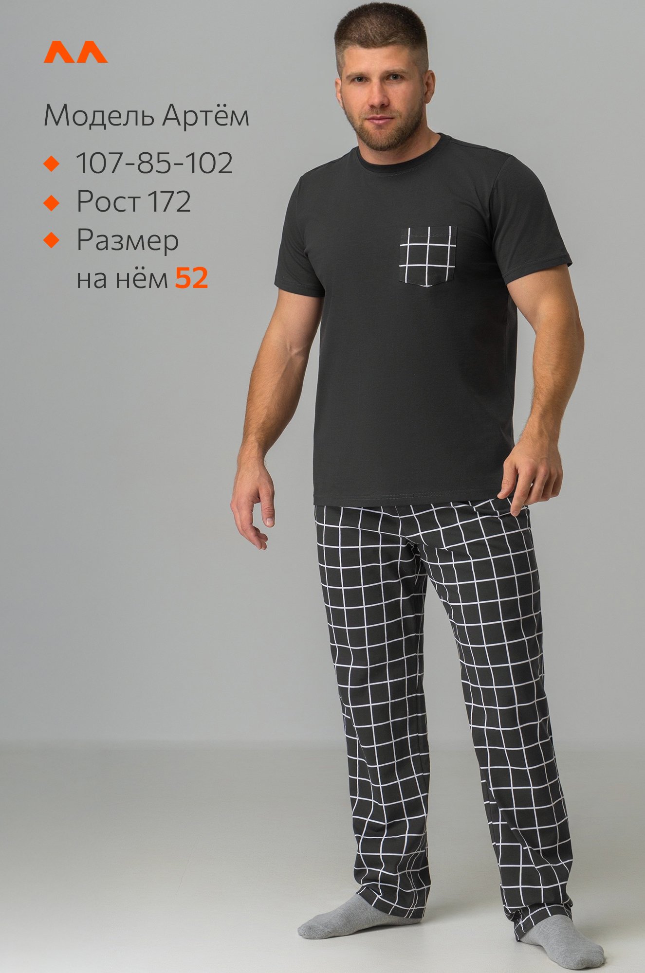 Модель Артем, рост 172 см, параметры 107-85-102 см. На нем размер 52.