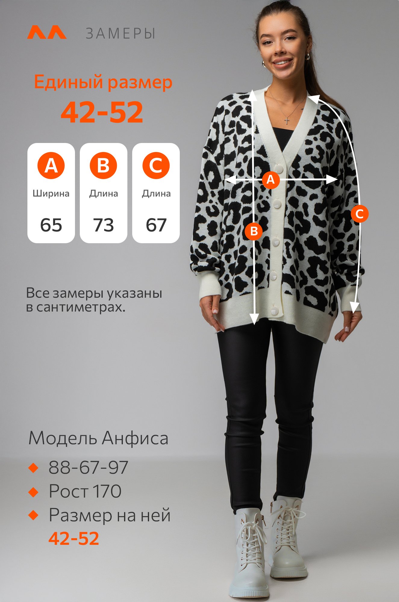 Модель Анфиса, рост 170 см, параметры 88-67-97 см. На ней кардиган единого размера 42-52.