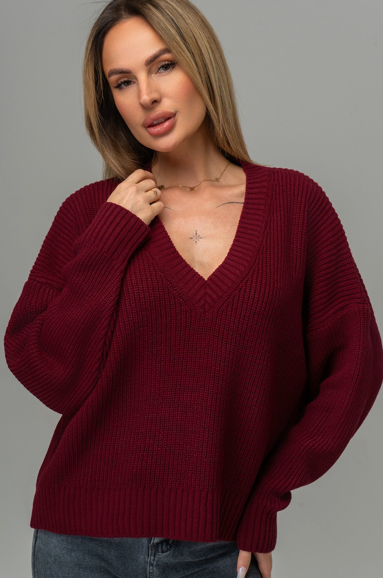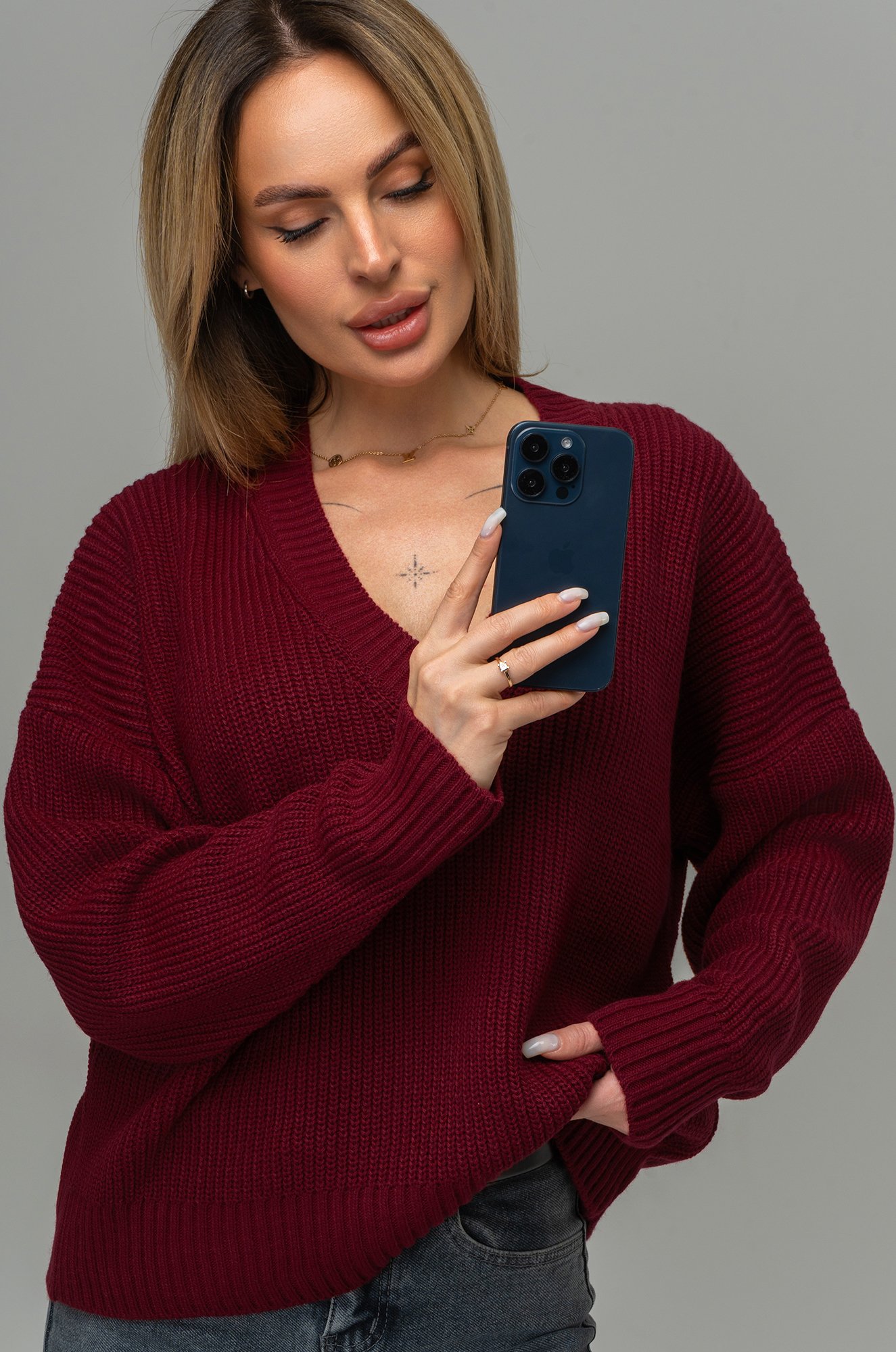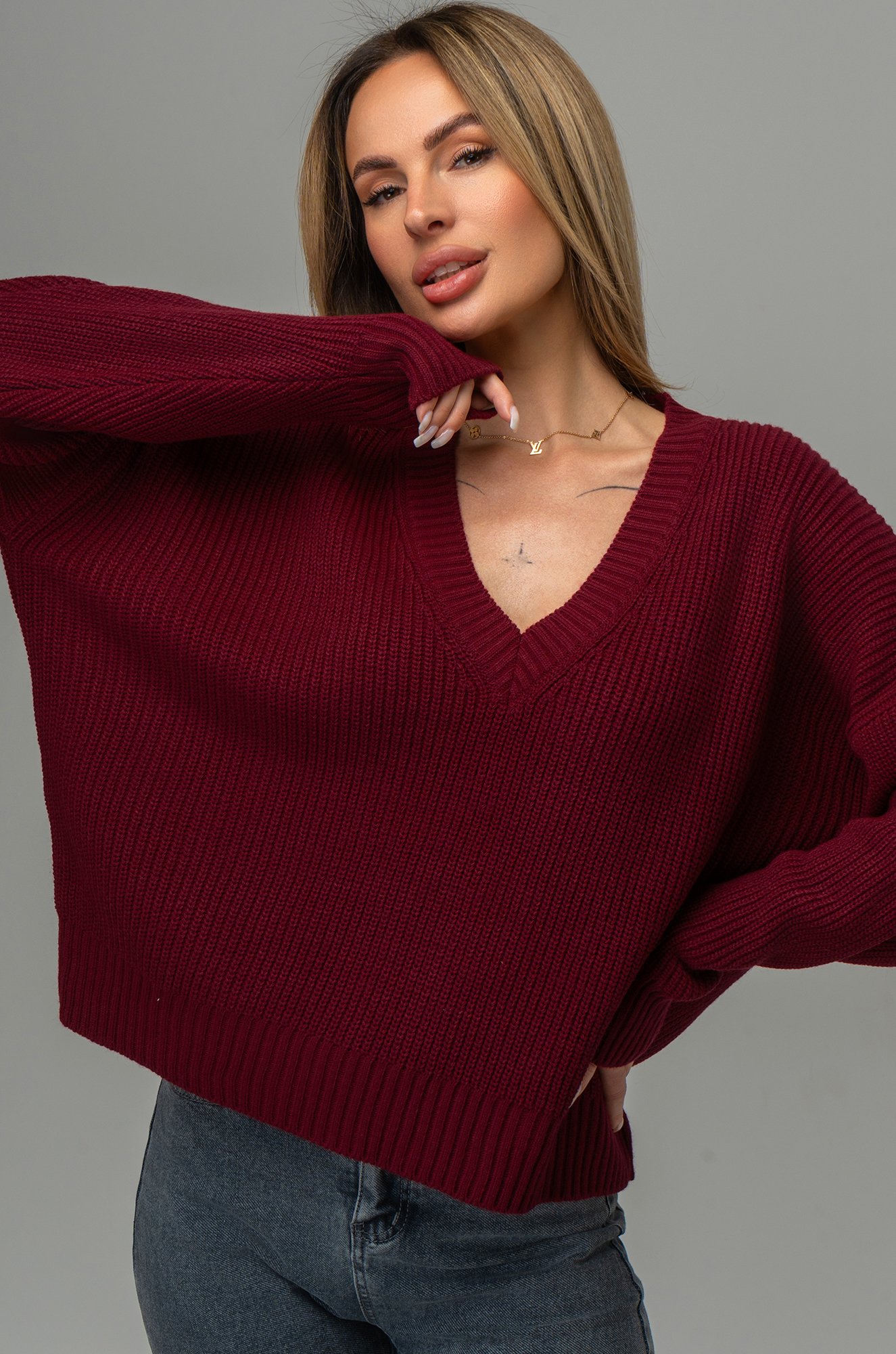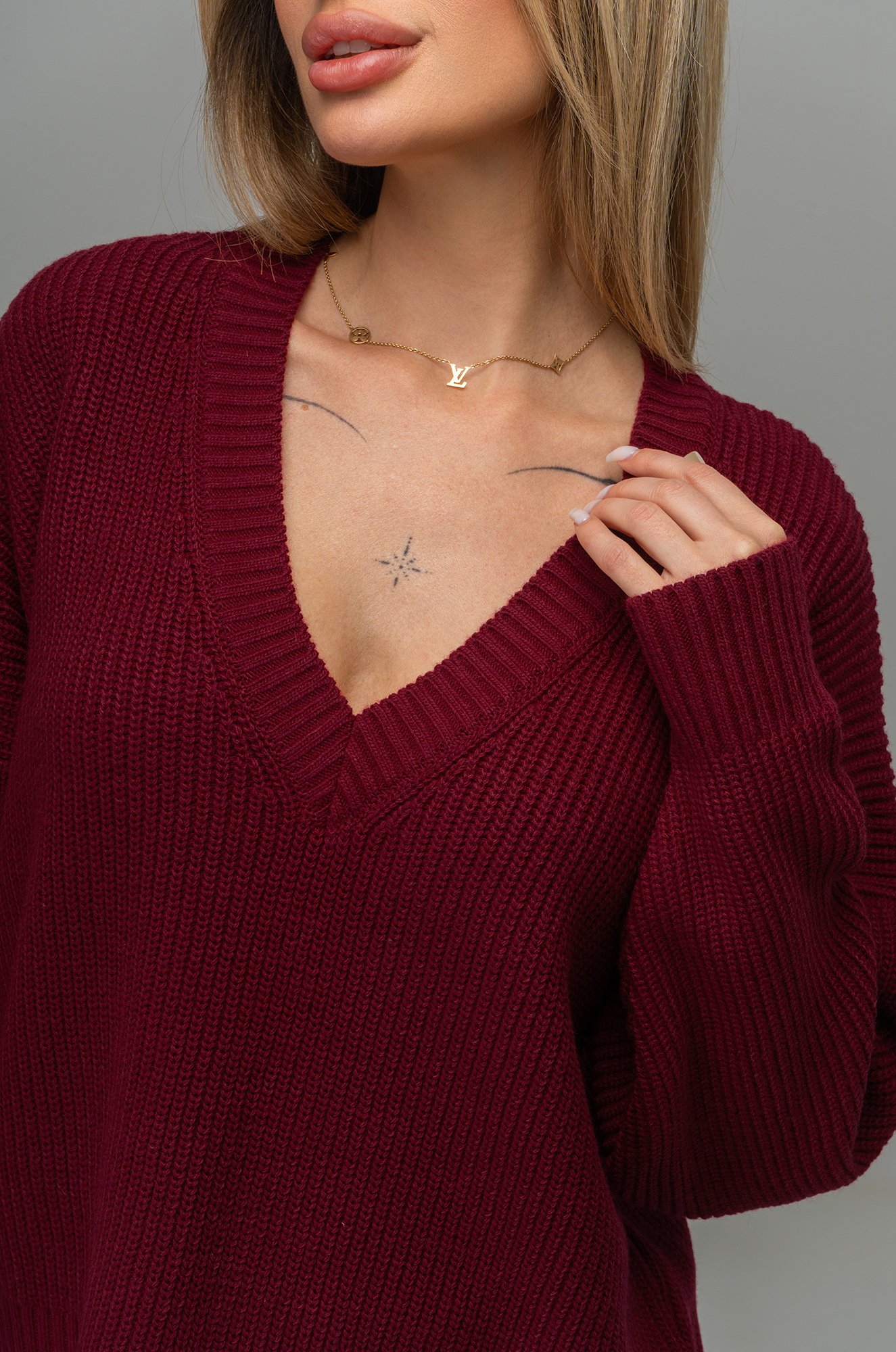 Окутывающий нежностью и заботой женский джемпер оверсайз выполнен из вязаного трикотажа. Волнующий V-образный вырез изящно открывает зону декольте и делает образ интригующим. Объемный свитер оттенка бургунди для женщин станет идеальной основой для уютных многослойных образов в зимние и осенние дни!