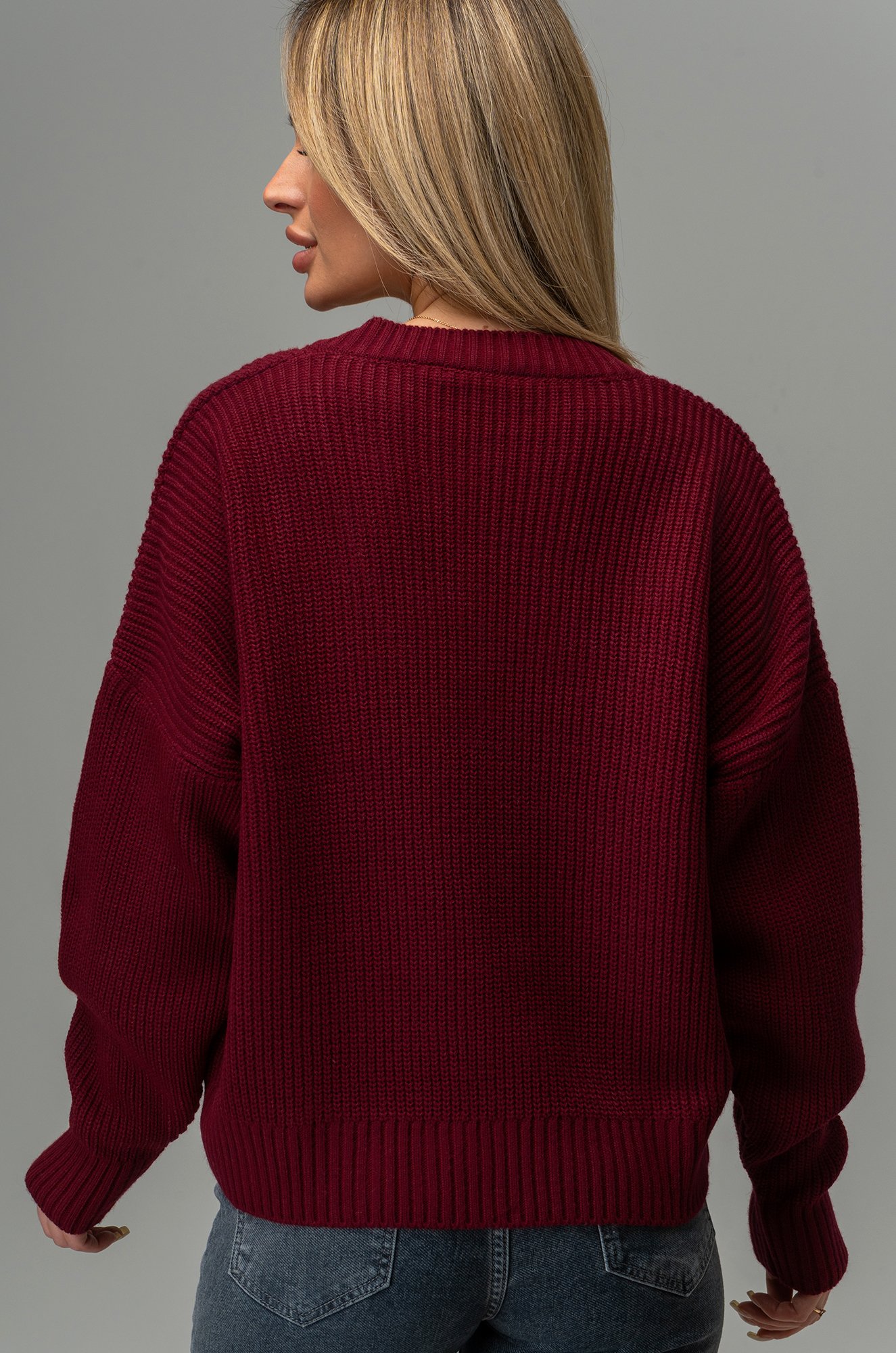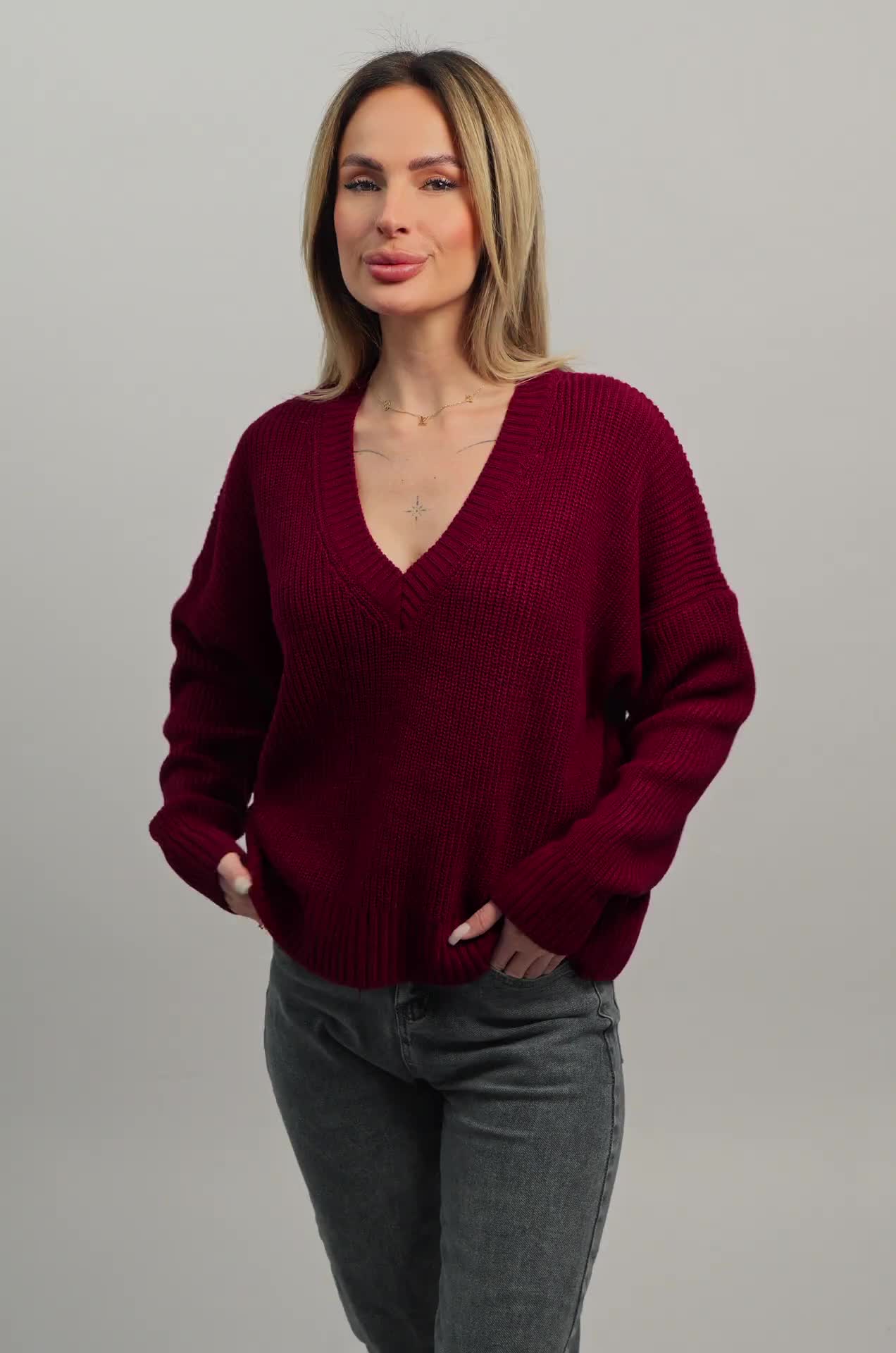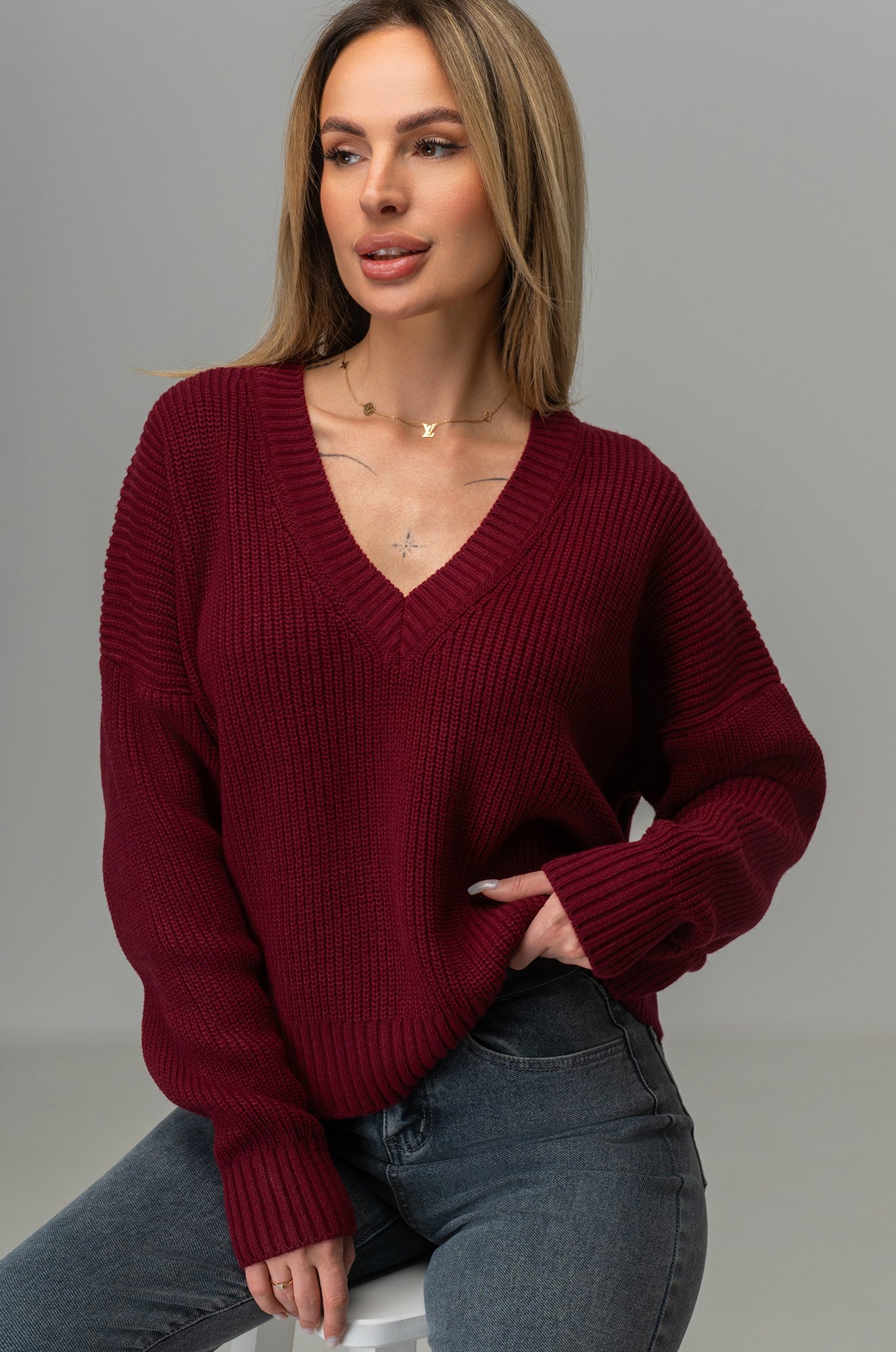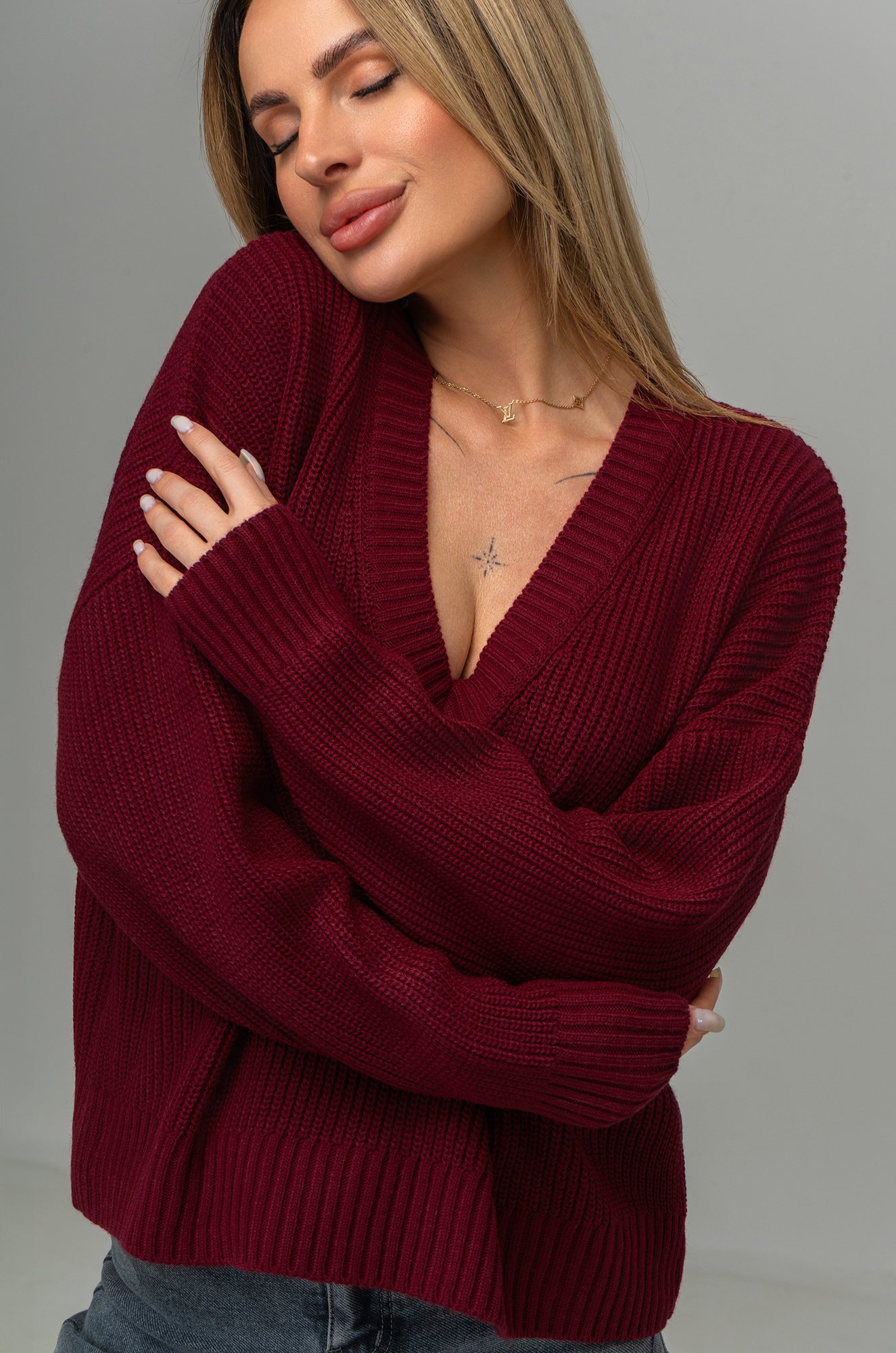 Окутывающий нежностью и заботой женский джемпер оверсайз выполнен из вязаного трикотажа. Волнующий V-образный вырез изящно открывает зону декольте и делает образ интригующим. Объемный свитер оттенка бургунди для женщин станет идеальной основой для уютных многослойных образов в зимние и осенние дни!