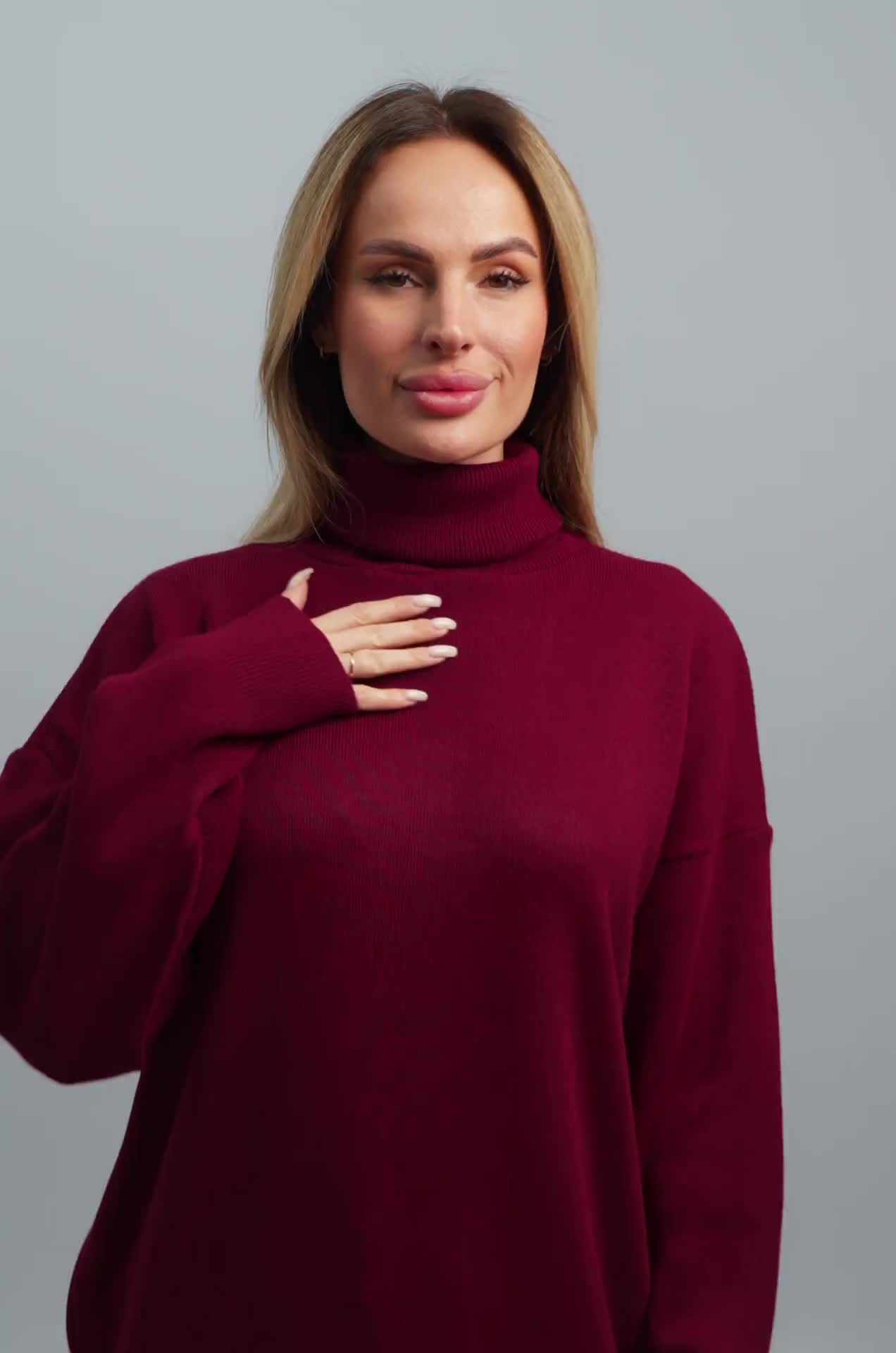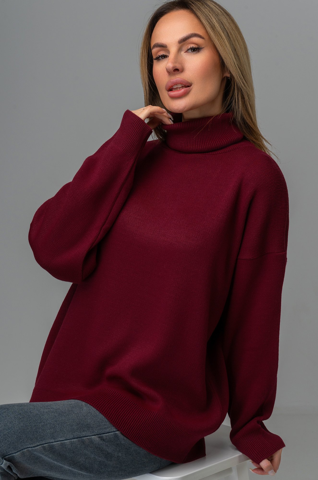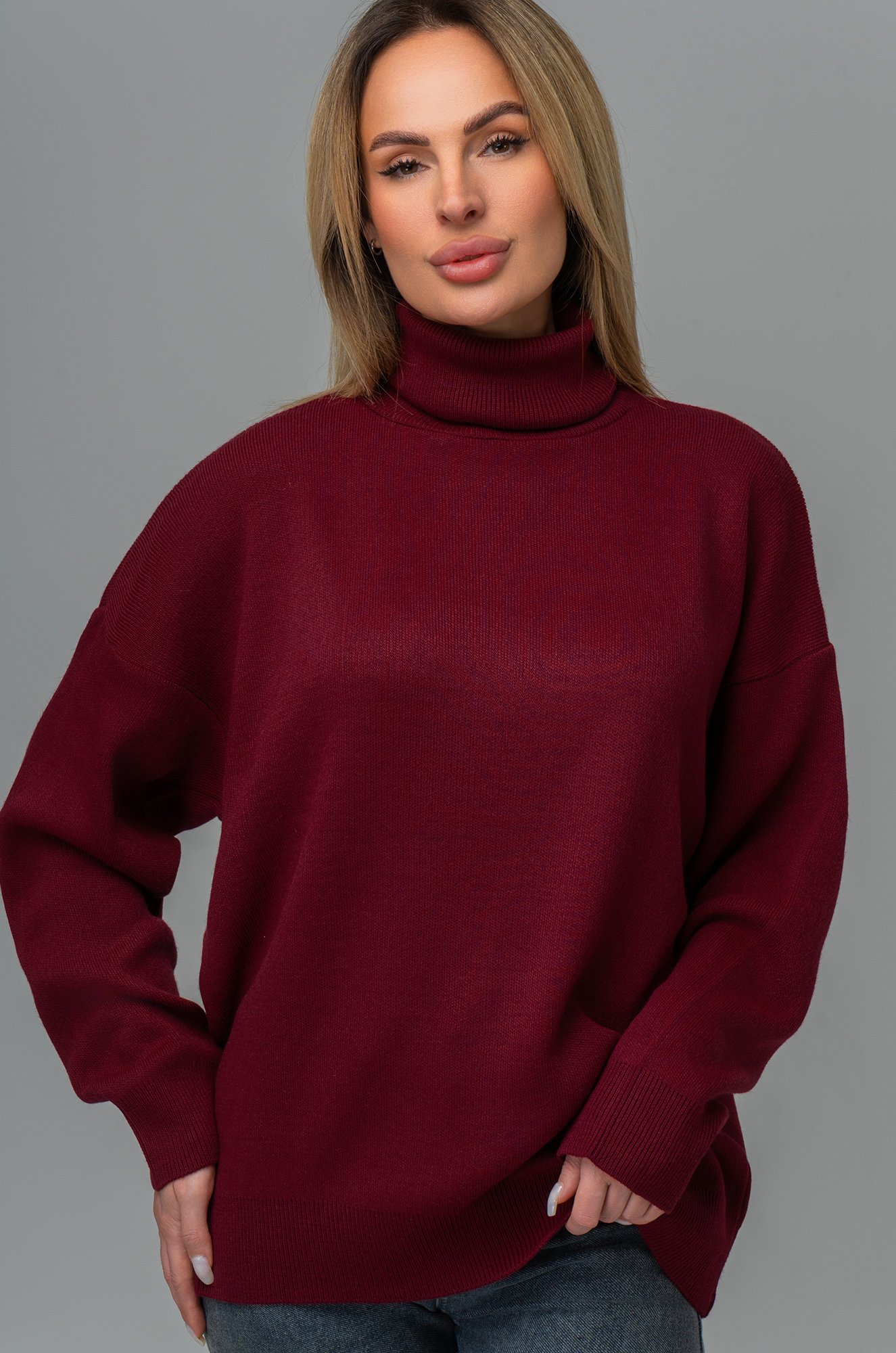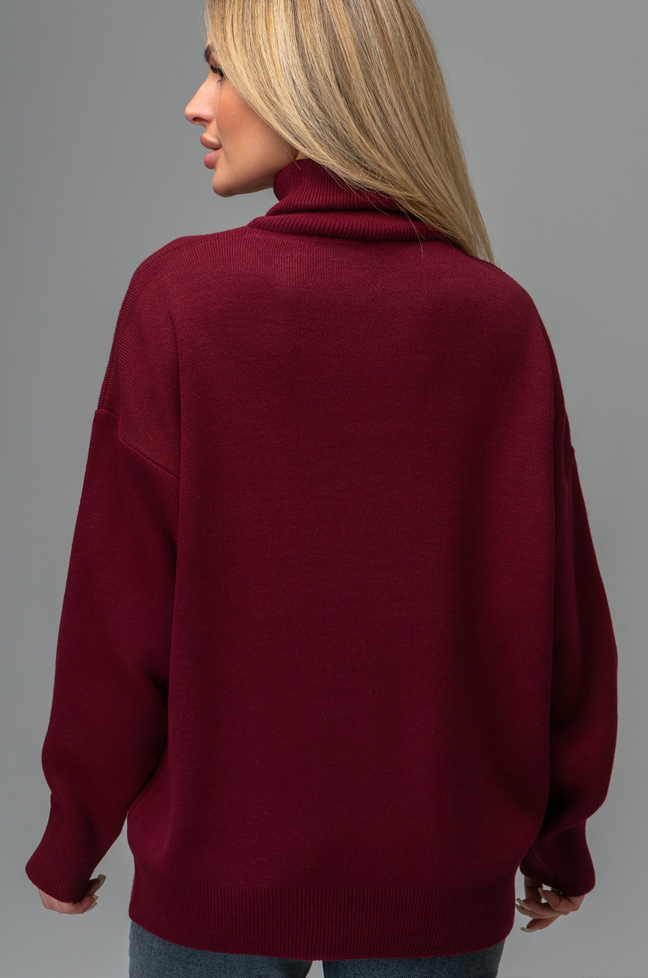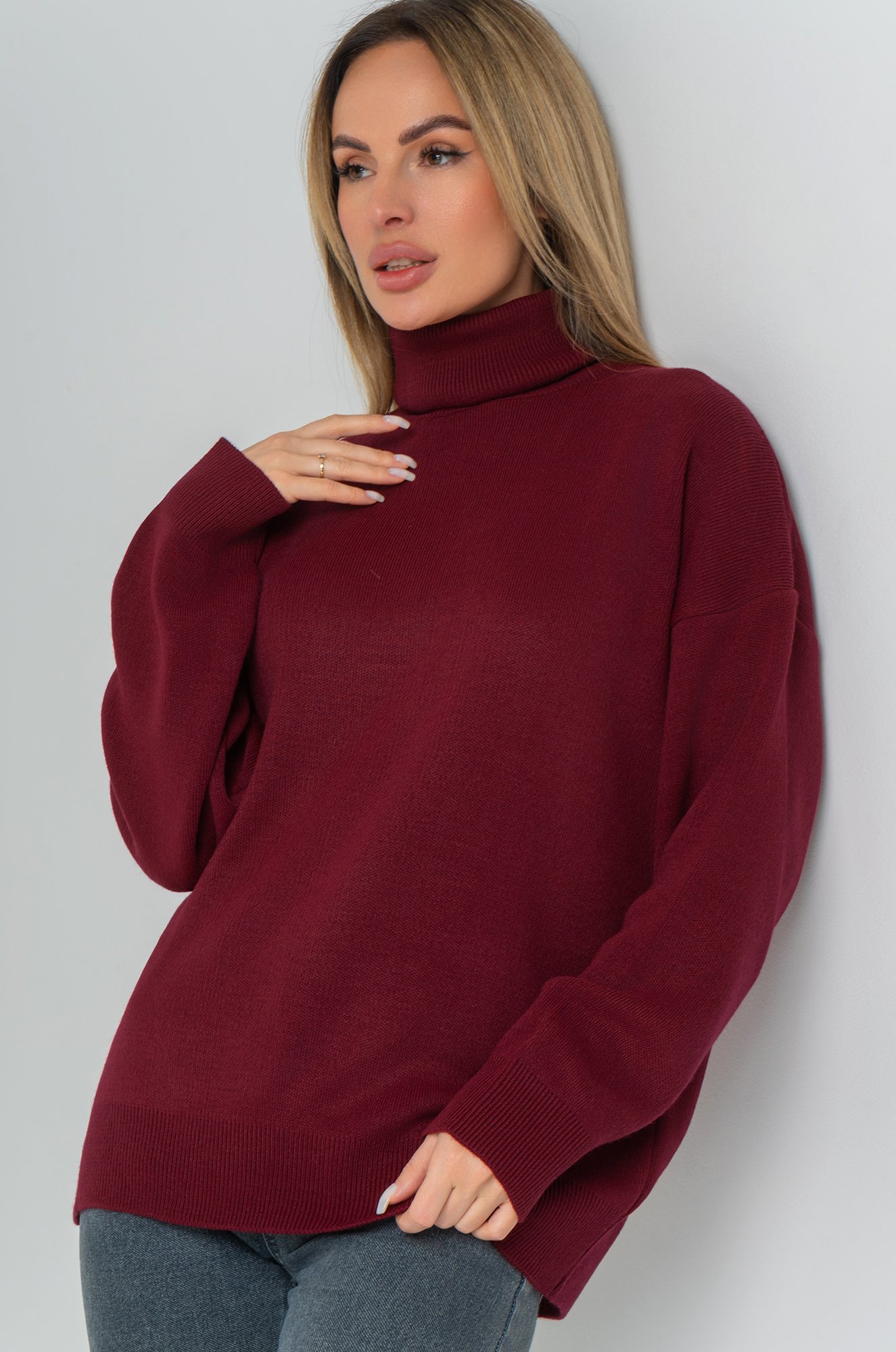 Длинный бордовый джемпер с горлом отлично впишется в повседневные осенние или зимние образы. Однотонный свитер оттенка марсала для женщин отлично подходит для прогулок осенью, для повседневных образов в офис.