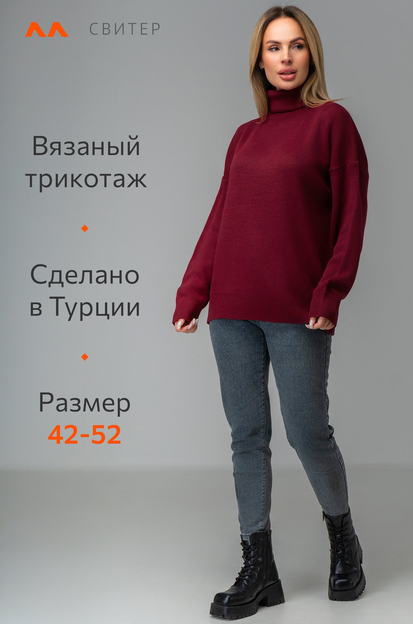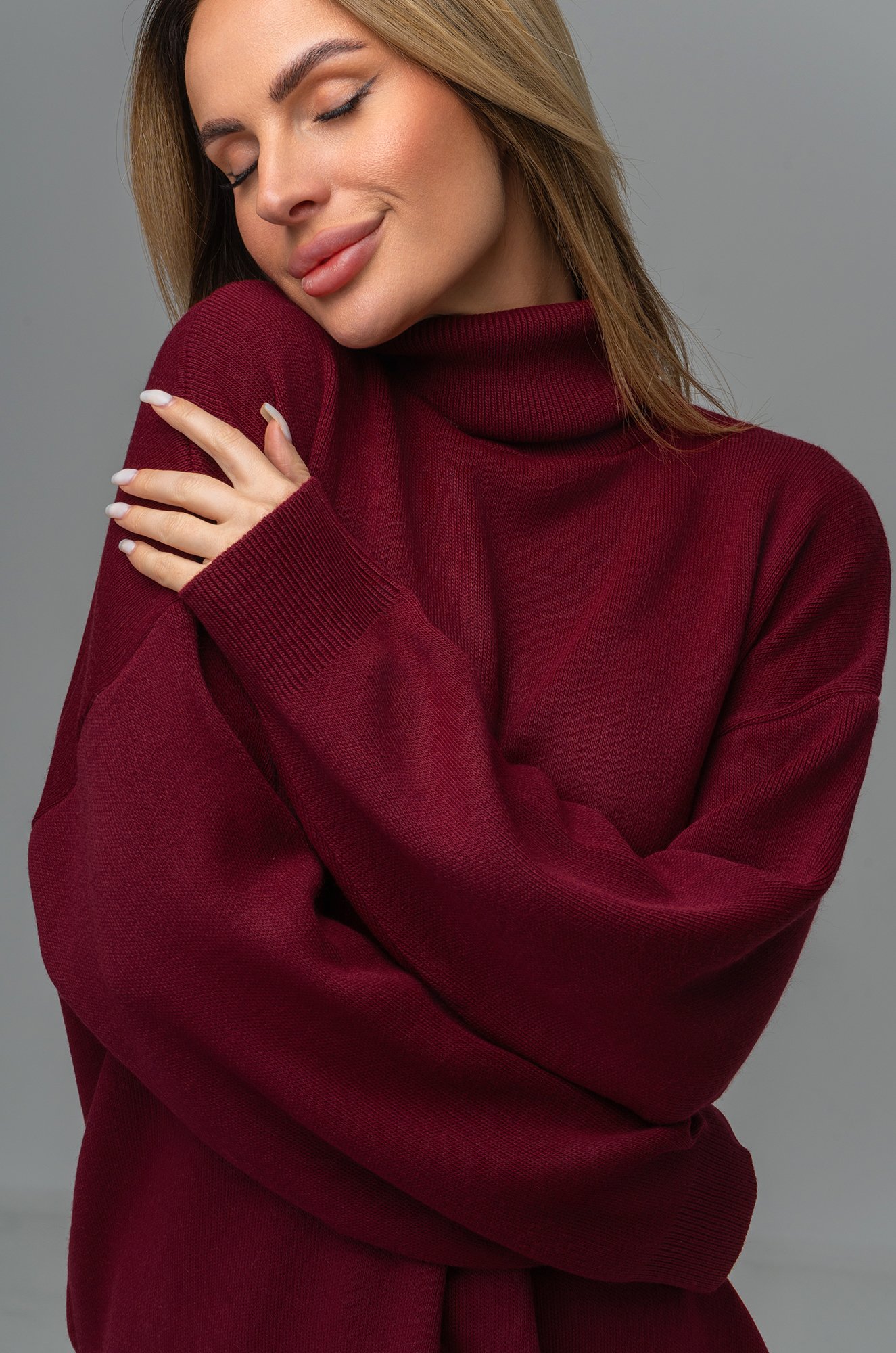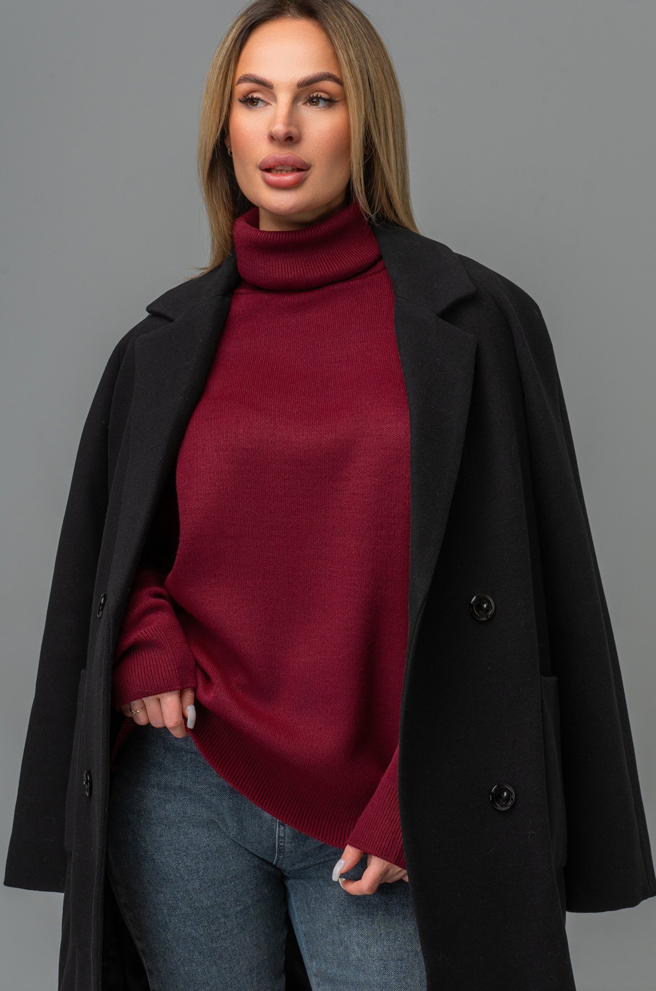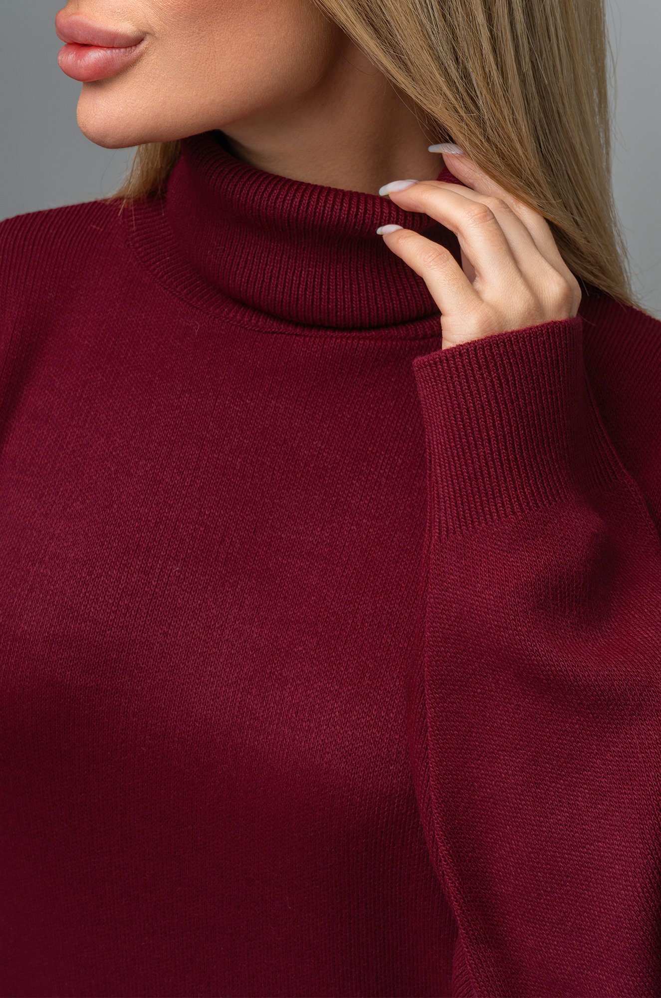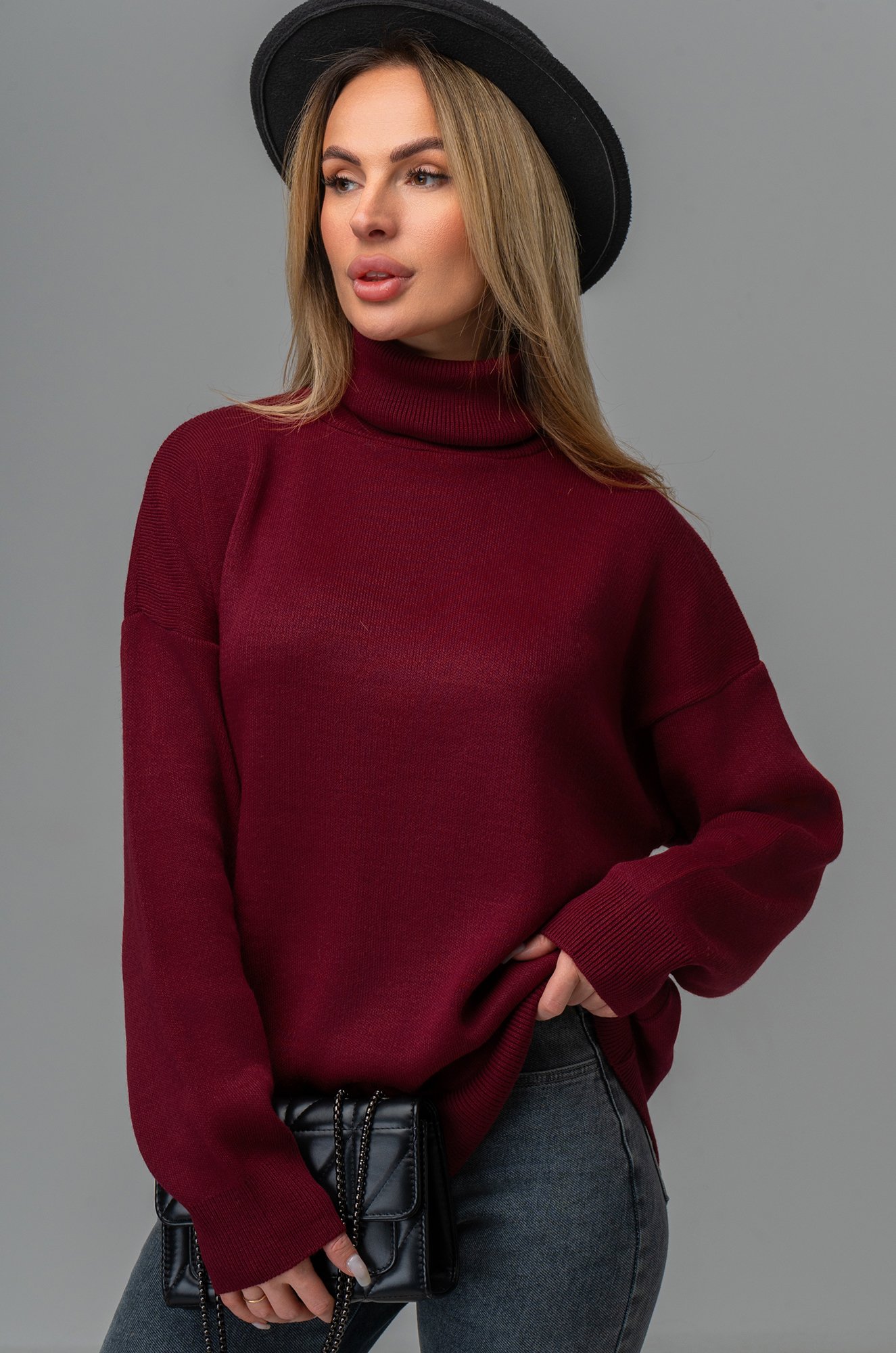 Длинный бордовый джемпер с горлом отлично впишется в повседневные осенние или зимние образы. Однотонный свитер оттенка марсала для женщин отлично подходит для прогулок осенью, для повседневных образов в офис.