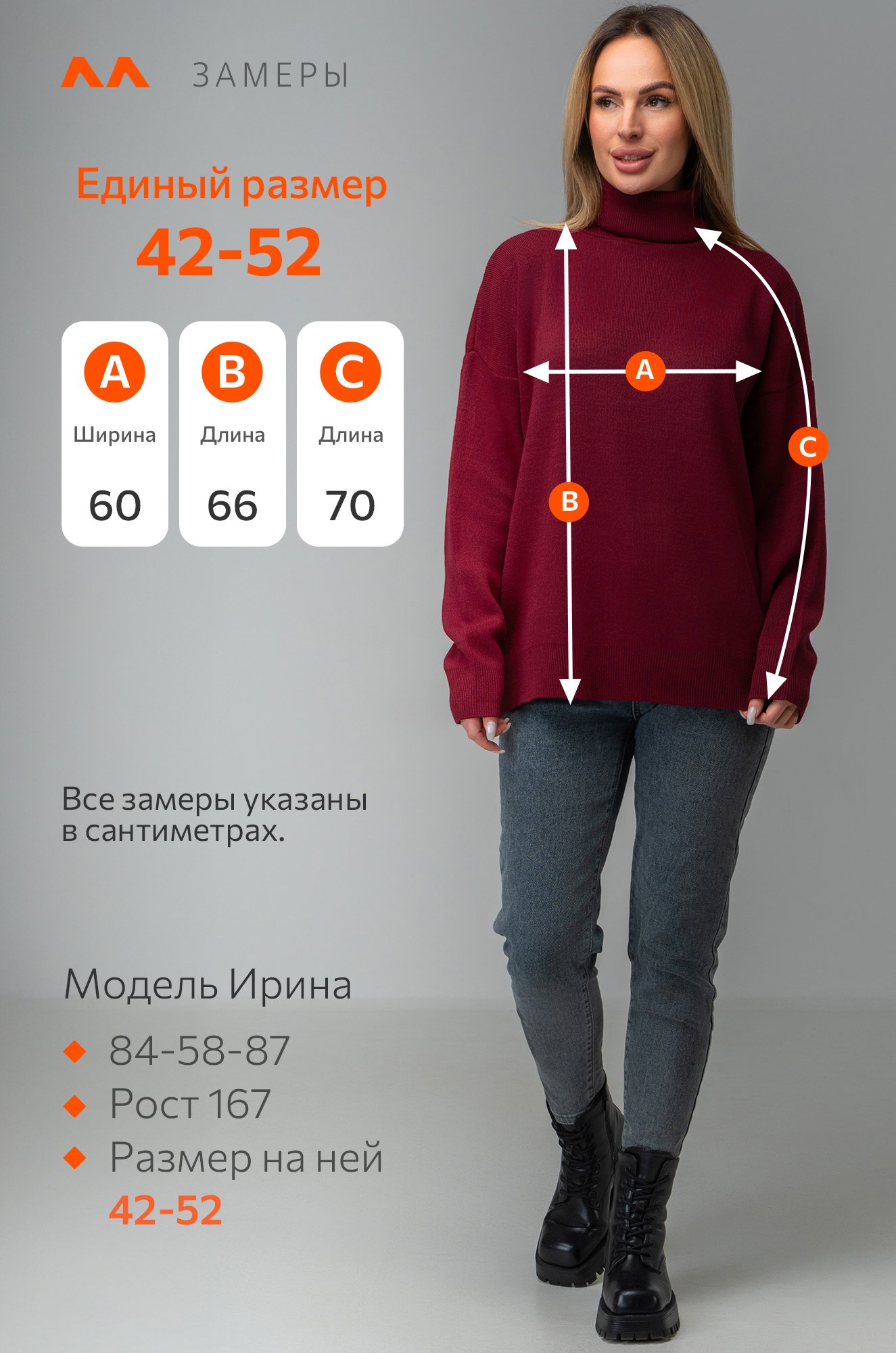 Модель Ирина, ее рост 167, параметры: 84-58-87. На ней свитер единого размера (onesize) 42-52.