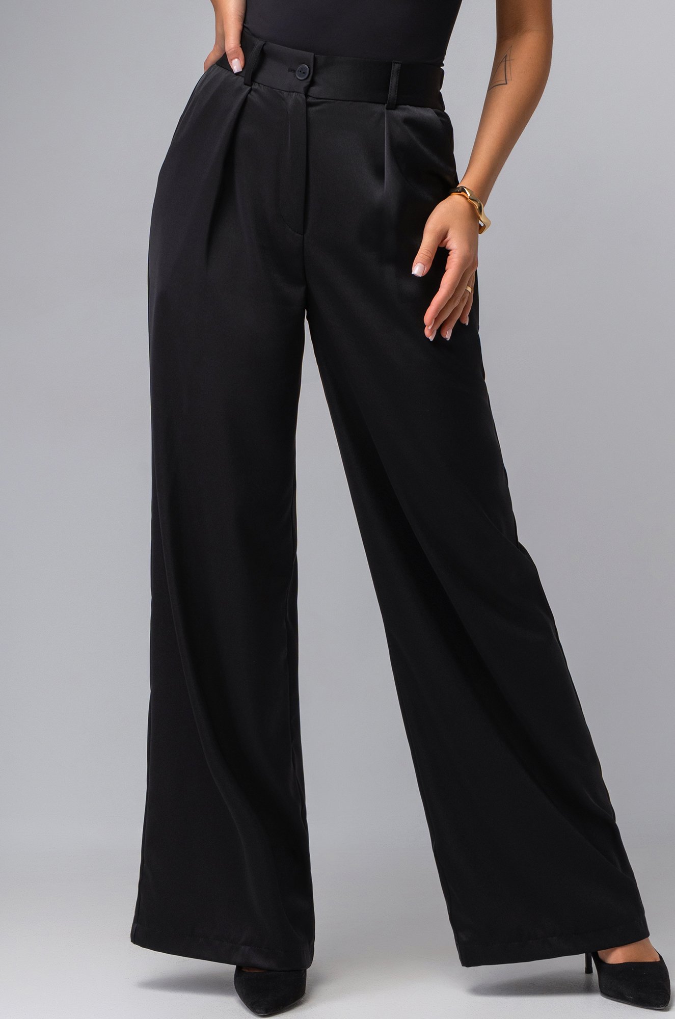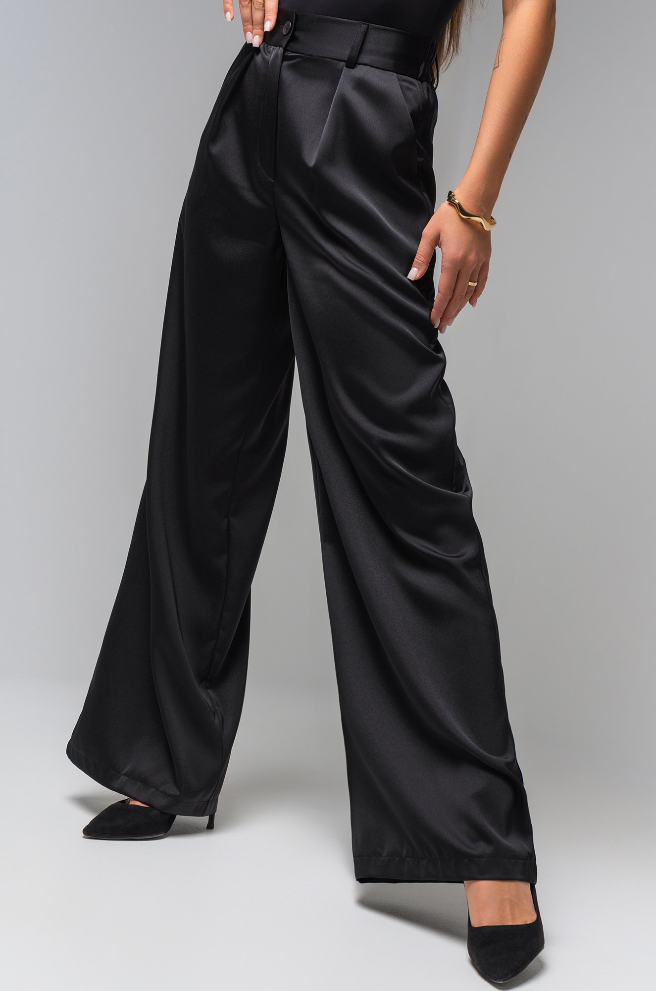 Широкие черные брюки выполнены из японского шелка. Его мягкость и легкость подарит невероятный комфорт и изысканность. За счет особого плетения поверхность блестящая, мягкие струящиеся складки красиво переливаются на свету.