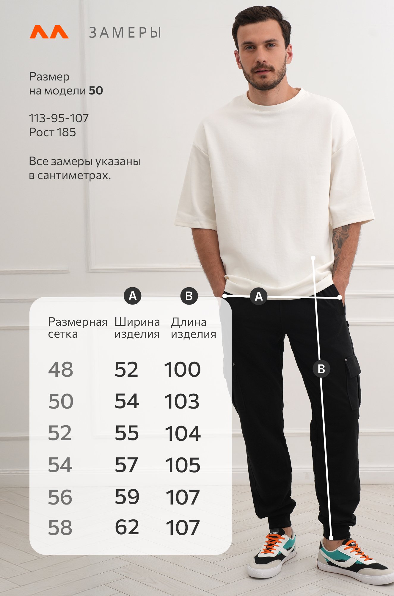 Модель Артем, рост 172 см, параметры 113-82-100 см. На нем размер 50.