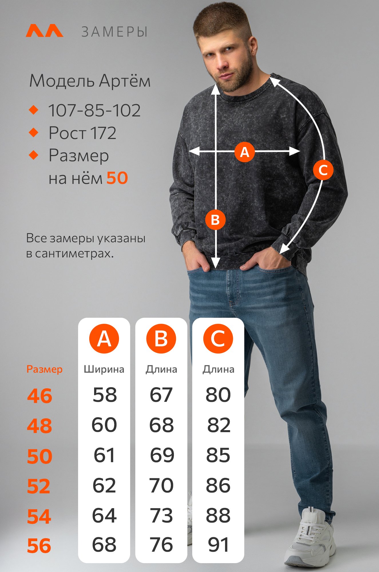 Модель Артем, рост 172 см, параметры 107-85-102 см. На нем размер 50.