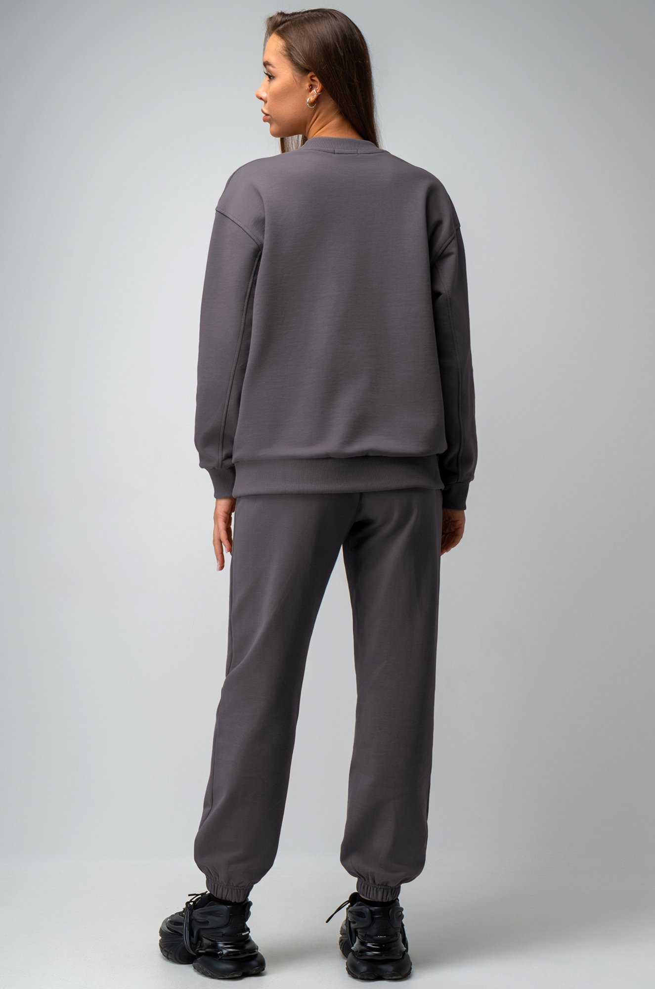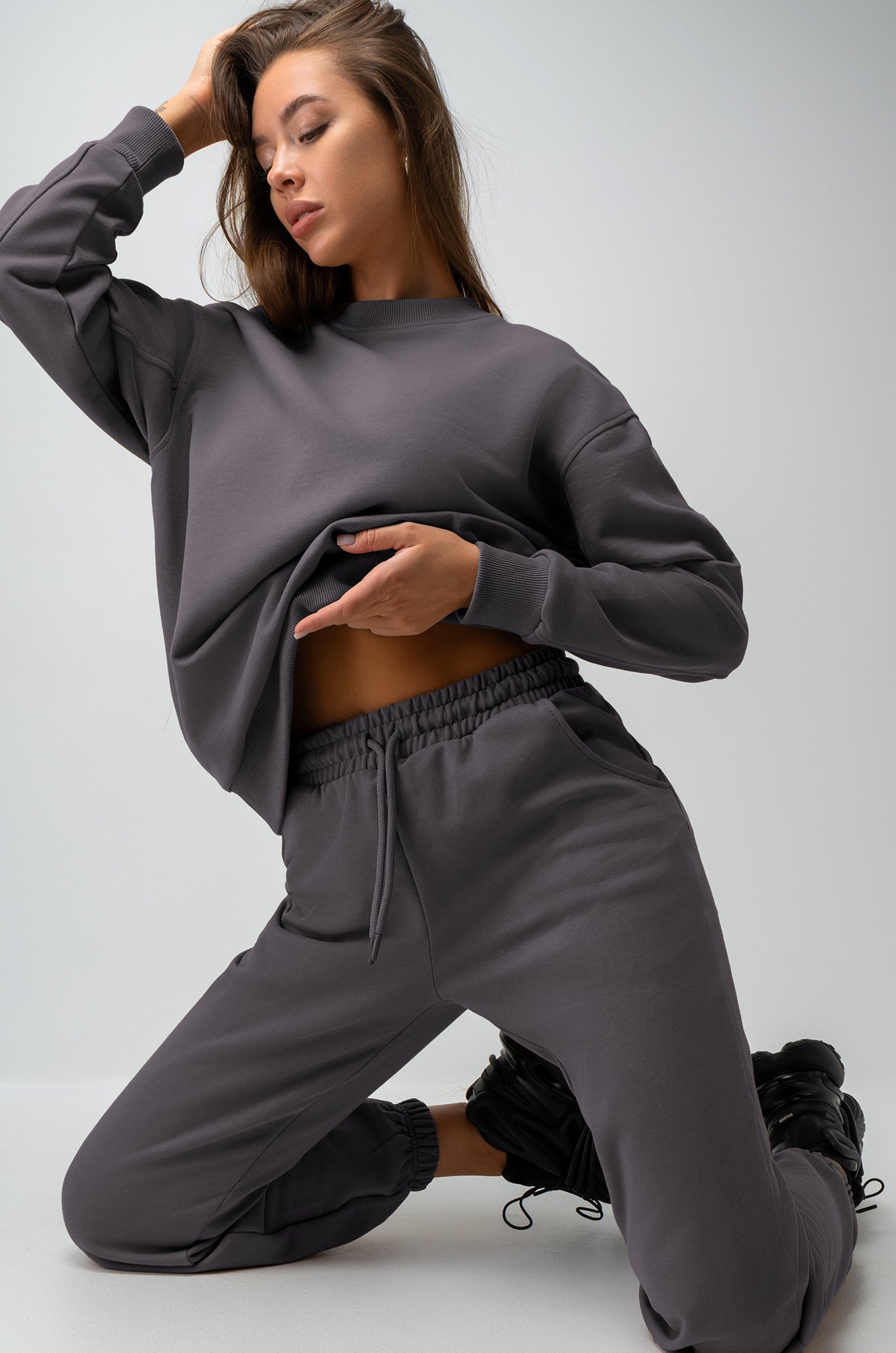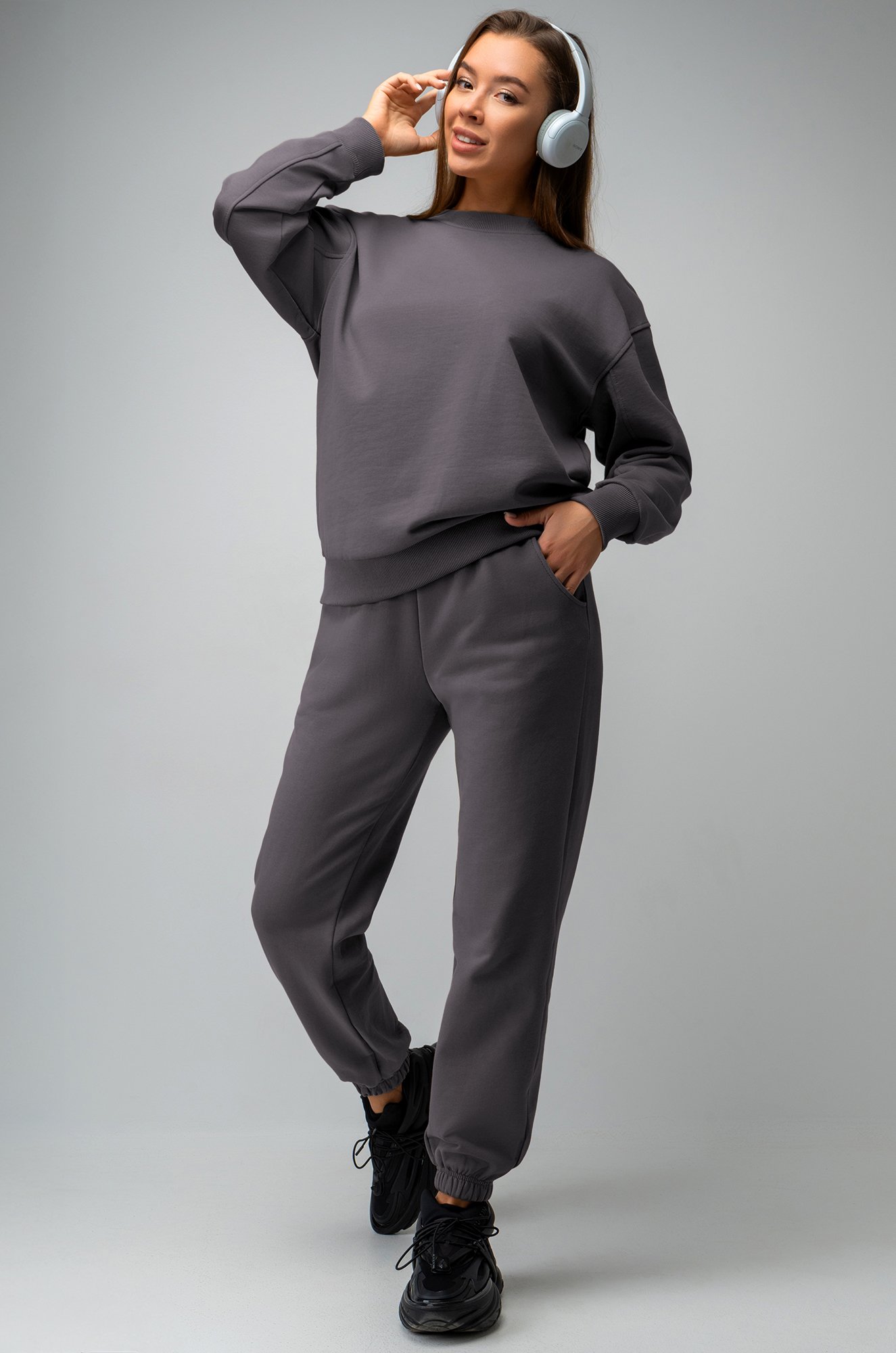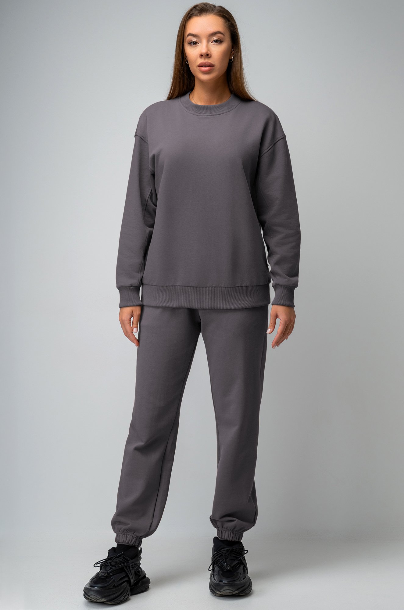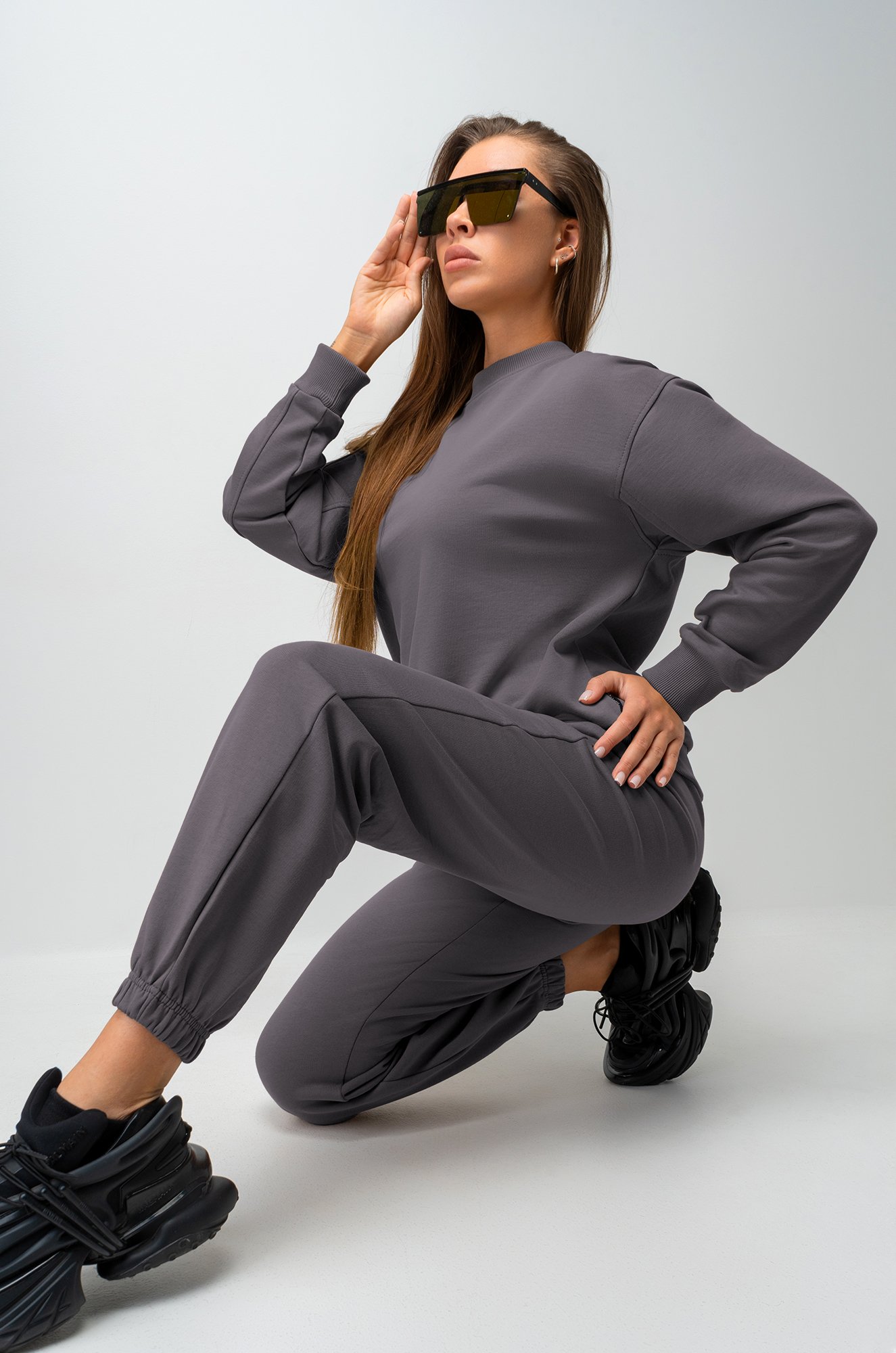 Женский спортивный костюм оверсайз станет надежным спутником на тренировках и в повседневной жизни. Демисезонный костюм двойка графитового цвета состоит из толстовки и брюк.