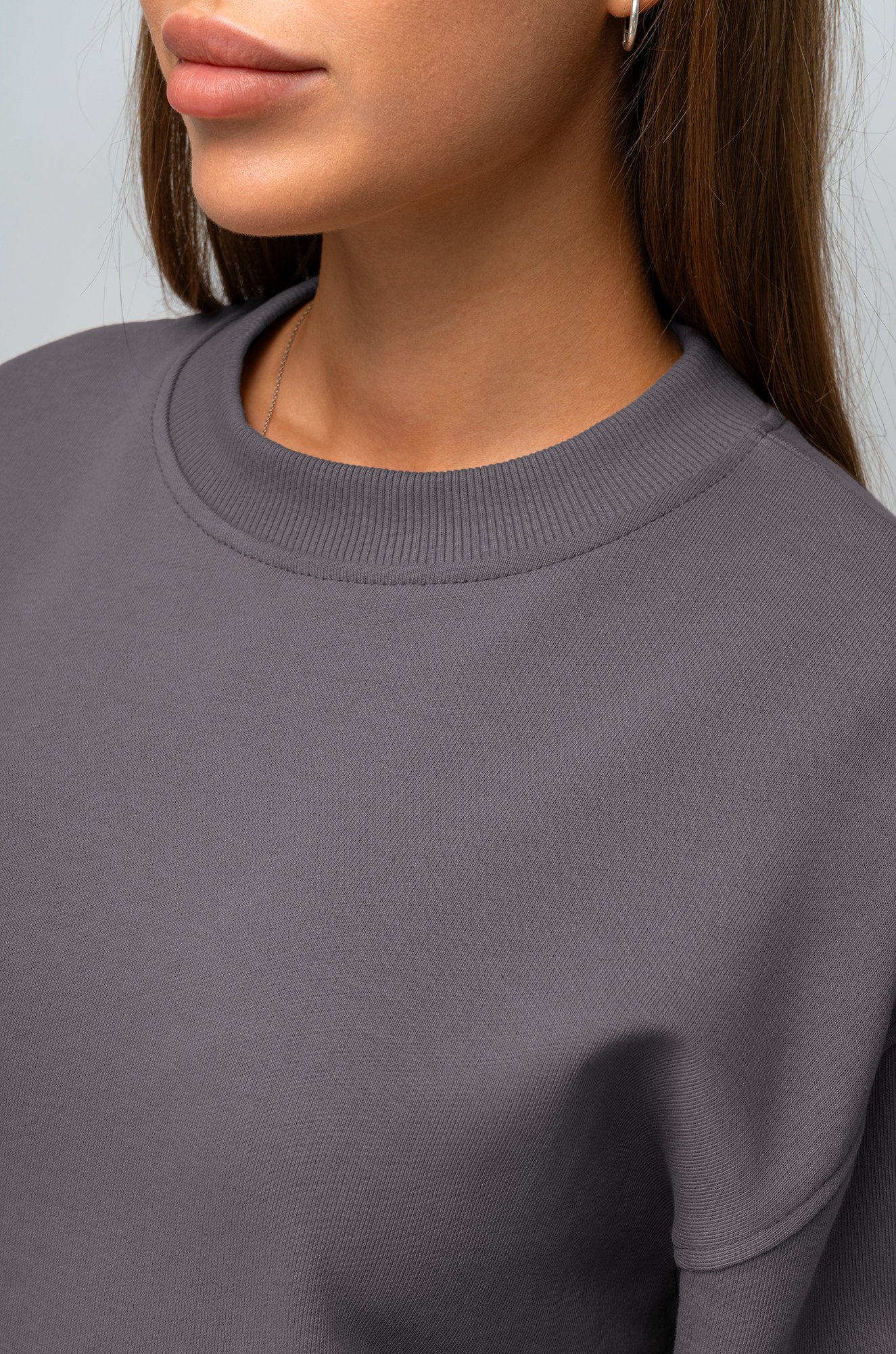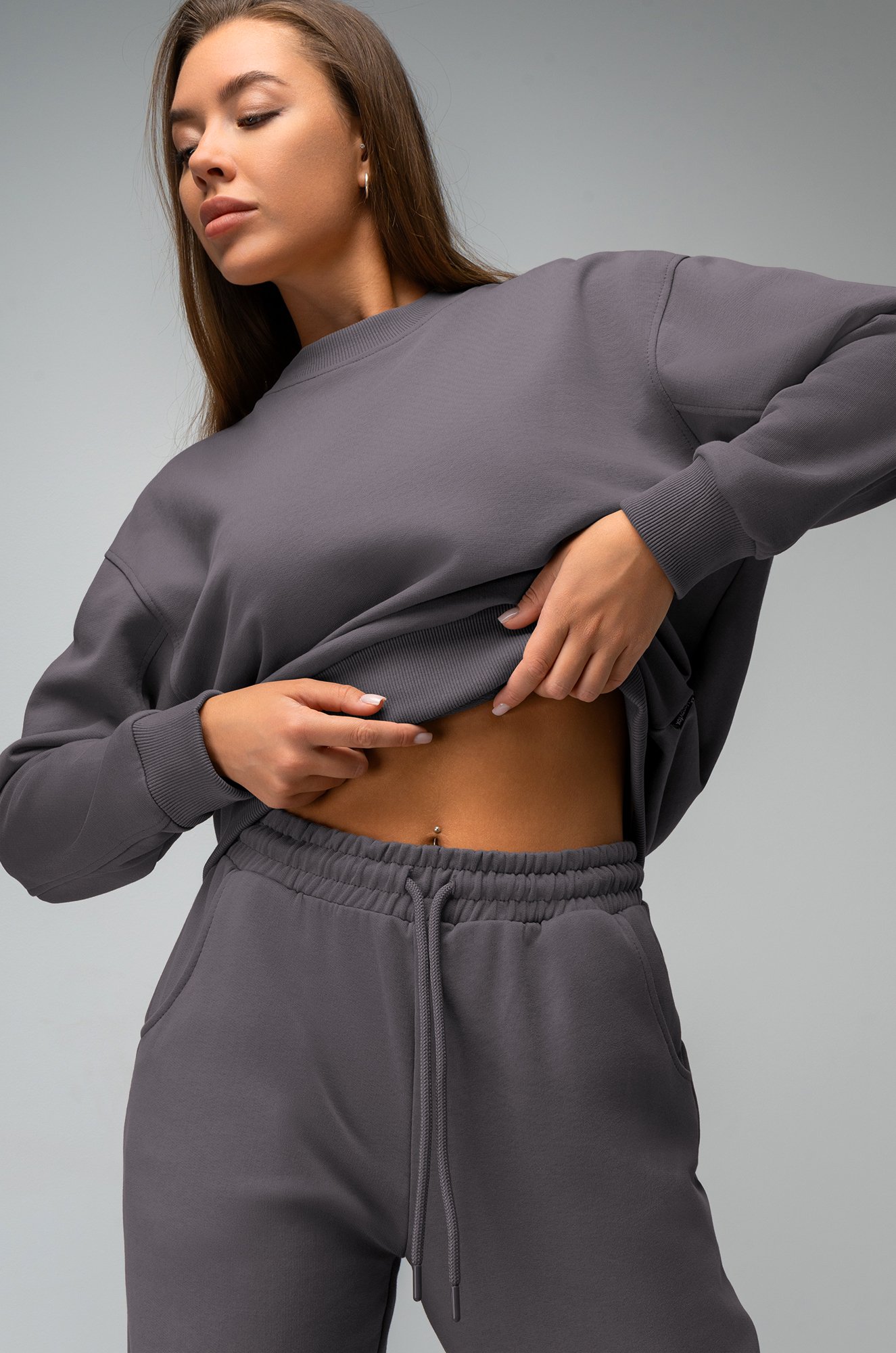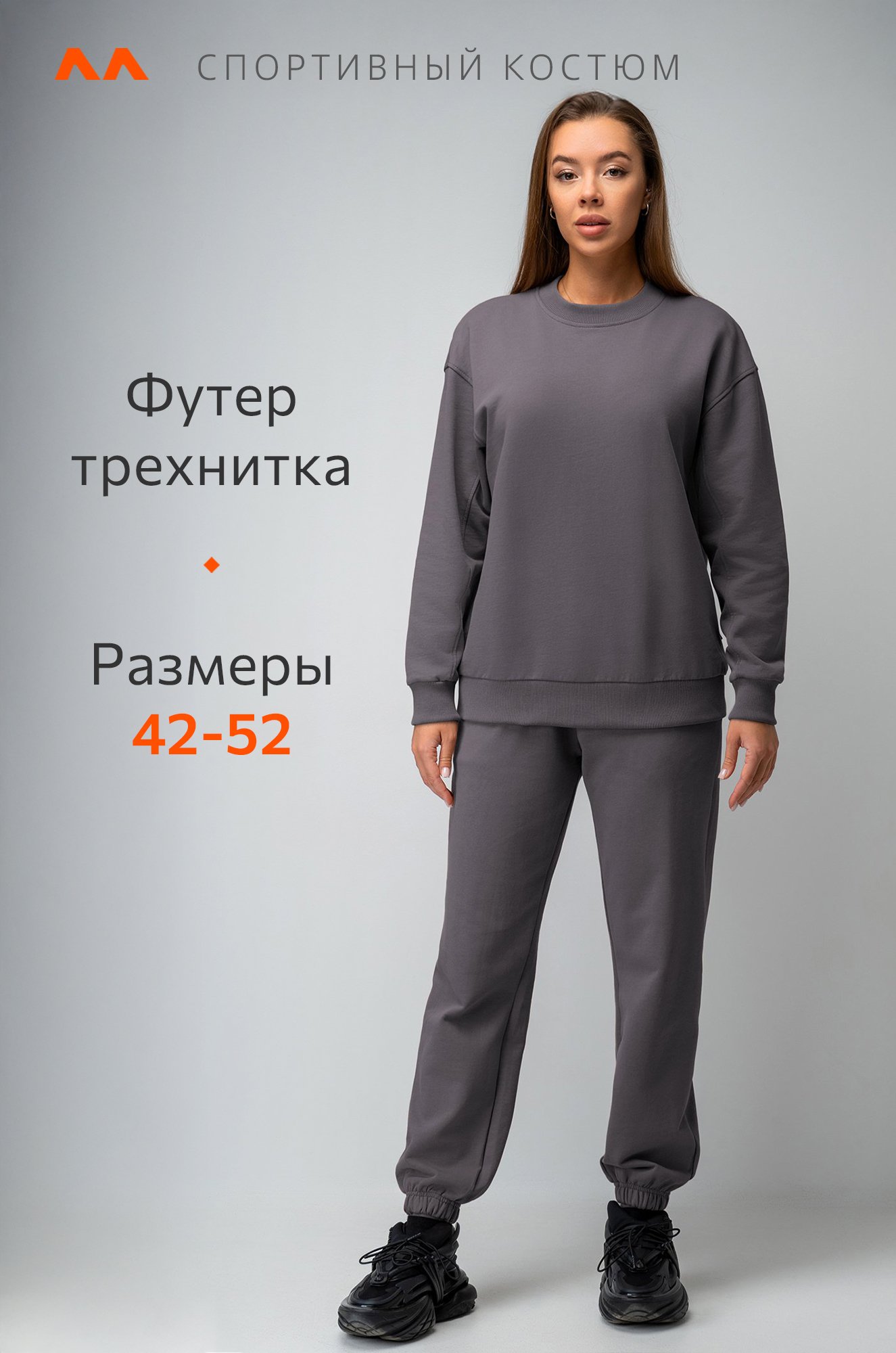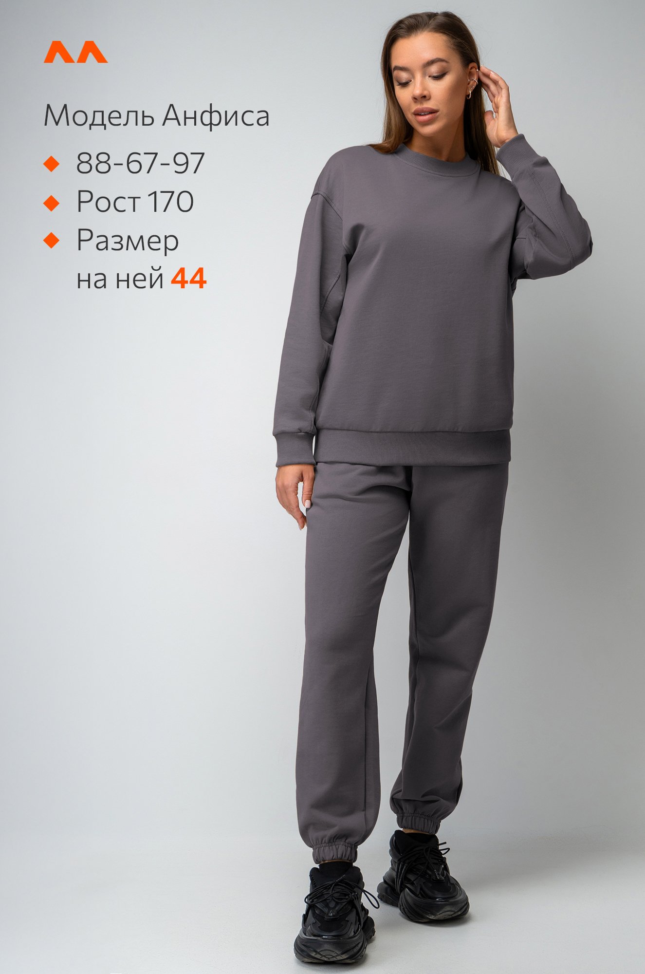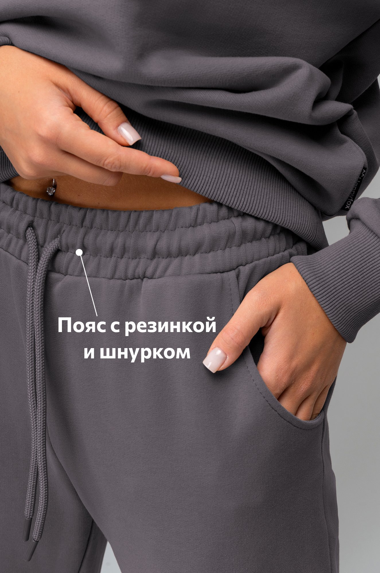 Женский спортивный костюм оверсайз станет надежным спутником на тренировках и в повседневной жизни. Демисезонный костюм двойка графитового цвета состоит из толстовки и брюк.