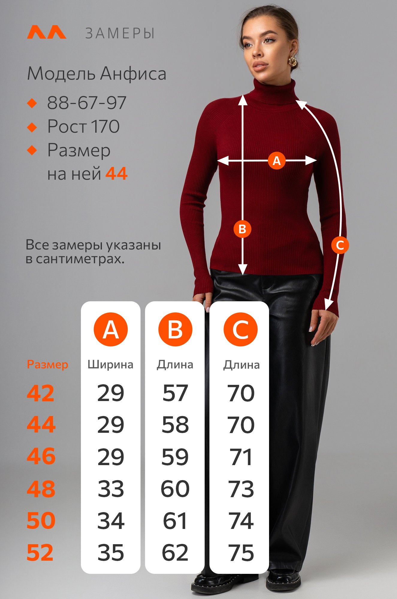 Рост модели 170 см, параметры: объем груди 88, объем талии 67, объем бедер 97 см. На ней размер 44.