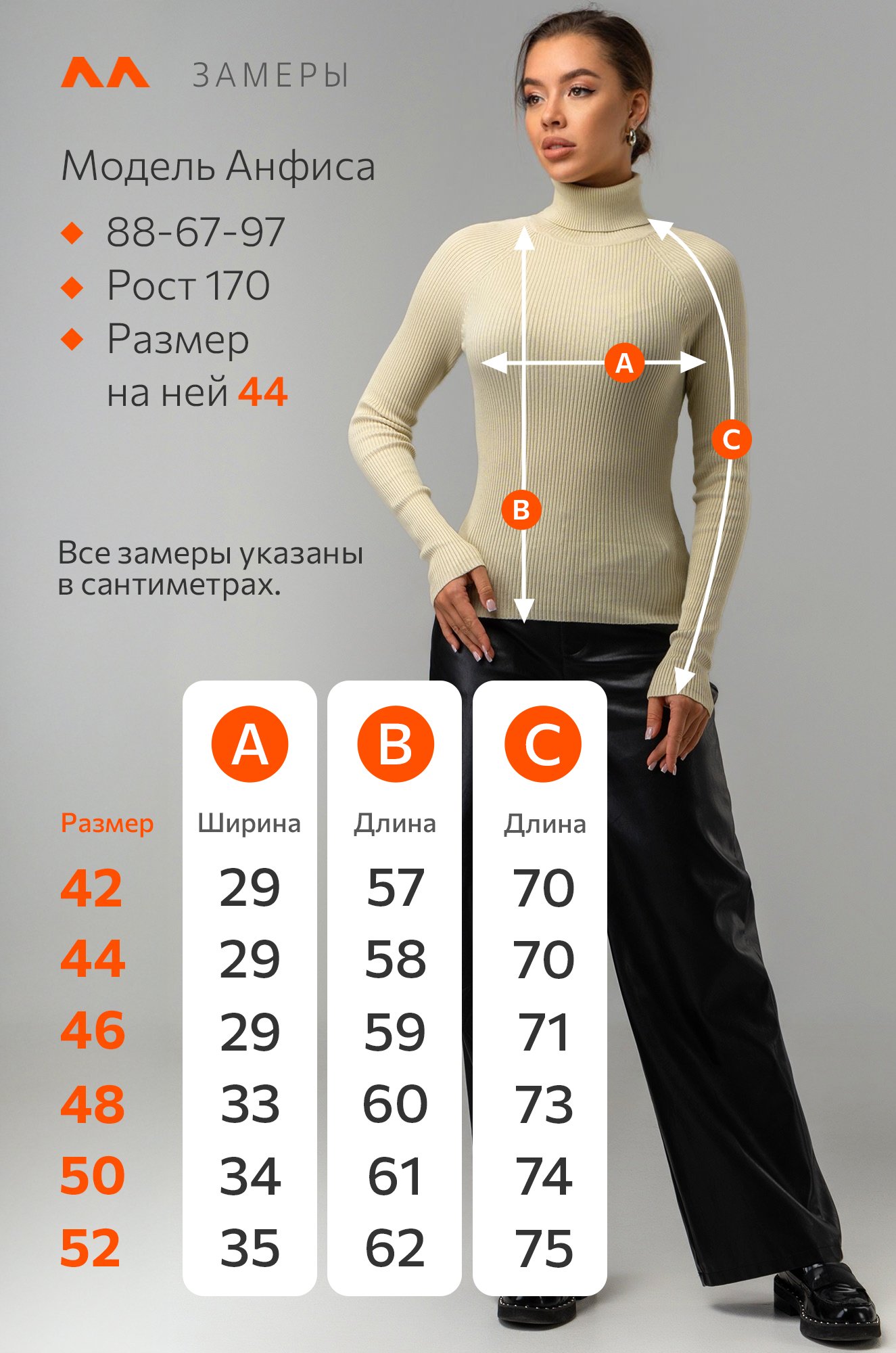 Рост модели 170 см, параметры: объем груди 88, объем талии 67, объем бедер 97 см. На ней размер 44.