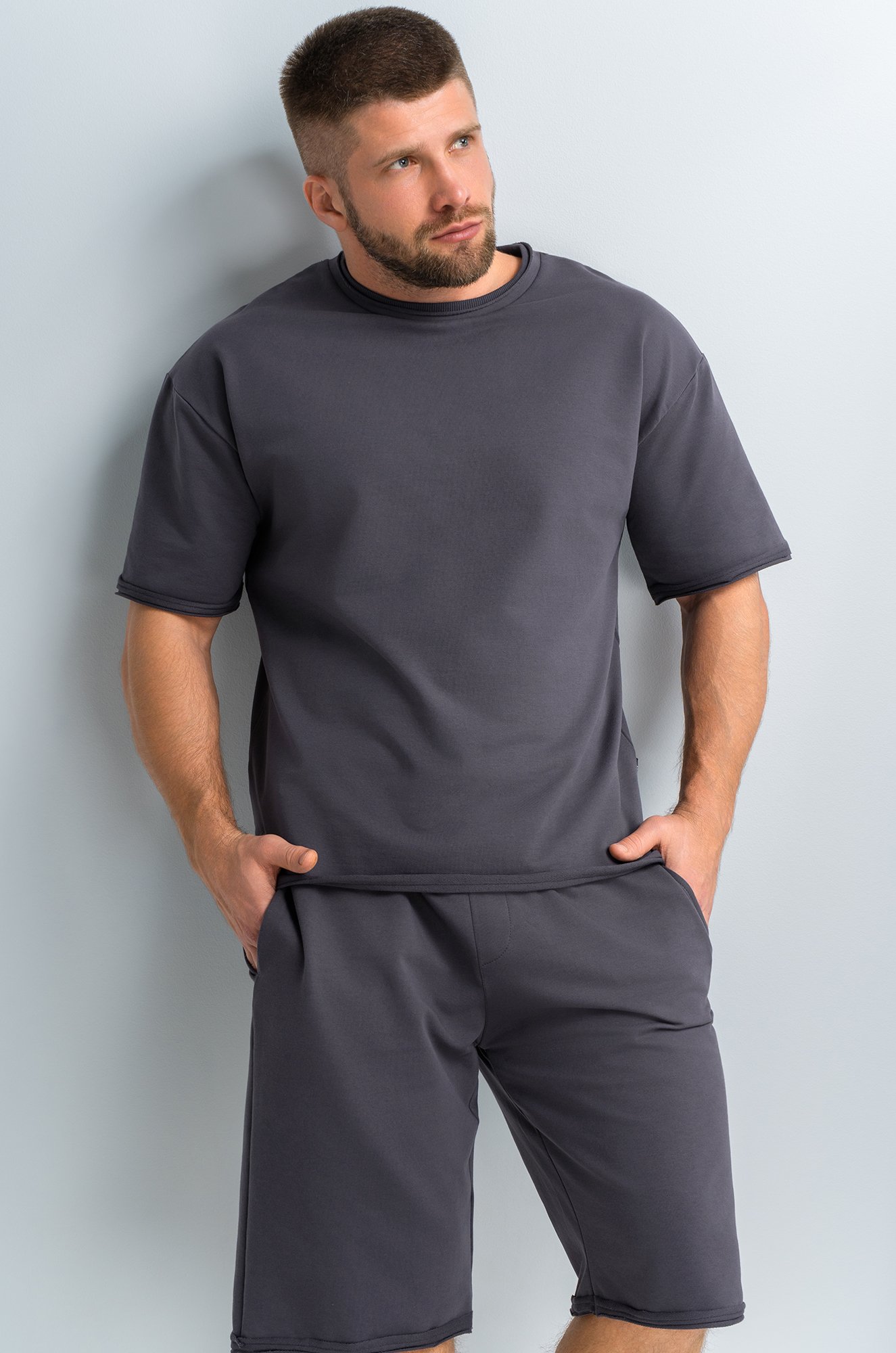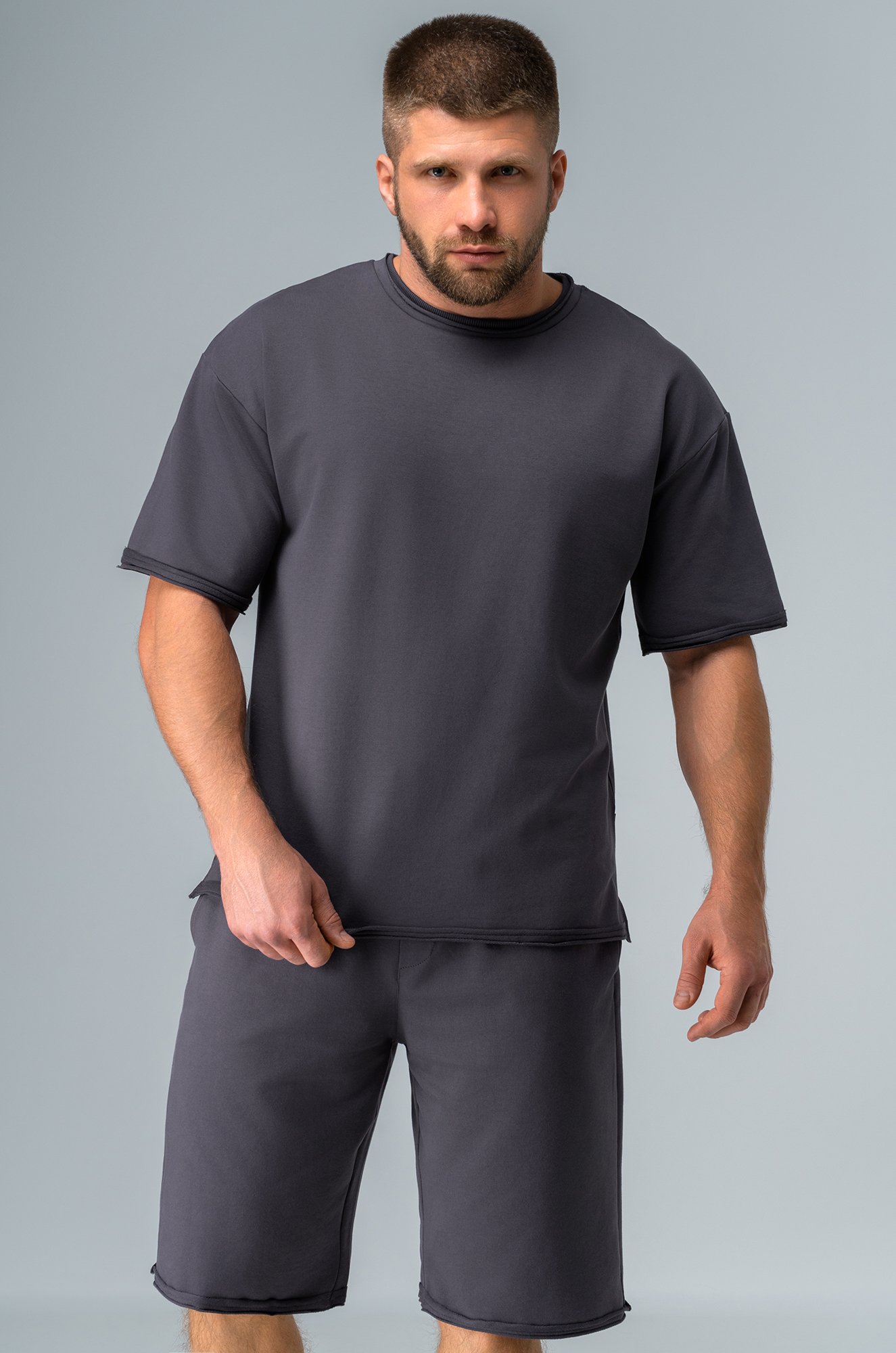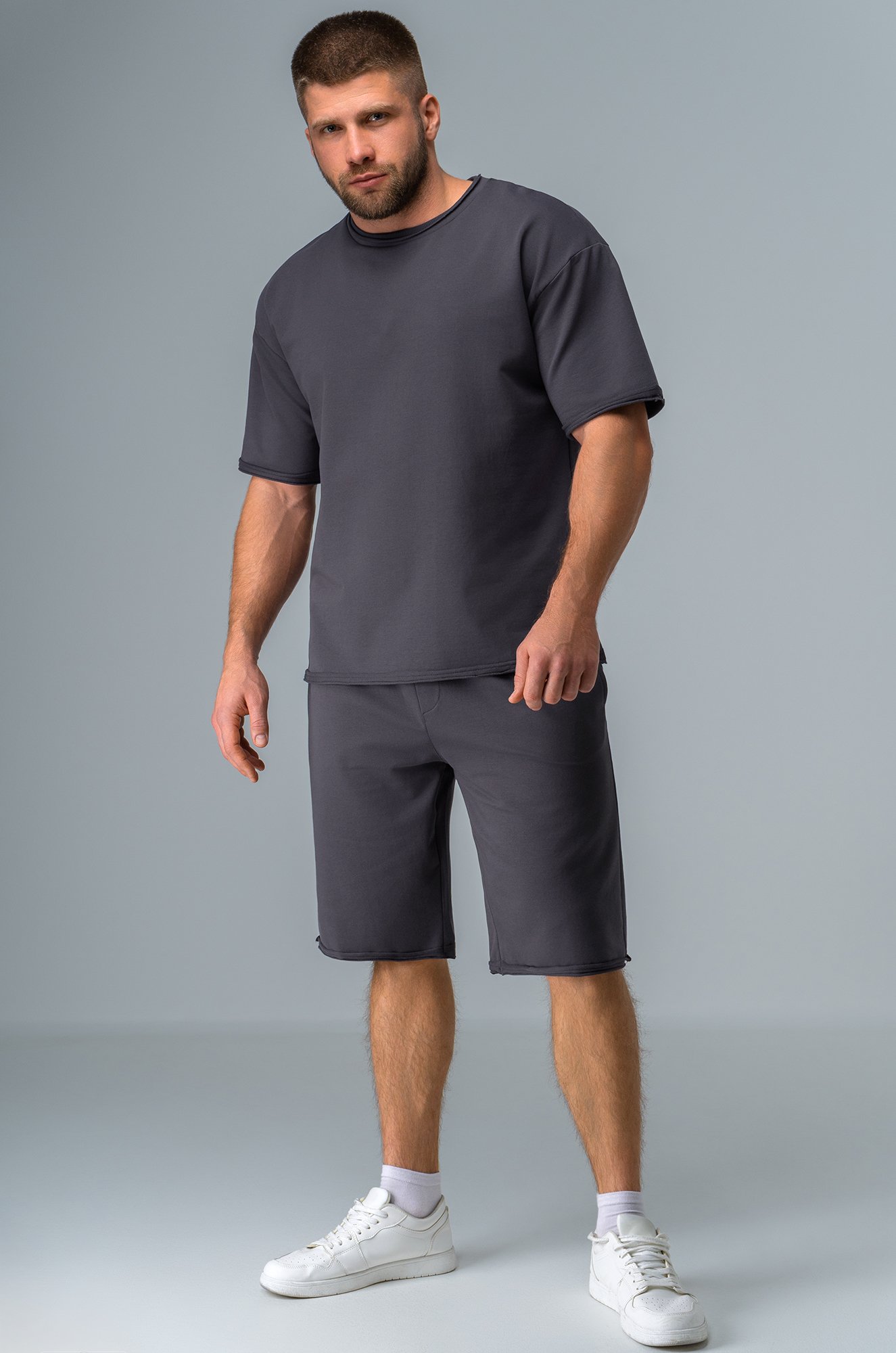 Мужской спортивный костюм с шортами — идеальный спутник для активного отдыха. Однотонный темно-серый костюм выполнен из хлопкового футера двухнитки (230 г/м2), который обеспечивает удобство и дышащие свойства, что делает его идеальным выбором для тренировок и повседневного ношения. Натуральный хлопок гарантирует мягкость и комфорт, а лайкра дарит идеальную посадку.