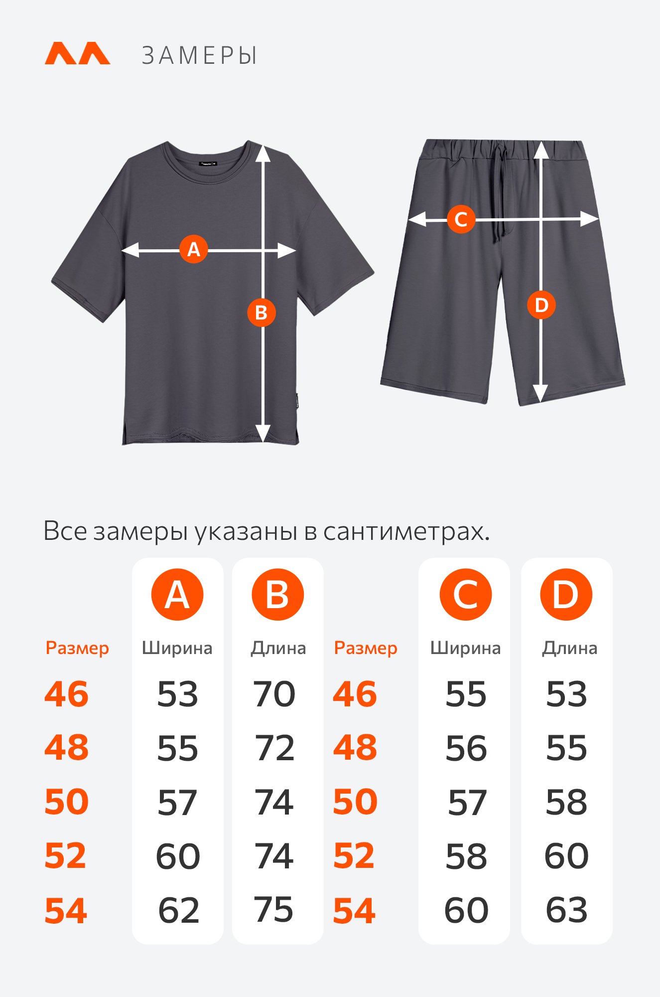 Размер 50: футболка: длина переда: 71 см; длина по спинке: 74 см; ширина: 57 см; длина рукава внешняя: 23 см; длина рукава внутренняя: 15 см.