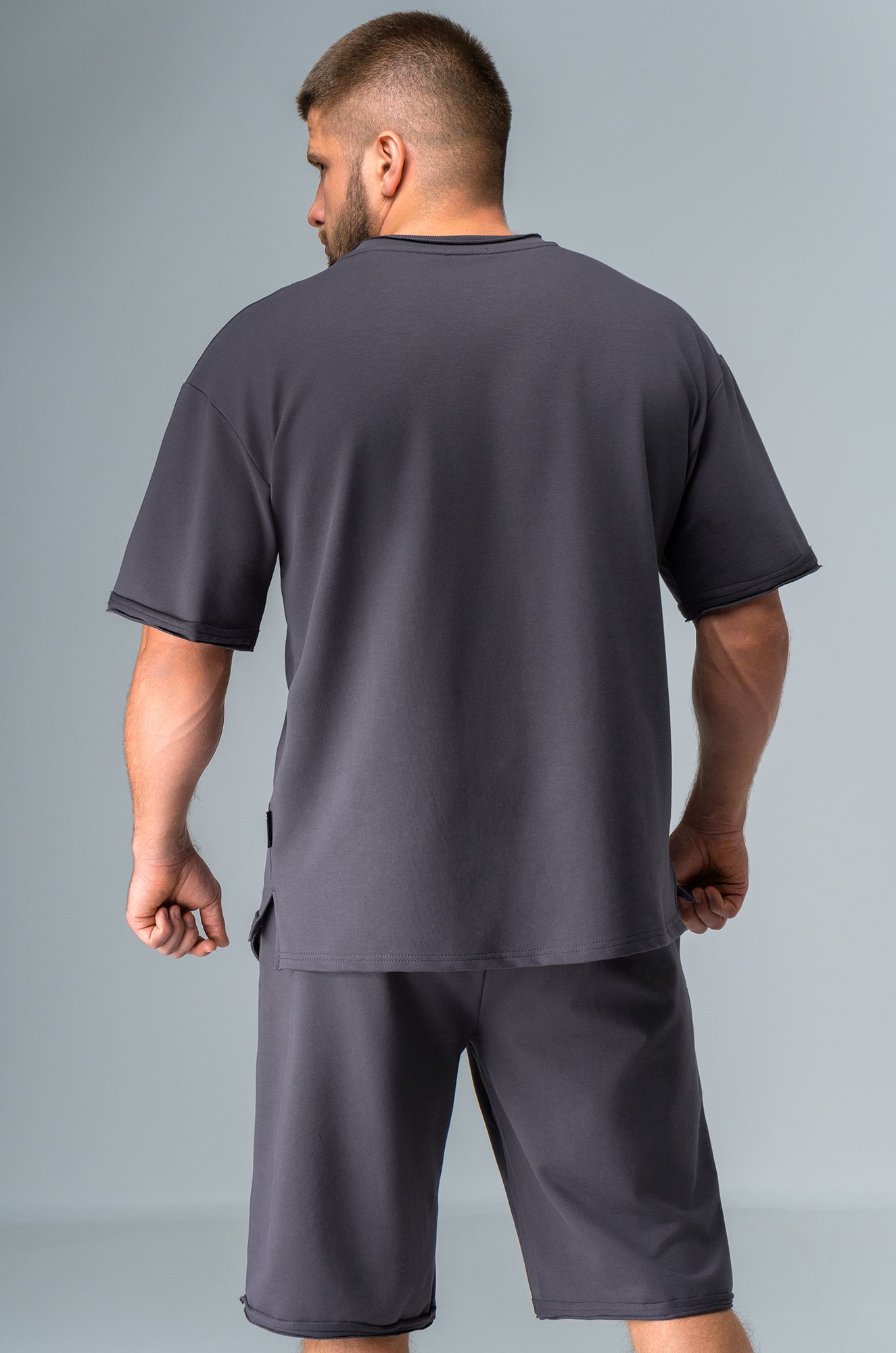 В наборе футболка с коротким рукавом и удлиненные шорты. Футболка с двойным воротом и необработанные кроя добавляют нотку оригинальности, делая этот комплект не только функциональным, но и стильным. Практичные карманы и шнурок на поясе регулируют посадку и позволяют удобно фиксировать длинные шорты на талии. Свободный крой обеспечивает свободу движений и лёгкость, что особенно важно для любителей фитнеса и динамичных тренировок.