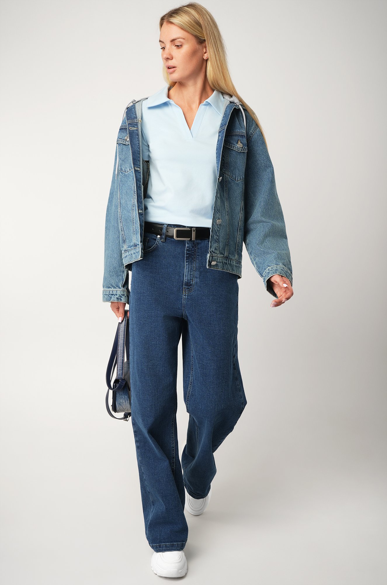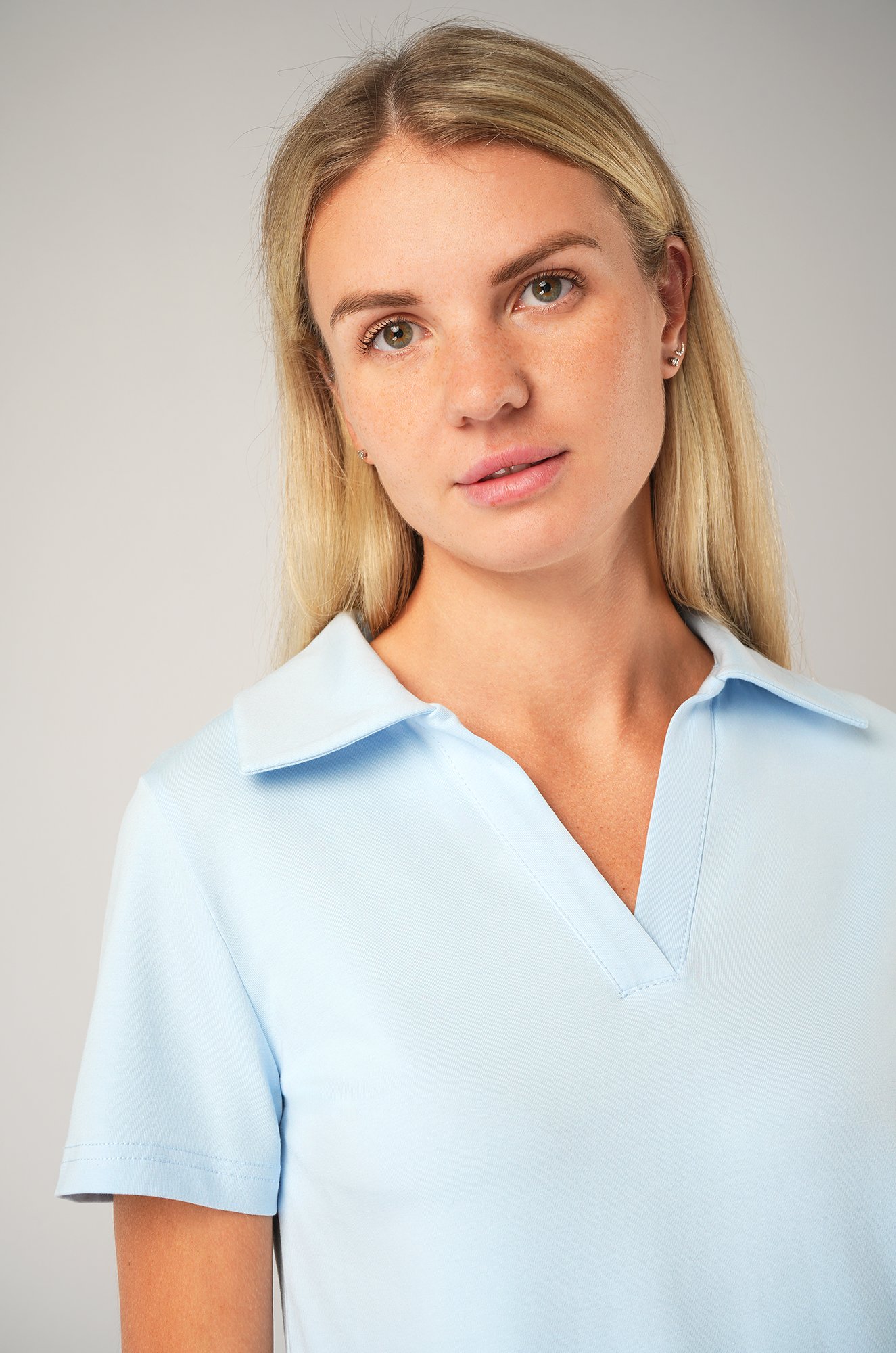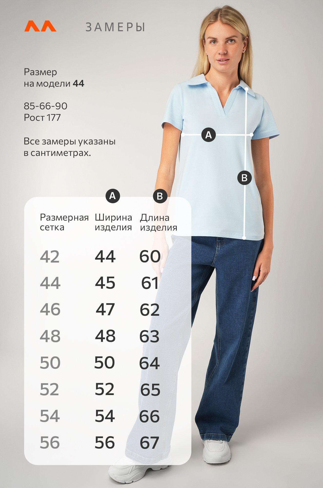Голубая футболка поло из трикотажа кулирная гладь выполнена в лаконичном дизайне: прямой крой, отложной воротник и V-вырез добавляют изящности. Хлопковое поло подойдет для похода в офис, на прогулку и для дома.