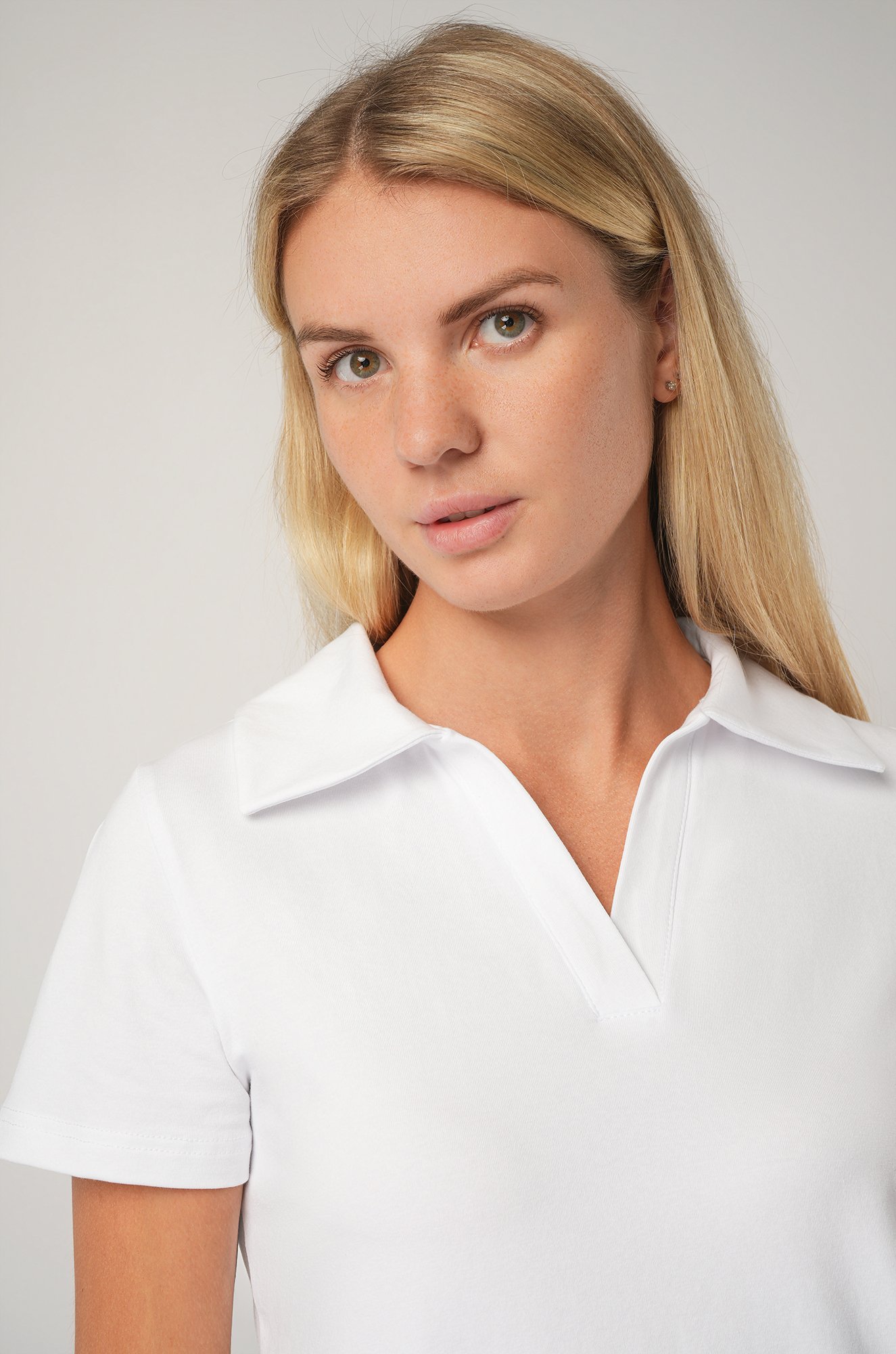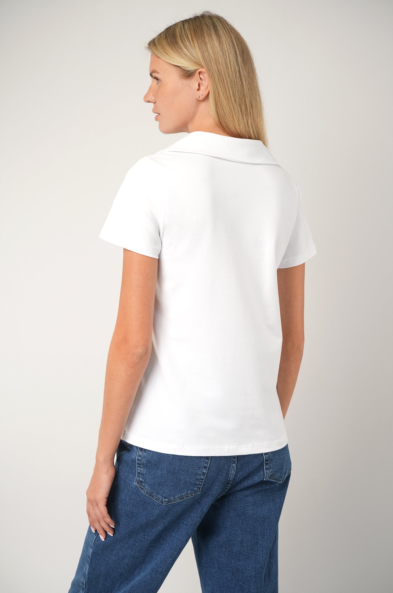 Белая футболка поло из трикотажа кулирная гладь выполнена в лаконичном дизайне: прямой крой, отложной воротник и V-вырез добавляют изящности. Хлопковое поло подойдет для похода в офис, на прогулку и для дома.