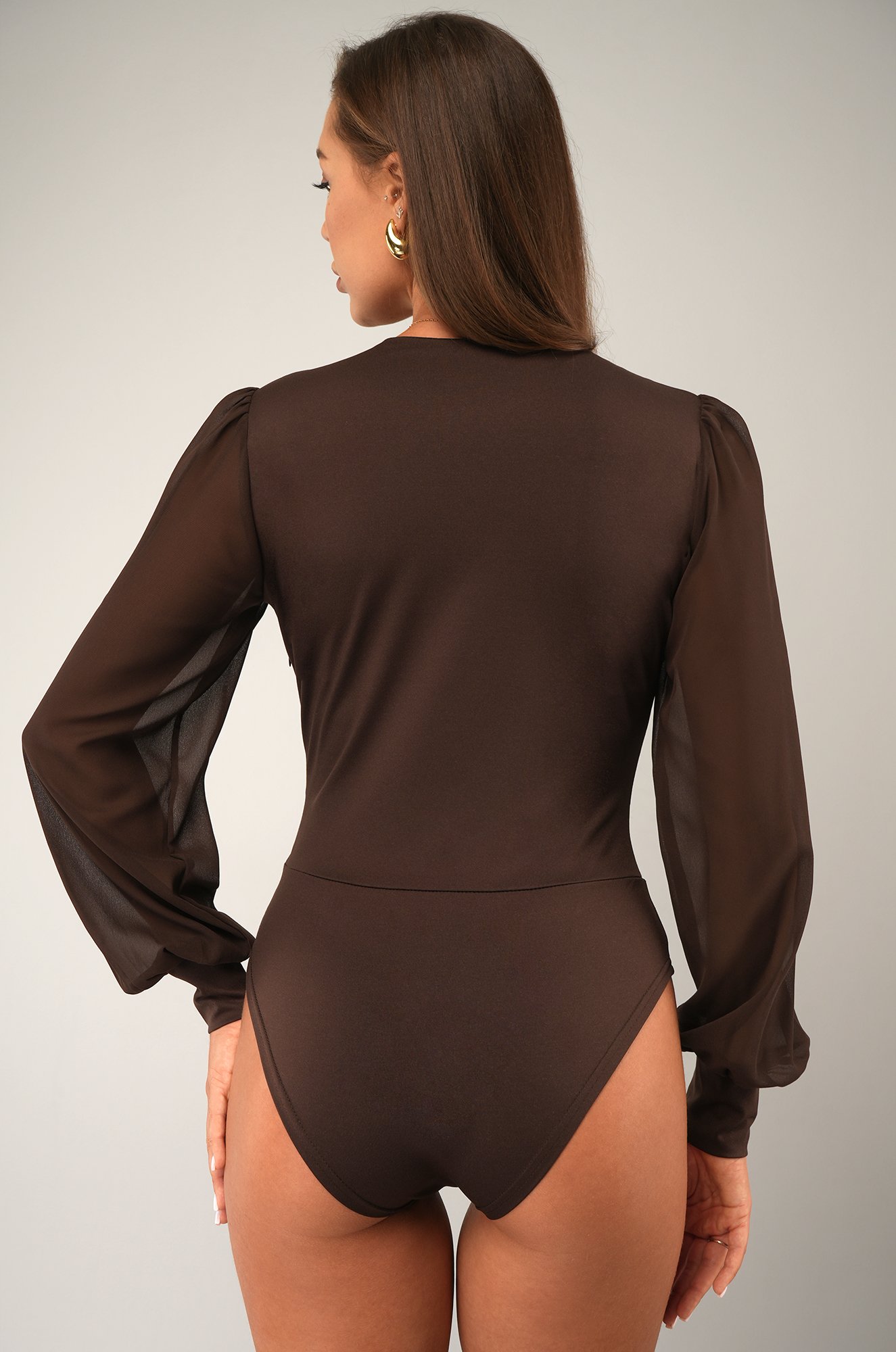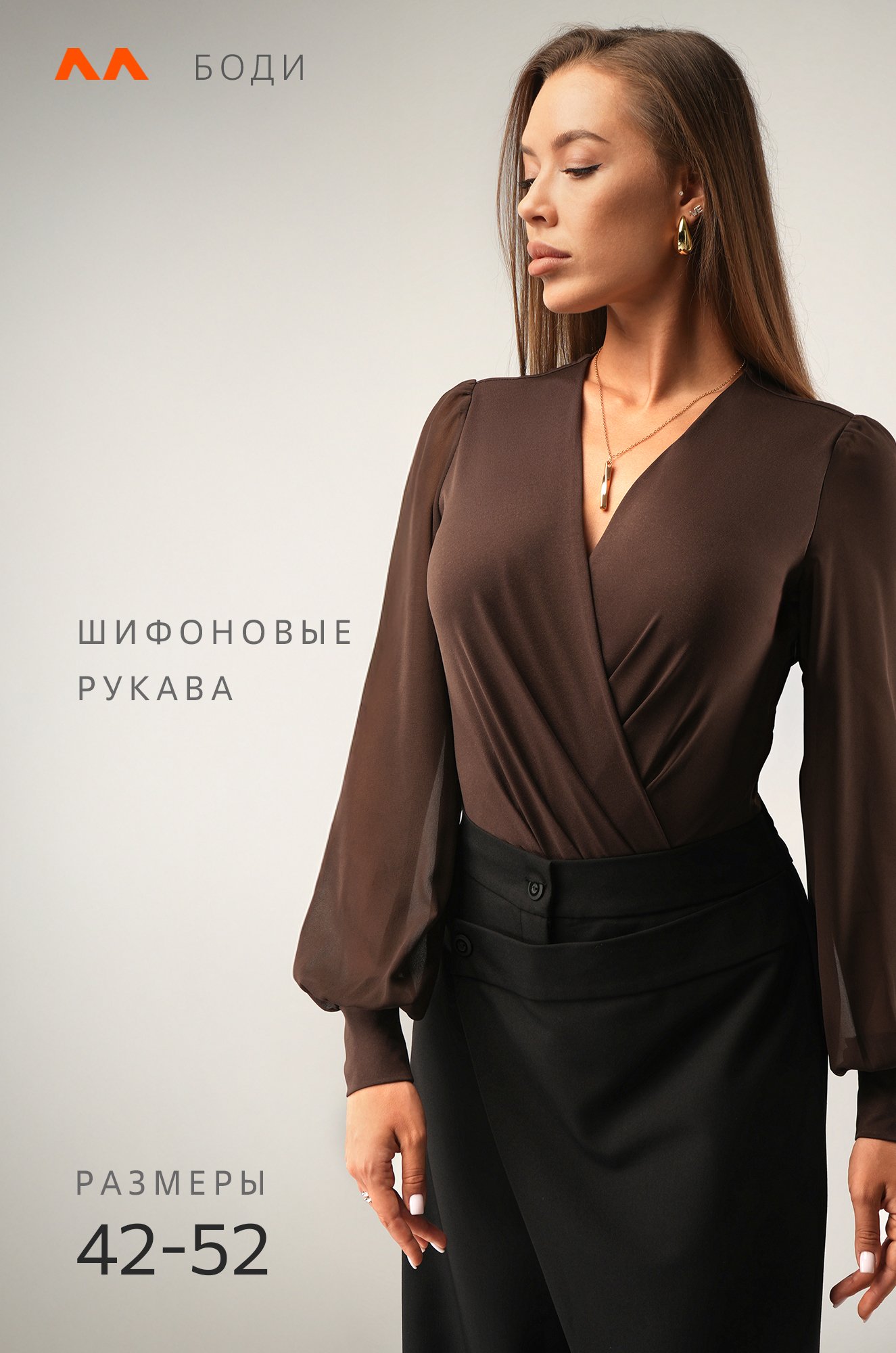 — коричневая блузка-боди с v-вырезом выгодно подчеркивает линию декольте;