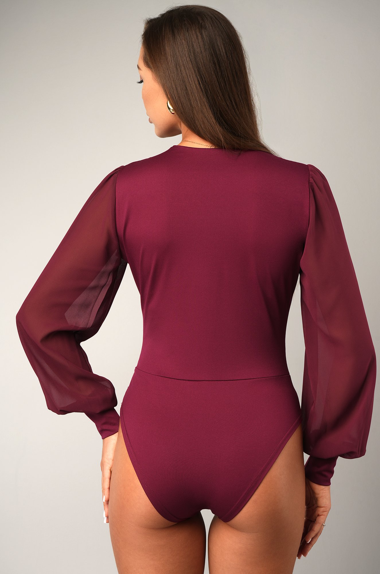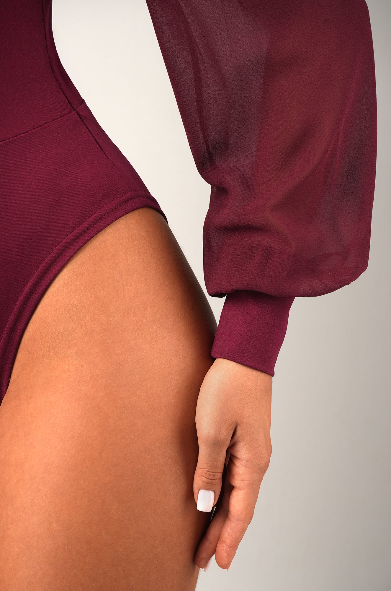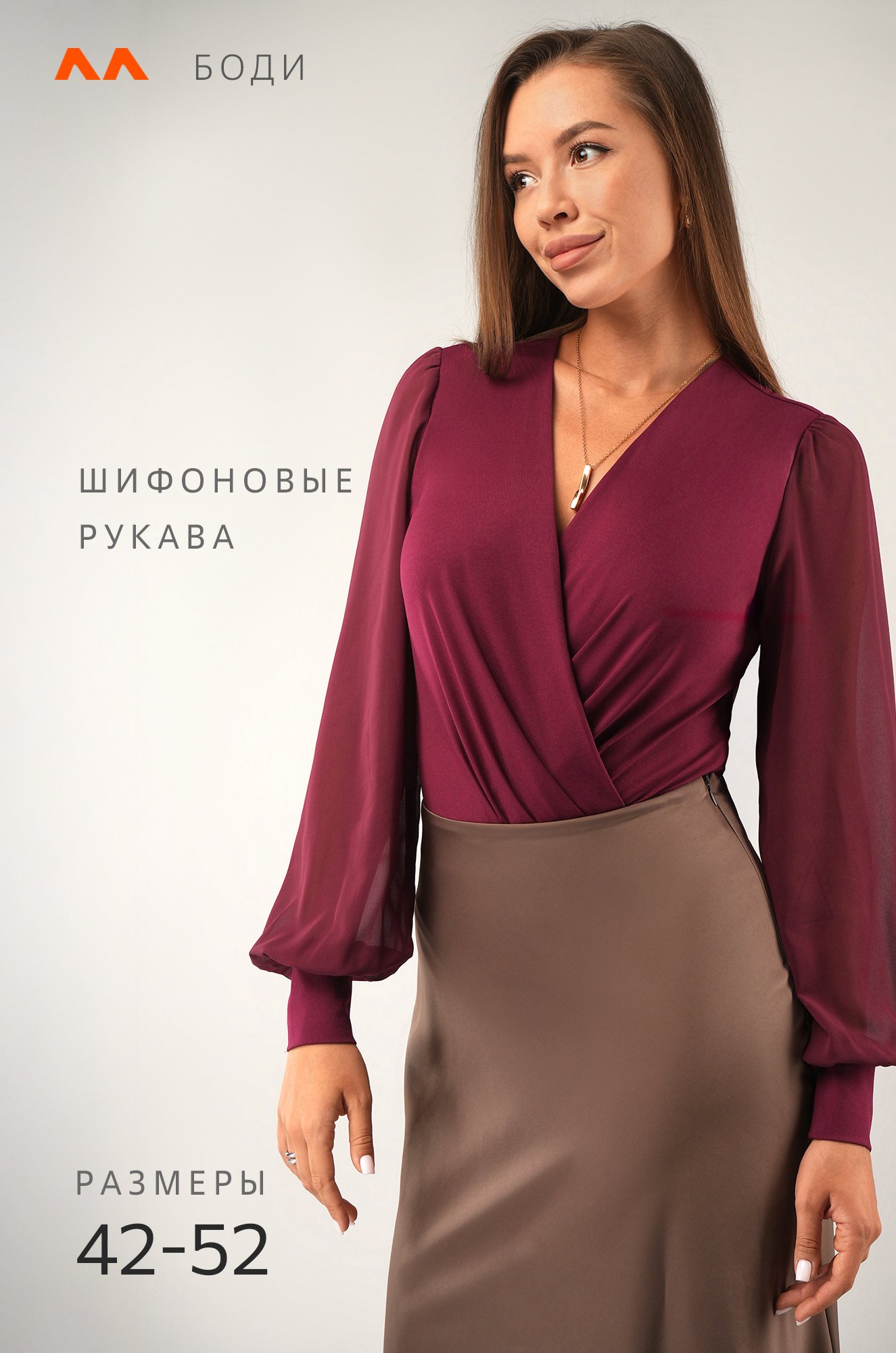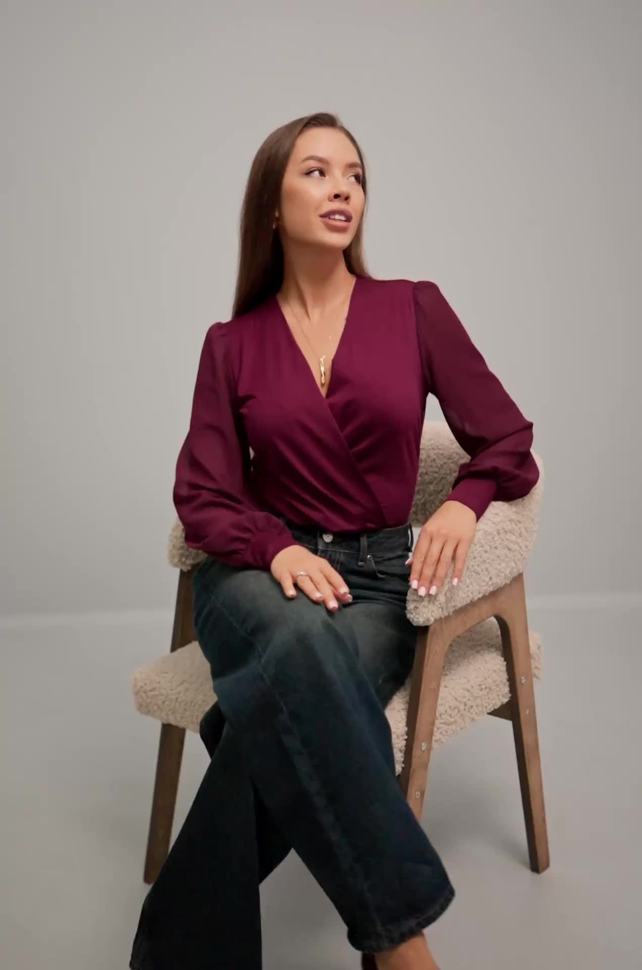 — бордовая блузка-боди с v-вырезом выгодно подчеркивает линию декольте;