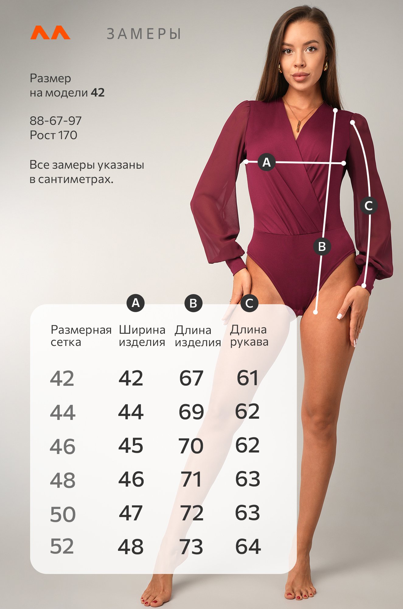 Размер 42: длина: 67 см; ширина: 42 см; длина рукава внешняя: 61 см; длина рукава внутренняя: 46 см.