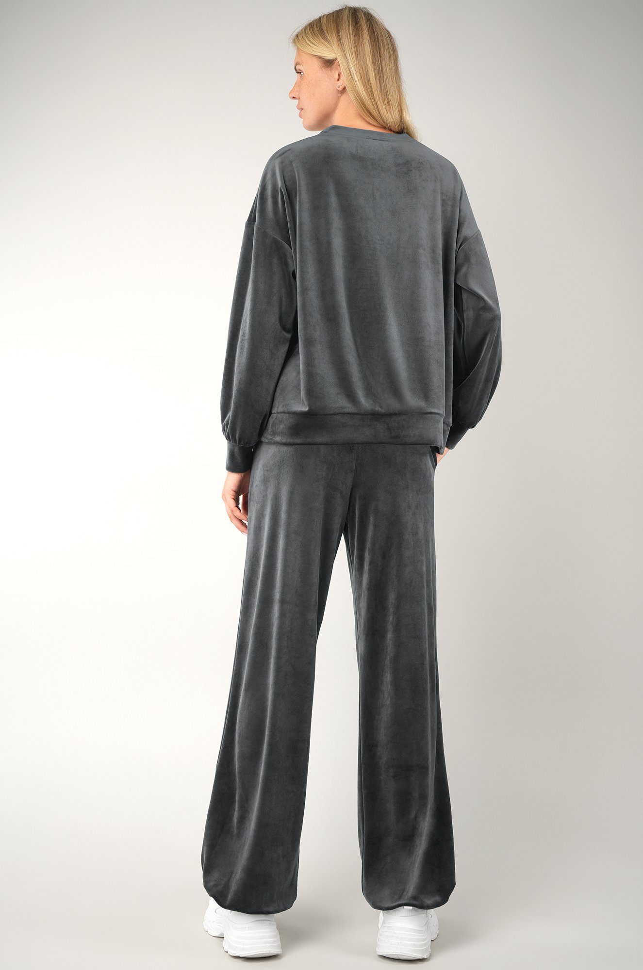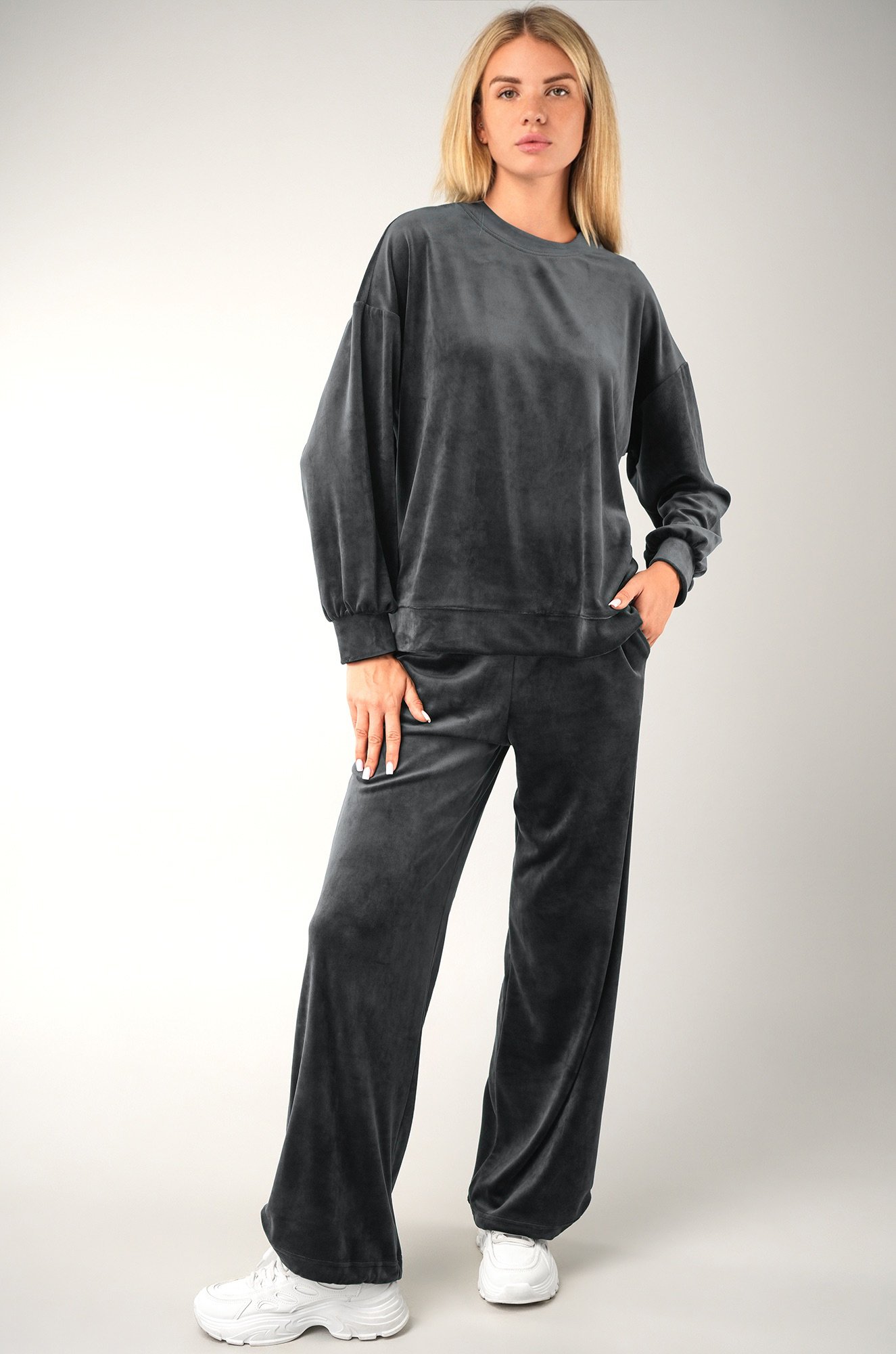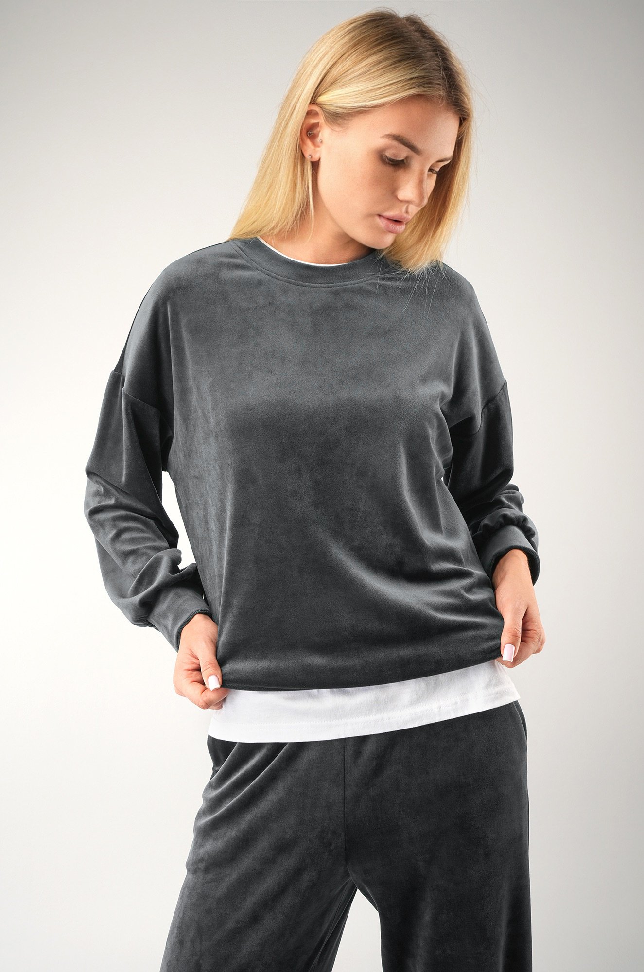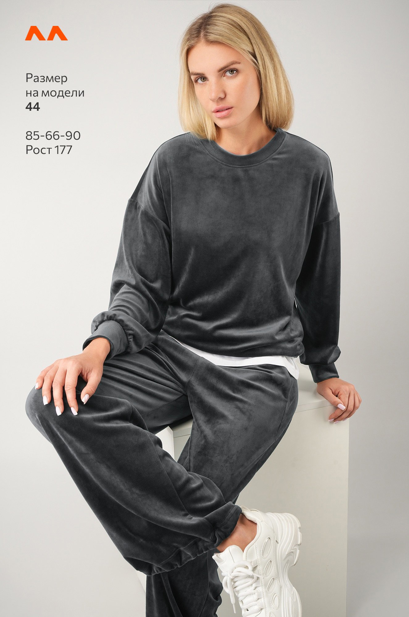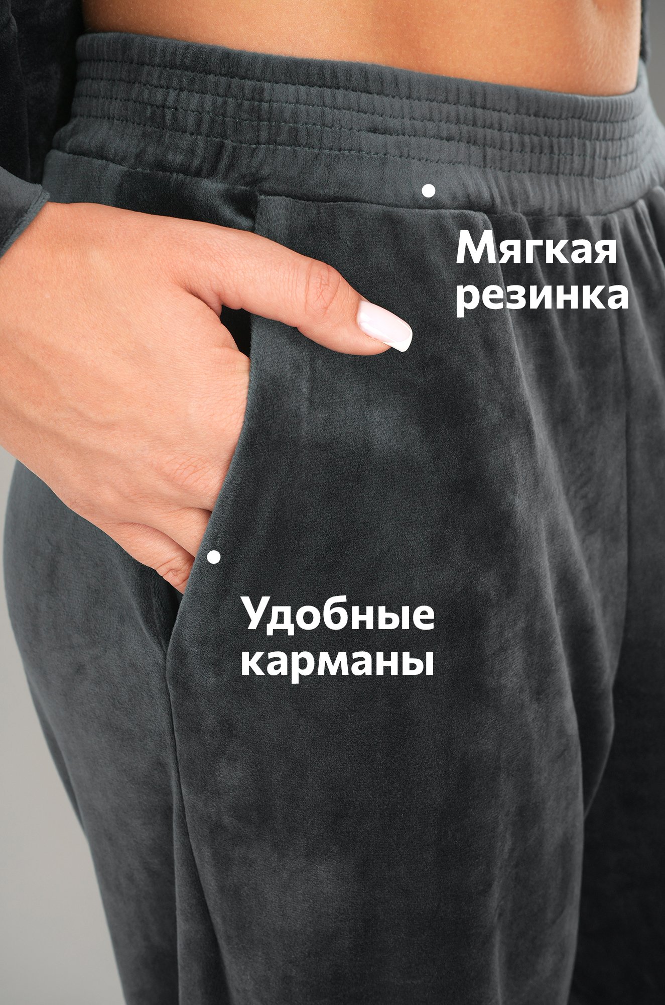 Женский костюм из мягкого велюра темно-серого цвета — идеальный выбор для тех, кто ценит комфорт и стиль. Однотонный костюм двойка согреет в прохладные дни осени и весны, а лаконичный дизайн подчеркнёт уверенность и вкус.