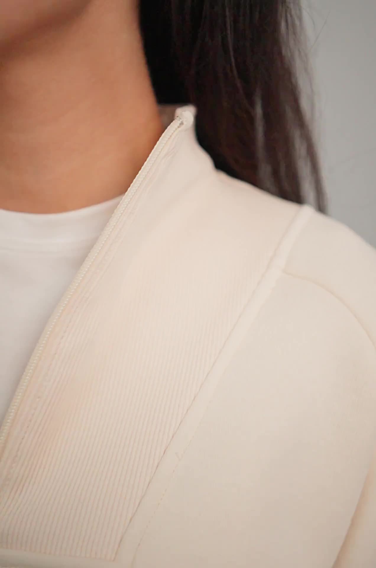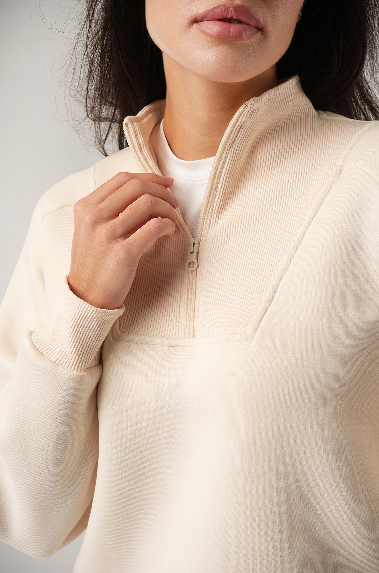 — молочный свитшот с полузамком на молнии защищает от ветра и добавляет стильный акцент;