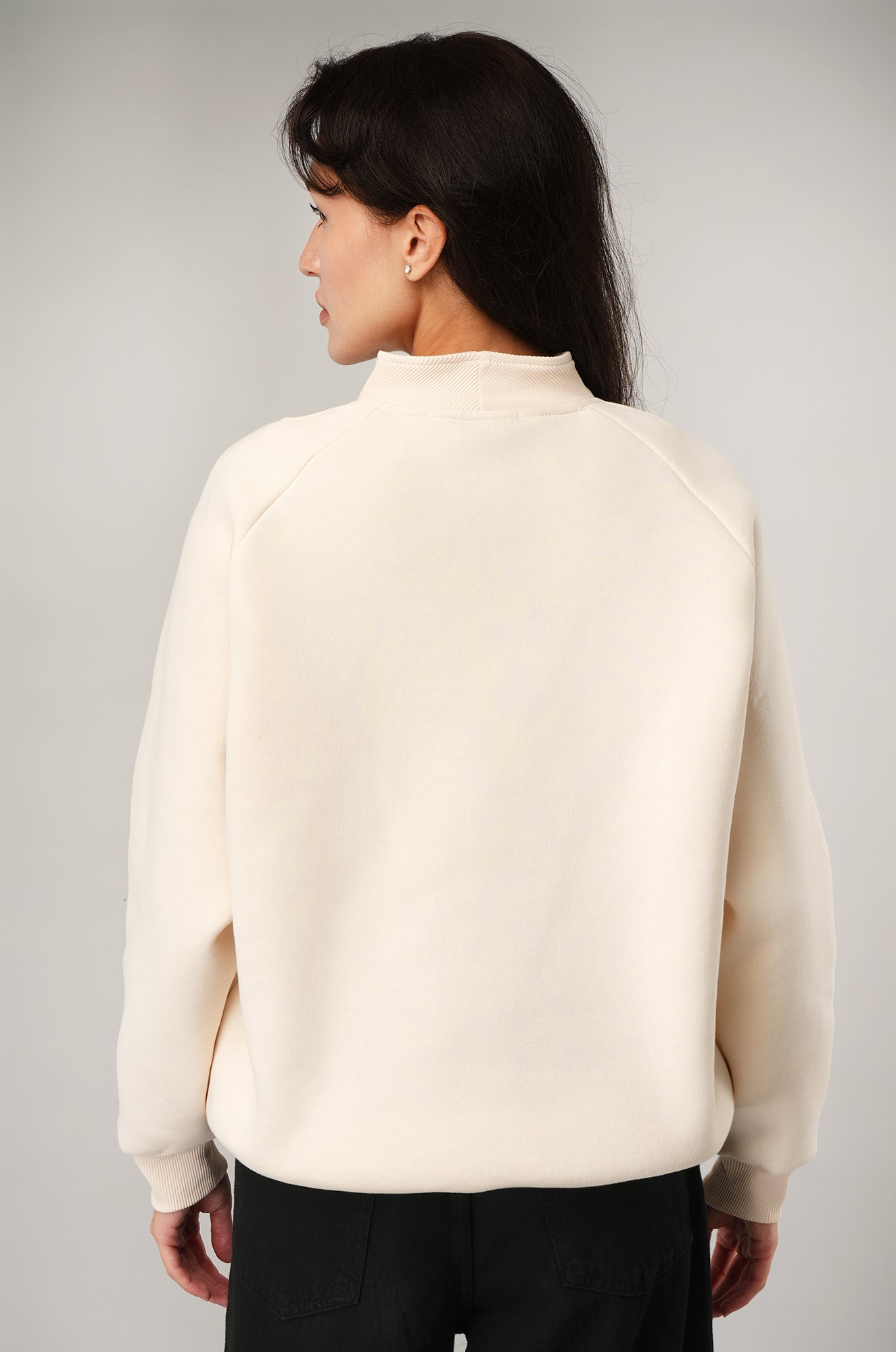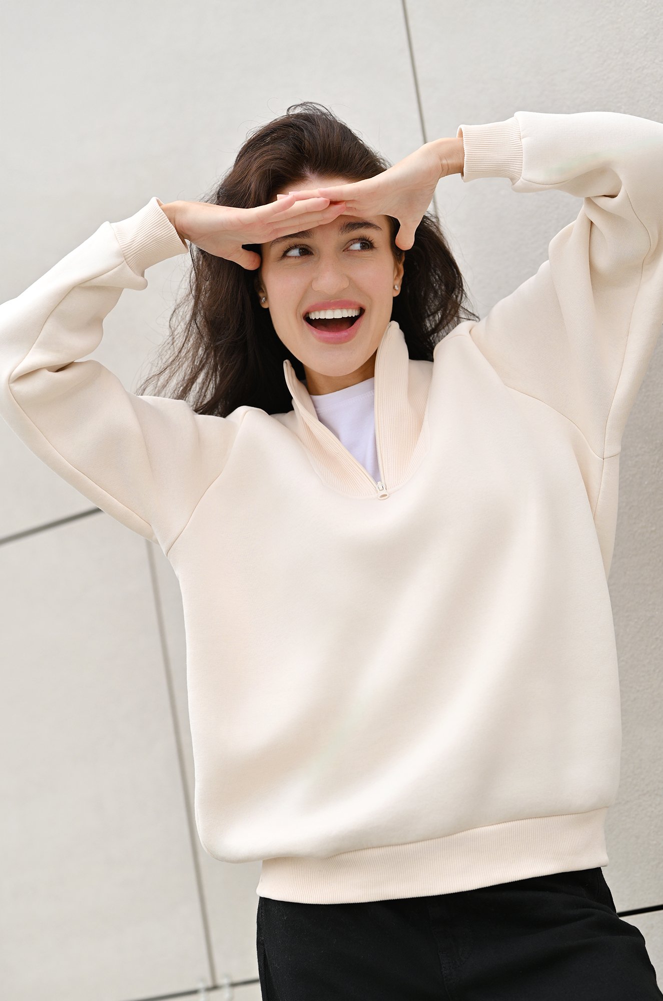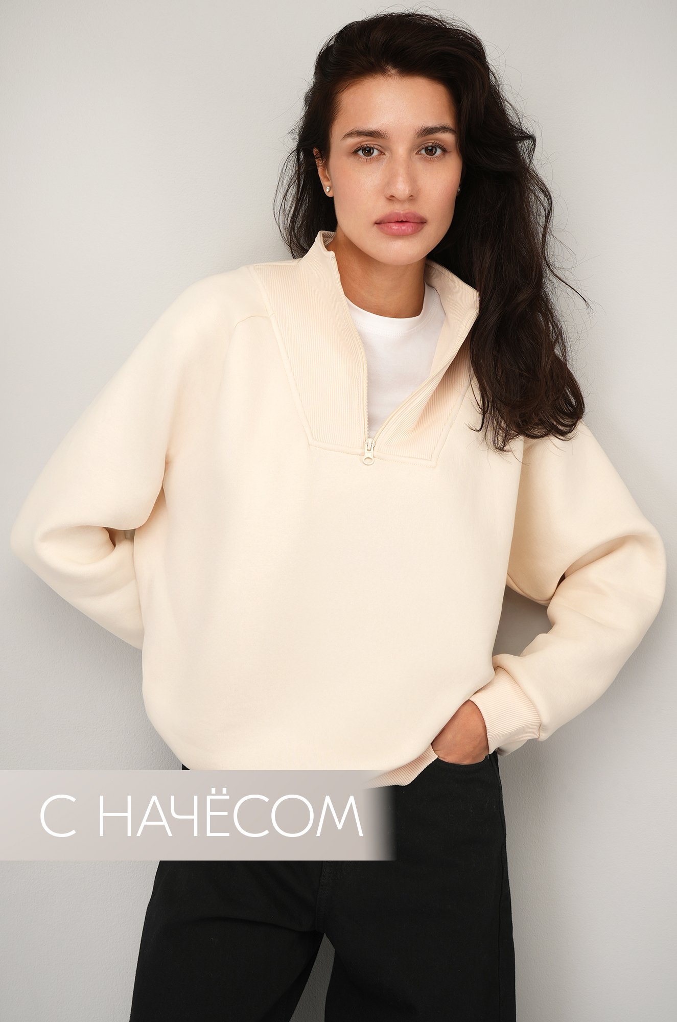 Женская толстовка оверсайз — стиль и комфорт в одном. Однотонный светло-бежевый свитшот на молнии выполнен из мягкого футера с начесом (60% хлопок, 40% полиэстер). Спортивная кофта с воротником на молнии согреет в прохладные дни.