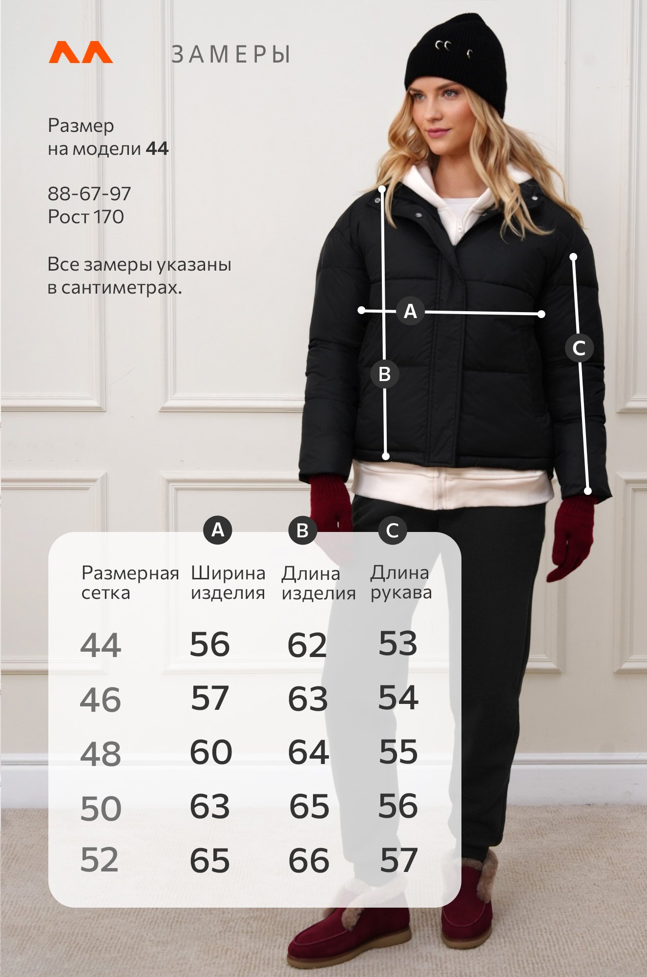Размер 44: длина:62 см; ширина:56 см; длина рукава внешняя:53 см; длина рукава внутренняя:44 см.