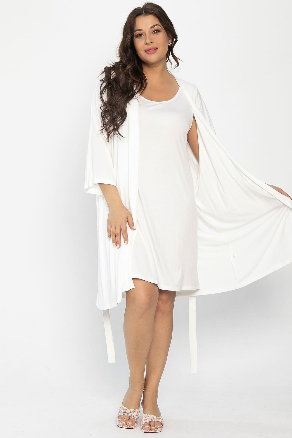 Идеальный выбор для создания уюта и расслабления в домашней обстановке. Этот пеньюар станет вашим верным спутником для спокойных вечеров, утреннего кофе или просмотра фильмов. Свободный крой и рукава длиной три четверти обеспечивают максимальный комфорт и свободу движений, а пояс из основной ткани идет в комплекте. Он создан специально для того, чтобы дарить радость и создавать атмосферу роскоши и уюта каждый день. Пеньюар изготовлен из мягкой вискозы с добавлением лайкры, что делает его приятным на ощупь и идеально подходящим для расслабленного и стильного домашнего образа.