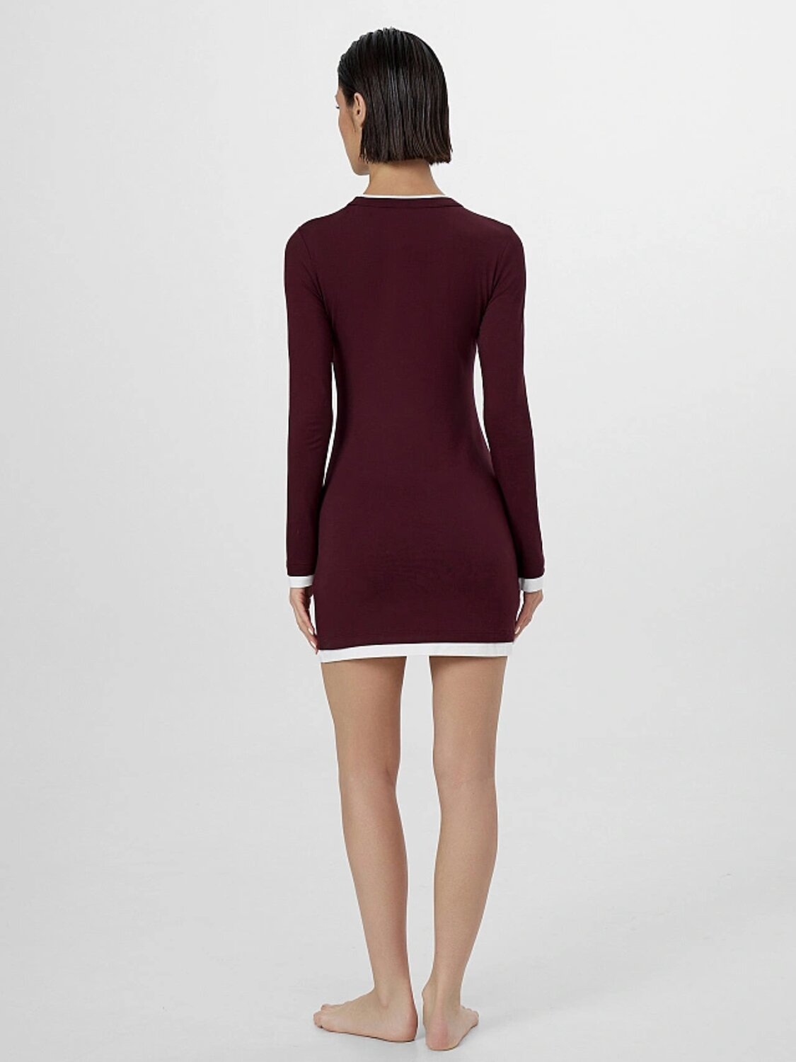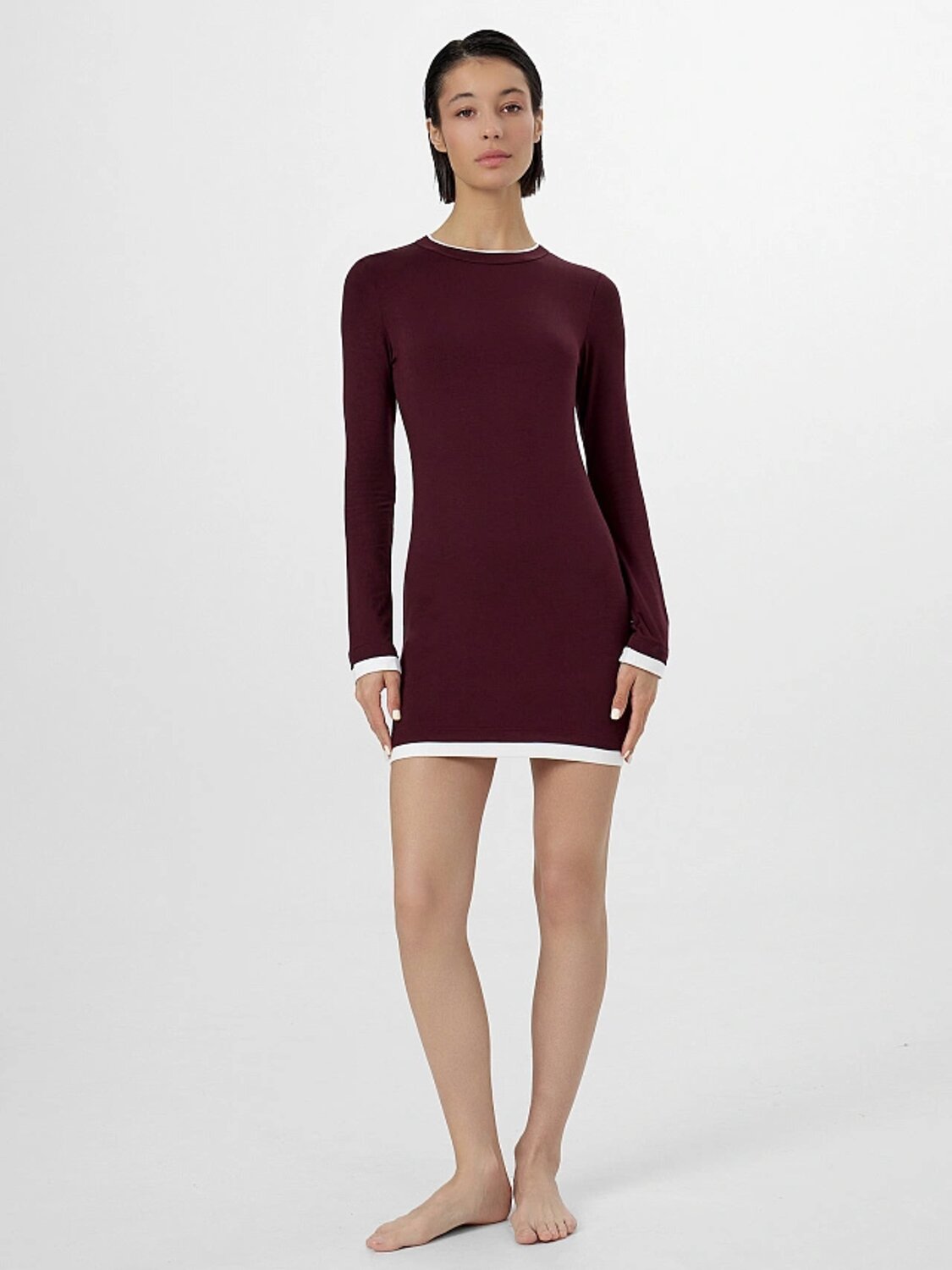 Модель прилегающего силуэта мягко подчеркивает фигуру, сохраняя свободу движений. Глубокий оттенок добавляет образу благородства, а круглая горловина с имитацией двойной обтачки и длинные рукава создают завершенный силуэт. Дизайн дополнен оригинальной деталью по низу платья и рукавов — имитацией поддетого платья, что придает модели стильную многослойность.
