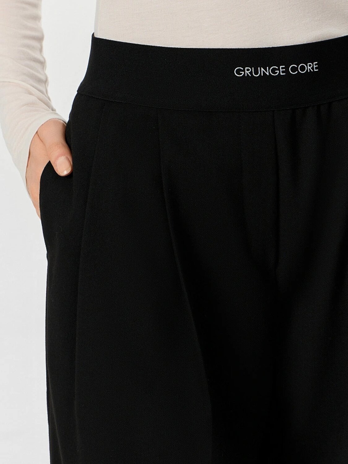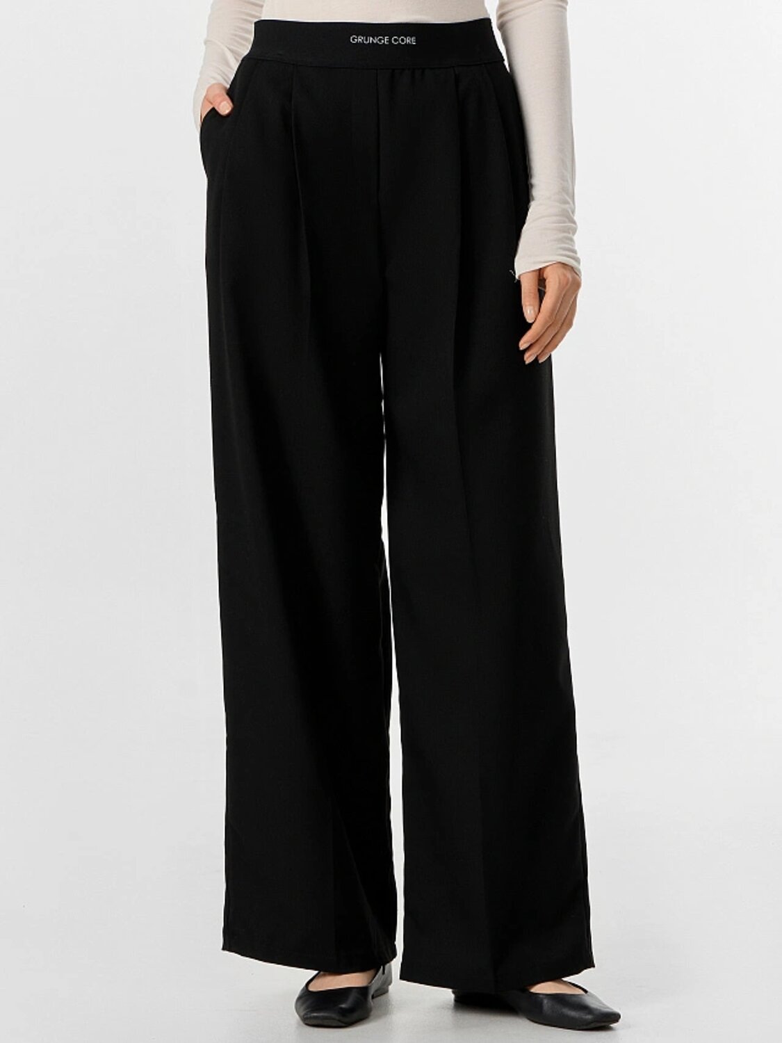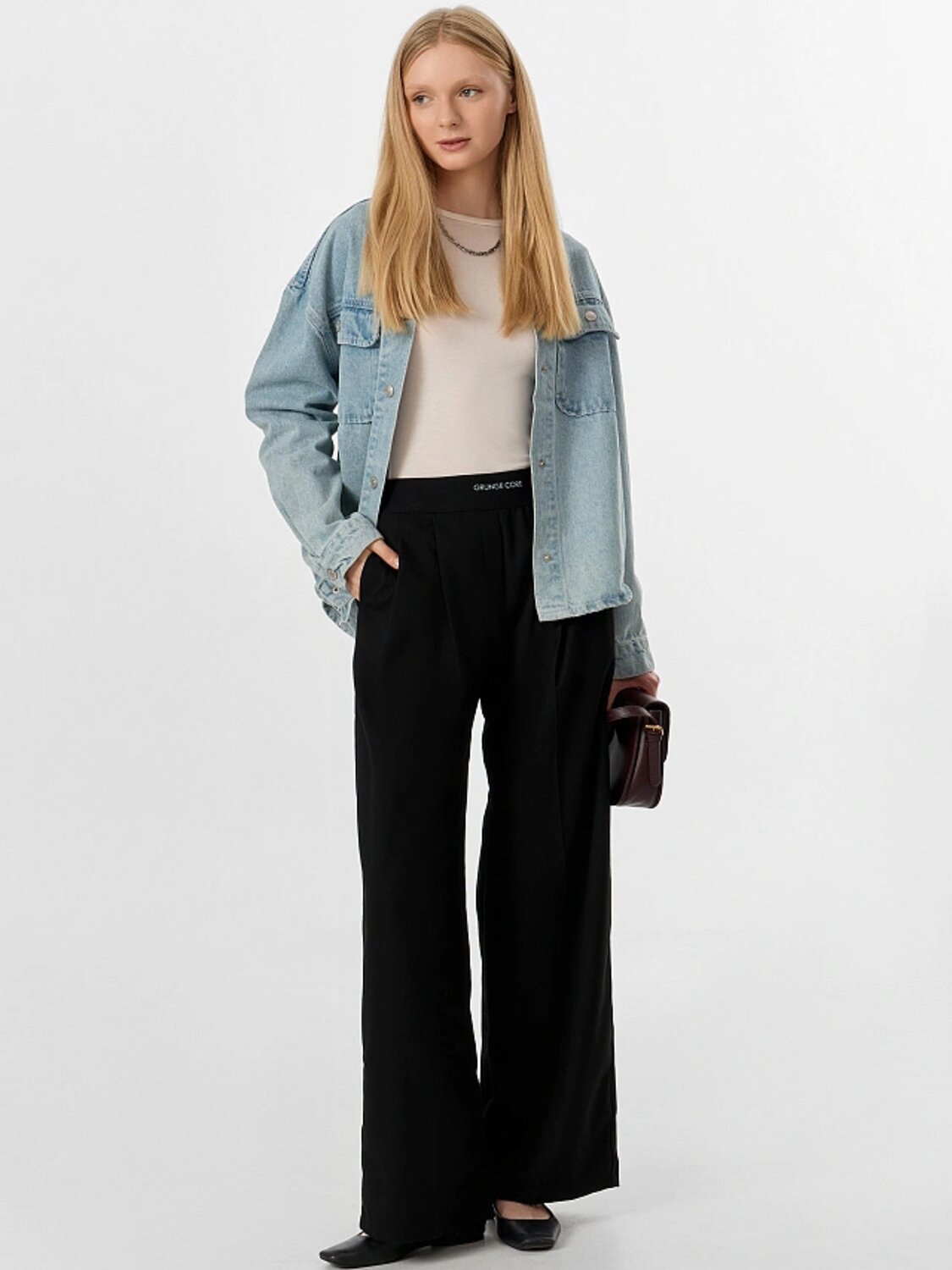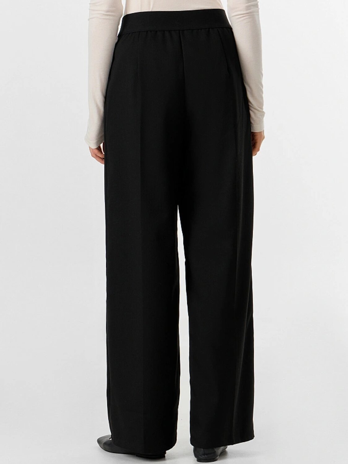Брюки женские выполнены из текстиля. Брюки прямые, свободного силуэта. Посадка средняя, сидение опущено. По верхнему срезу притачана эластичная тесьма жаккард 50мм (JT1-50). По переду заложены складки. На правой передней детали имитация гульфика. На задних половинках застрочены вытачки. В боковых швах обработаны карманы. Подкладка из основного полотна. Брюки со стрелками. Нижние срезы обработаны швом вподгибку.