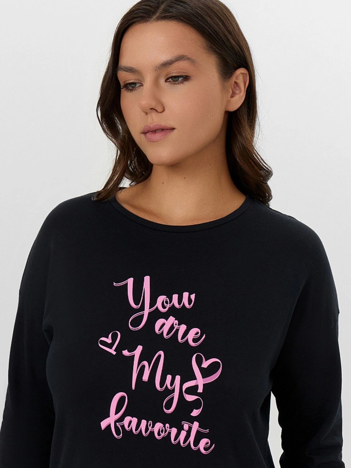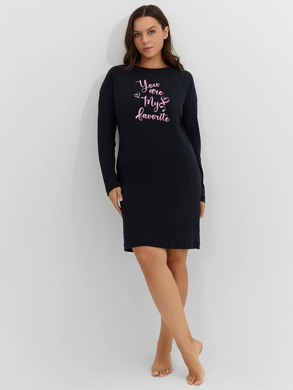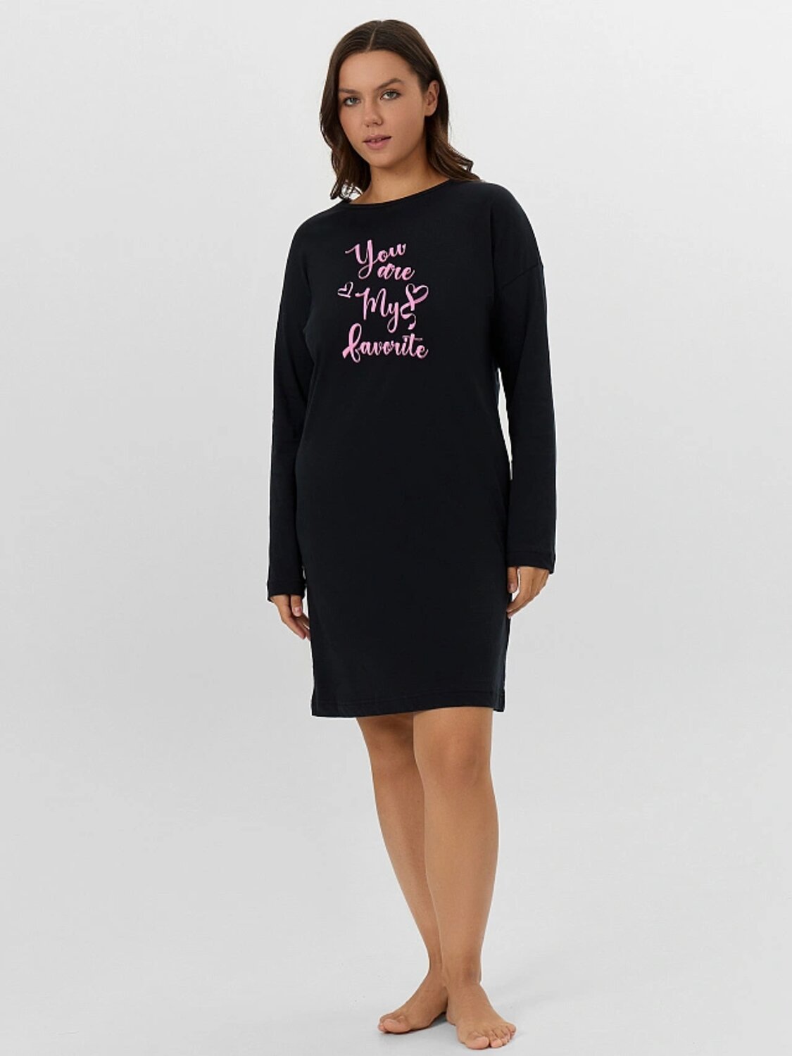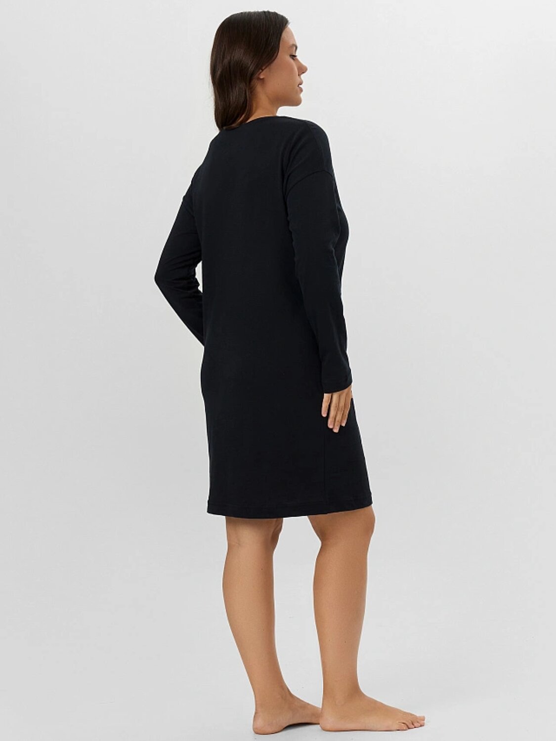 Сорочка свободного силуэта из трикотажной кулирки. В составе полотна – только натуральный хлопок! Горловина круглой формы, рукава длинные. Спущенная линия плеча и углубленная пройма дарят особый комфорт. Очаровательно!
