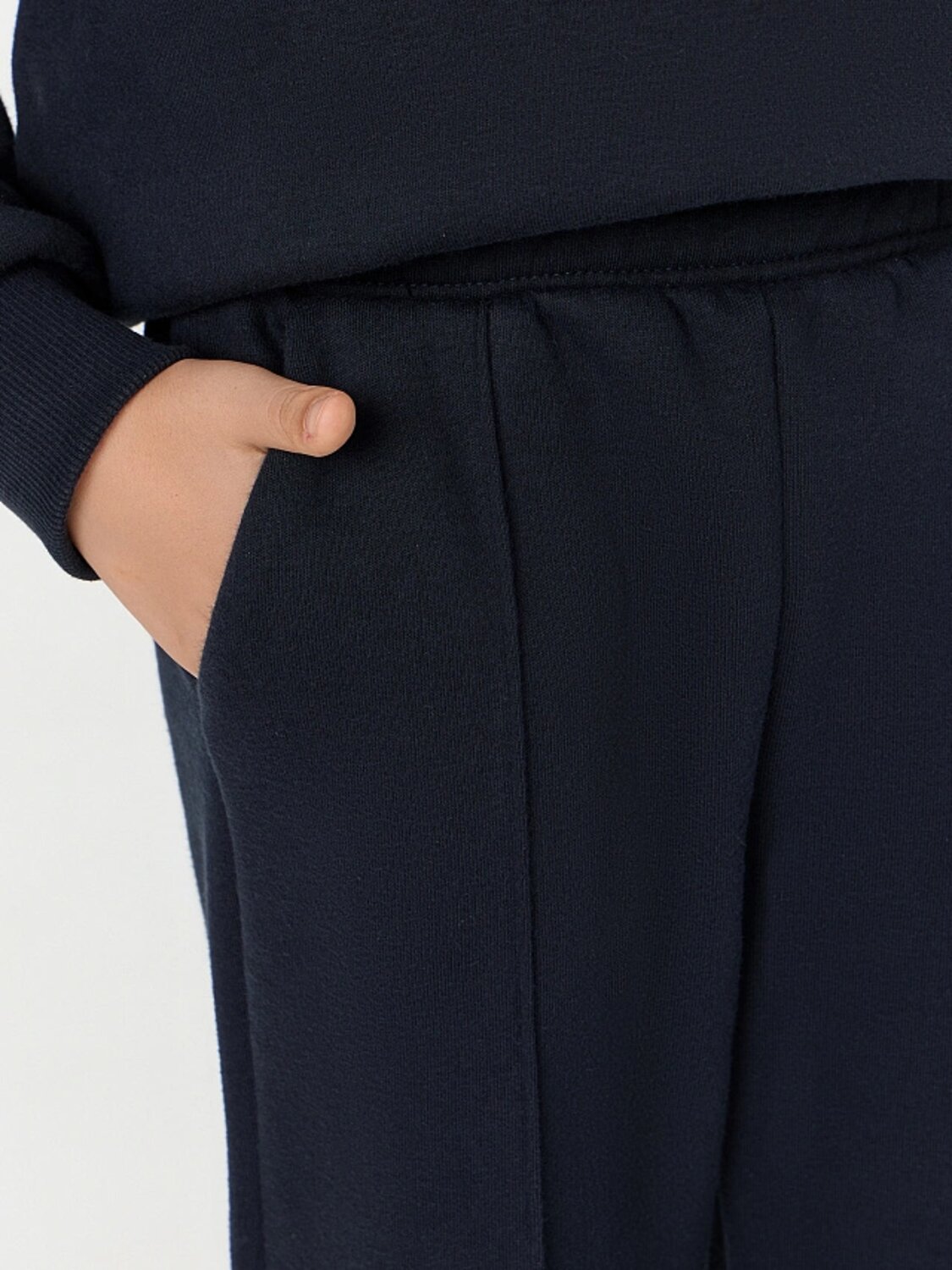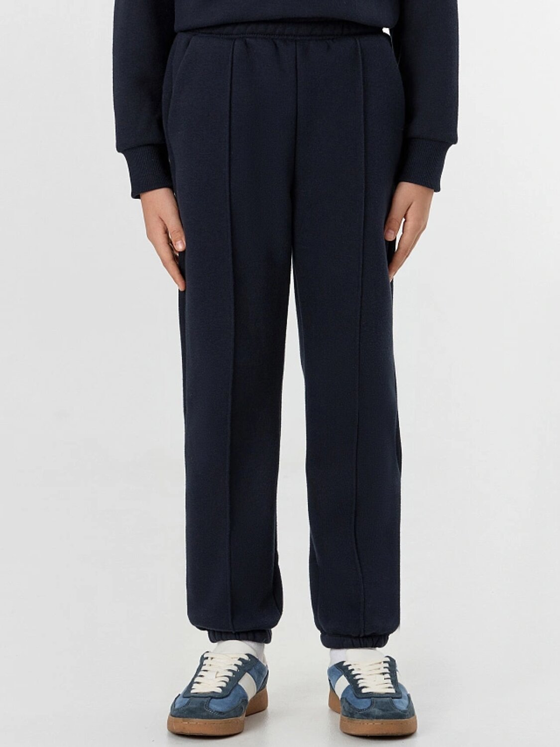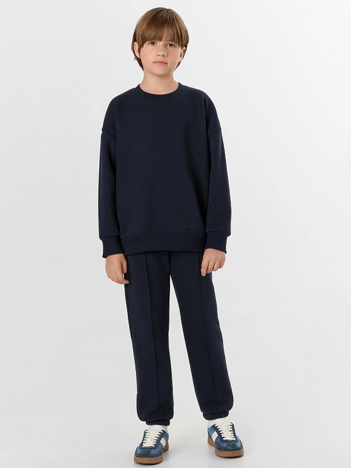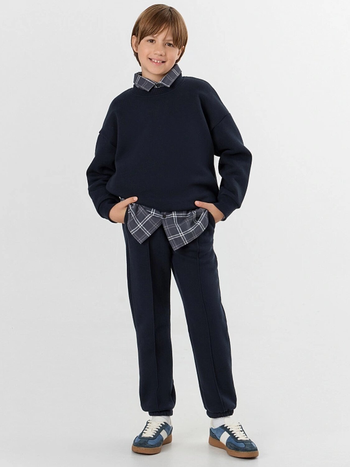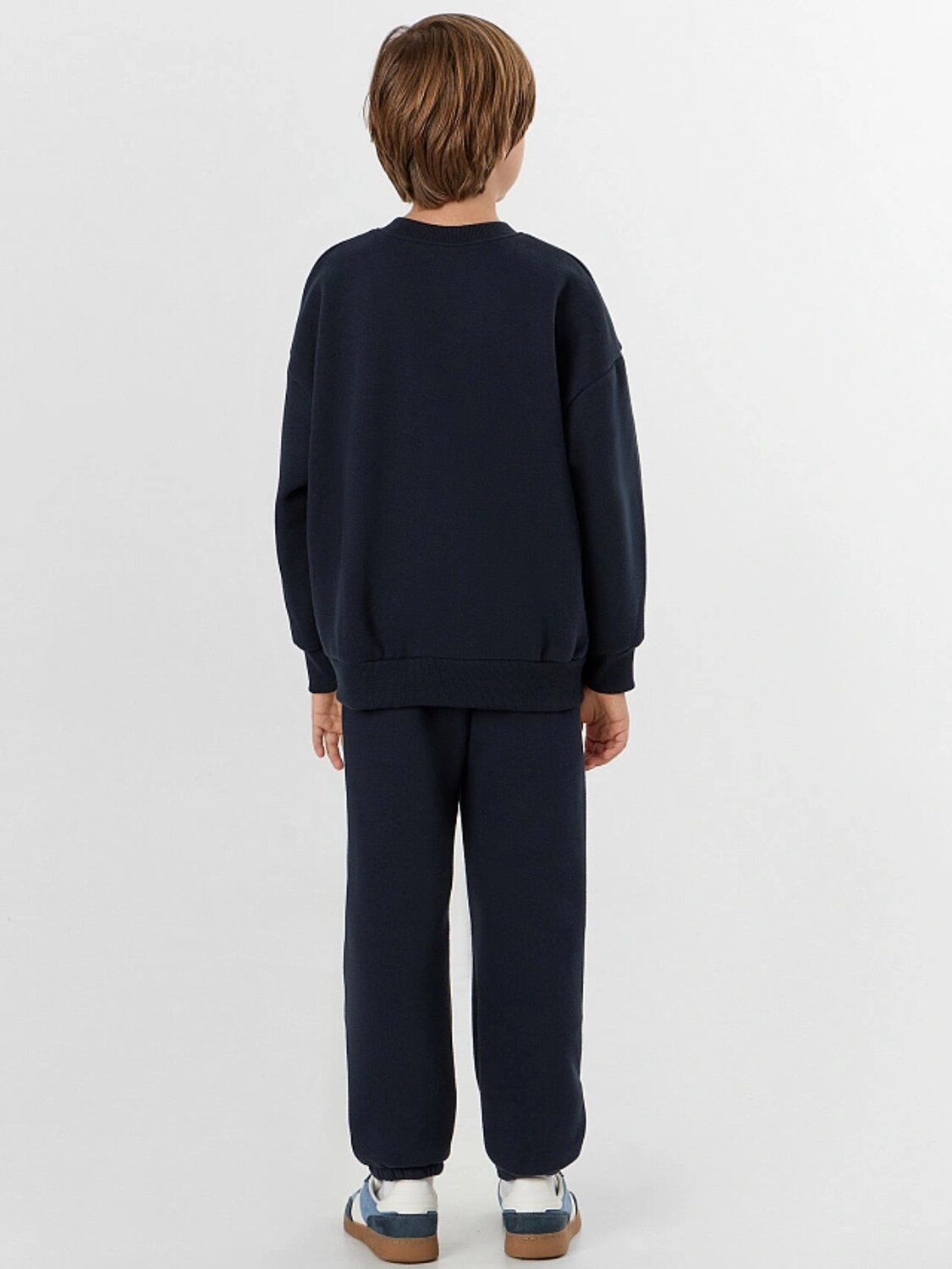 Свитшот прямого силуэта. Рукава длинные, втачные. Линия плеча спущена. Горловина круглой формы c окантовкой из рибаны. Низ рукавов и изделия обработаны рибаной . Брюки- джогеры с карманами с отрезным бочком. Пояс отрезной с внутренней эластичной тесьмой 40RV.На передних половинках выполнена декоративная отстрочка по центру. Низ изделия обработан швом в подгибку, внутрь застрочена эластичная тесьма 20RV.
