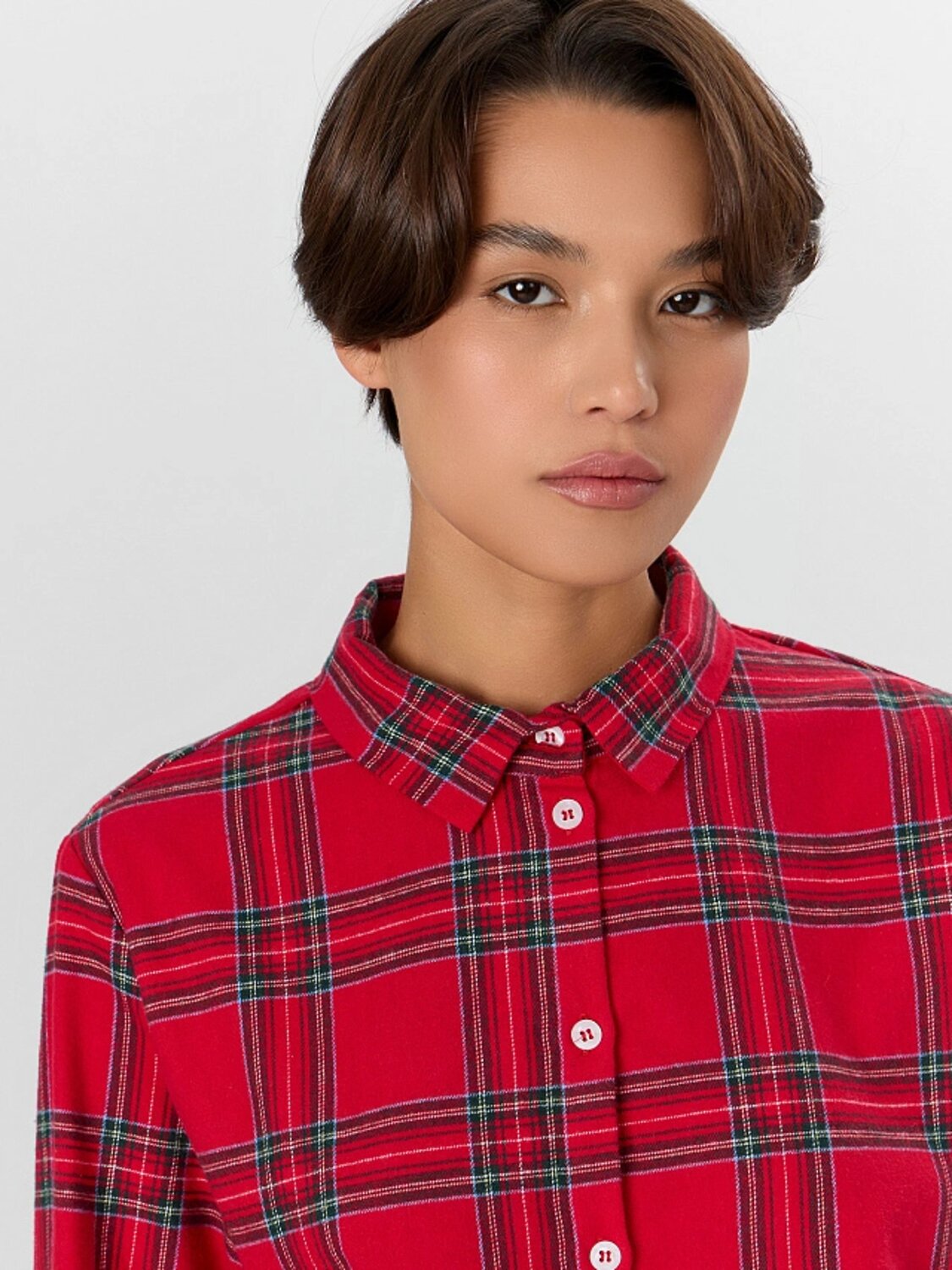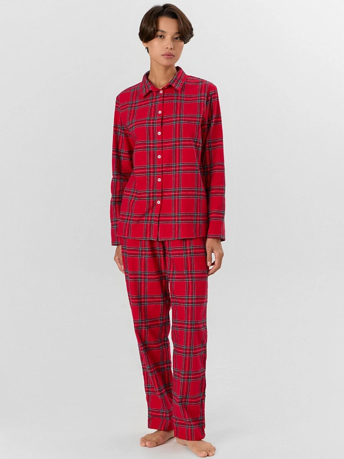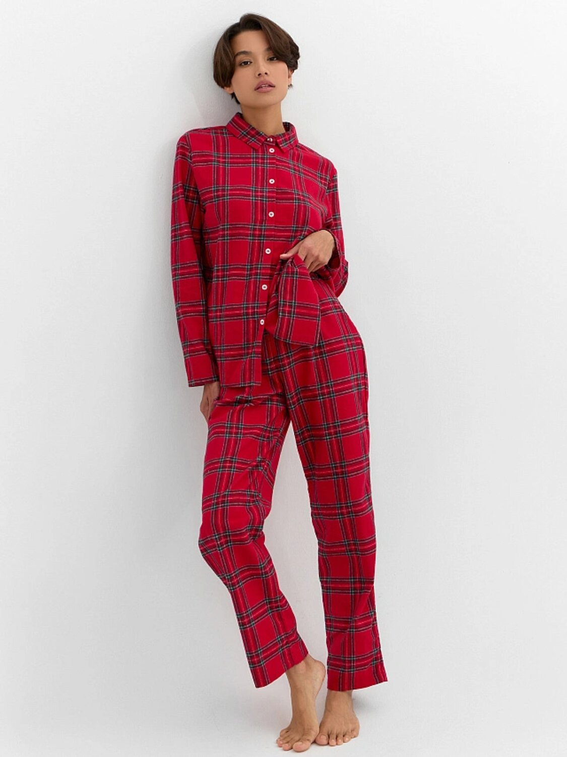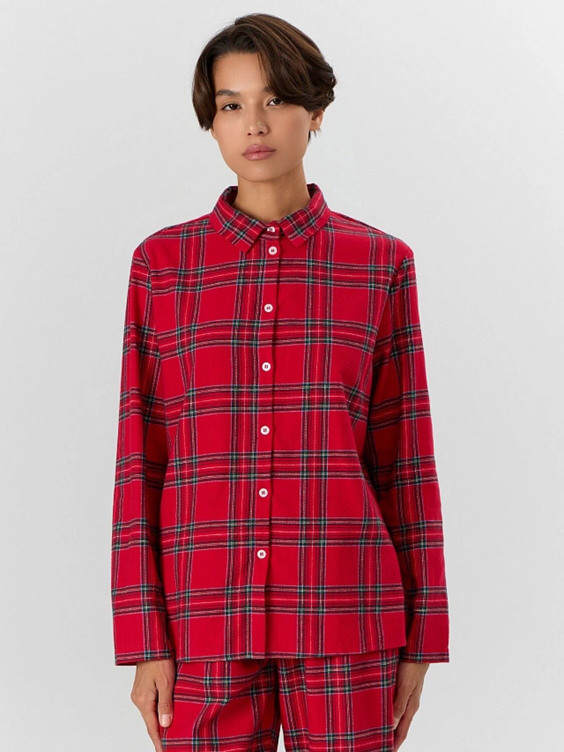 Пижама женская домашняя в клетку — это уют и гармония для вашего отдыха. Набор из рубашки и брюк выполнен из хлопка, который дарит коже нежность, воздух и комфорт. Свободный силуэт рубашки с заниженной линией плеч и длинными рукавами не сковывает движений, а застежка на пуговицы добавляет классическую элегантность.