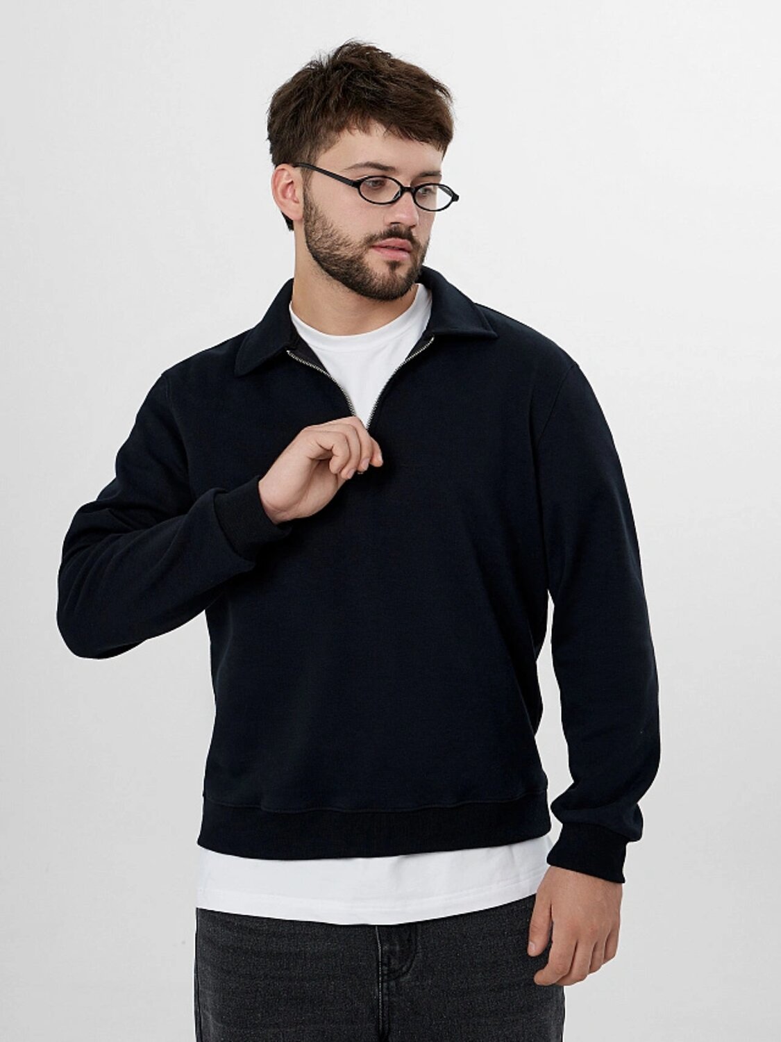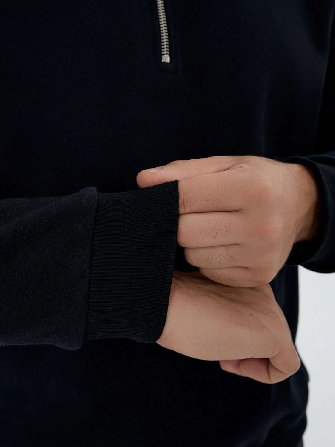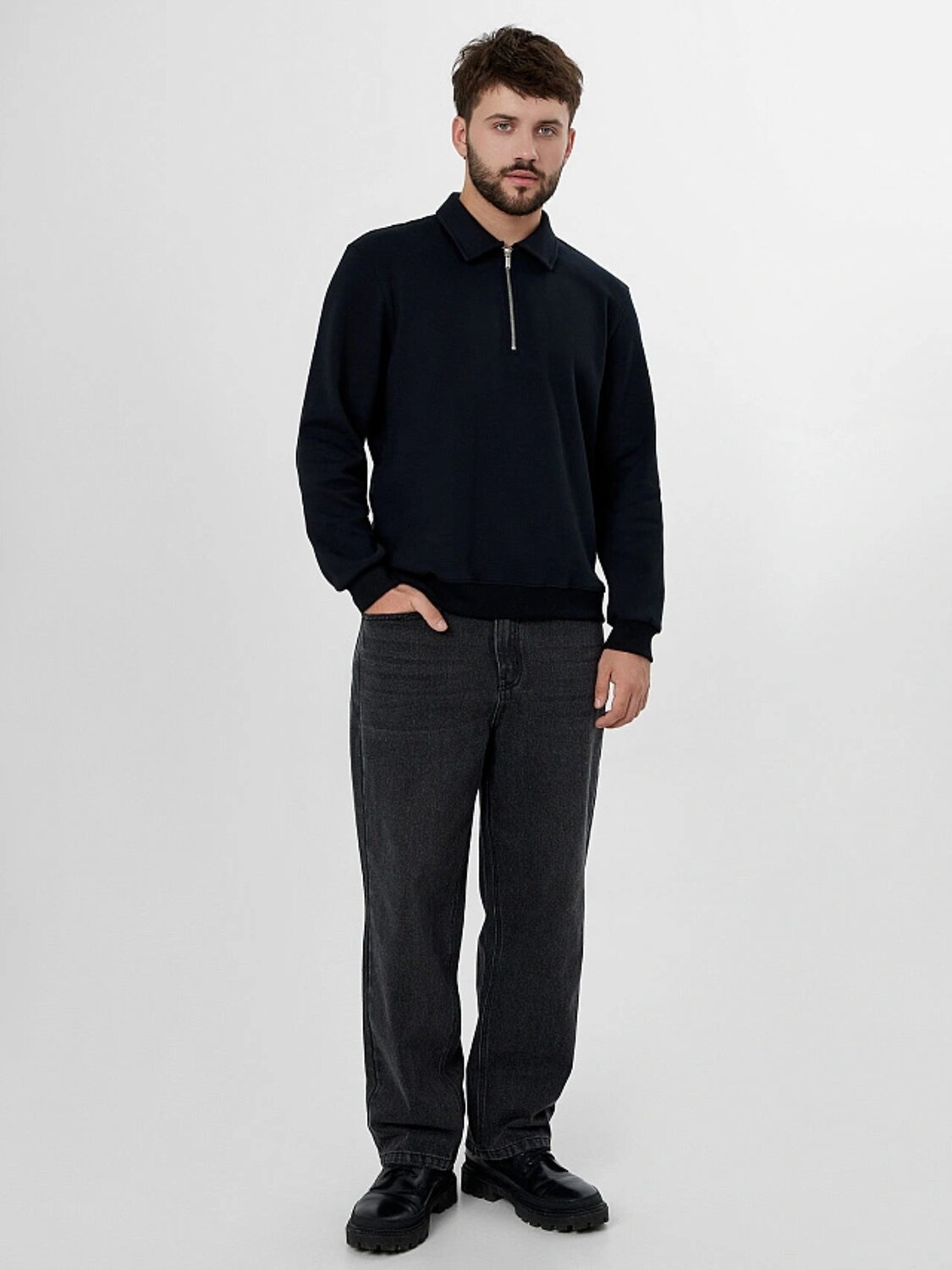 Мужской черный свитшот — это базовая вещь для создания современного образа. Модель выполнена из плотного хлопкового материала с добавлением полиэстера для сохранения формы. Удлиненные плечи и свободный крой обеспечивают комфорт и свободу движений. Короткий воротник-стойка мягко поддерживает шею, добавляя образу аккуратности.