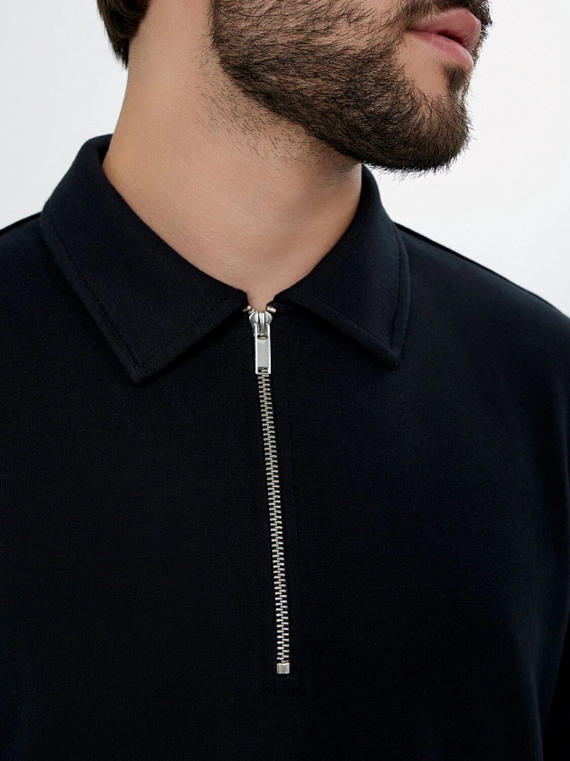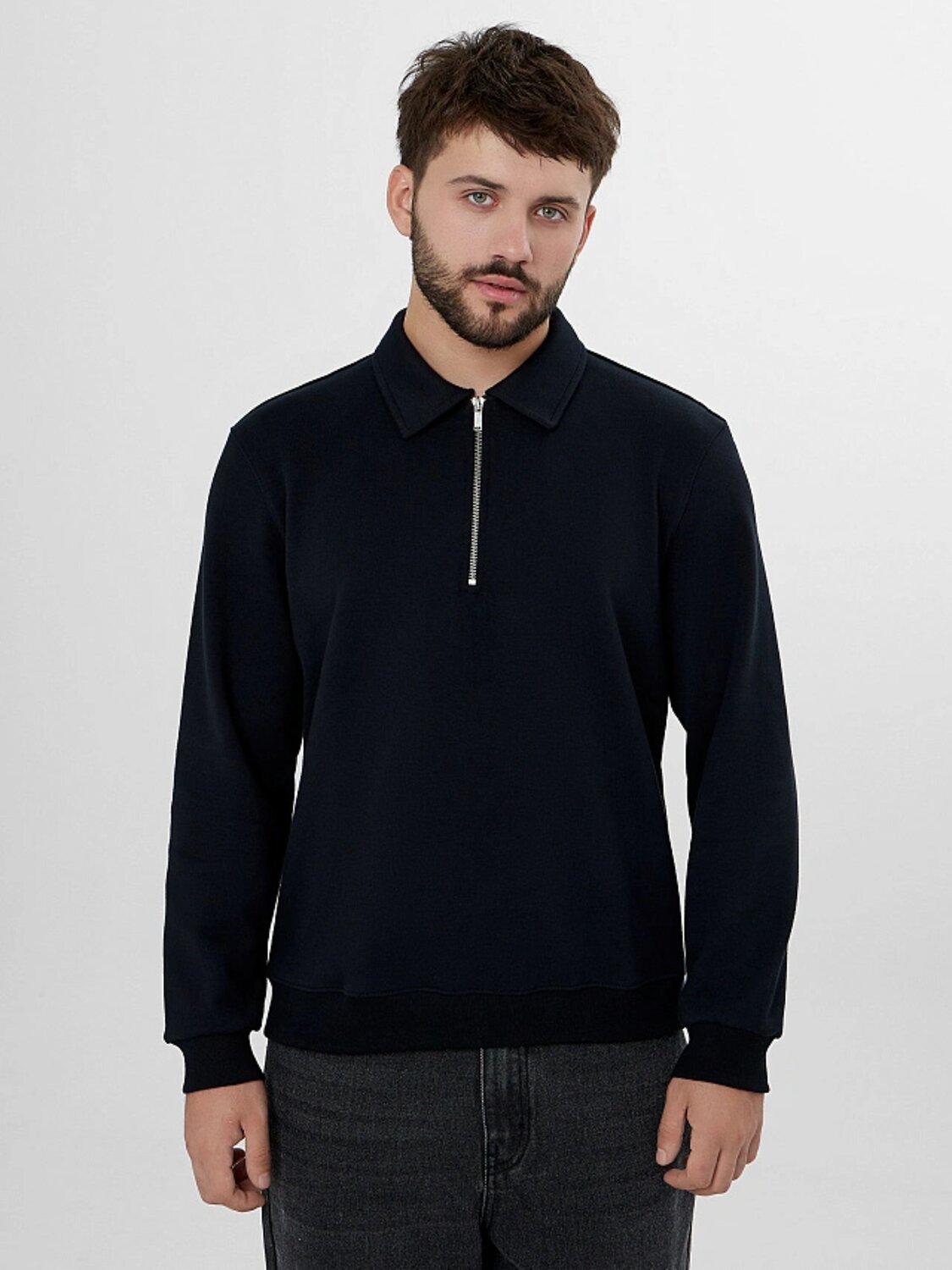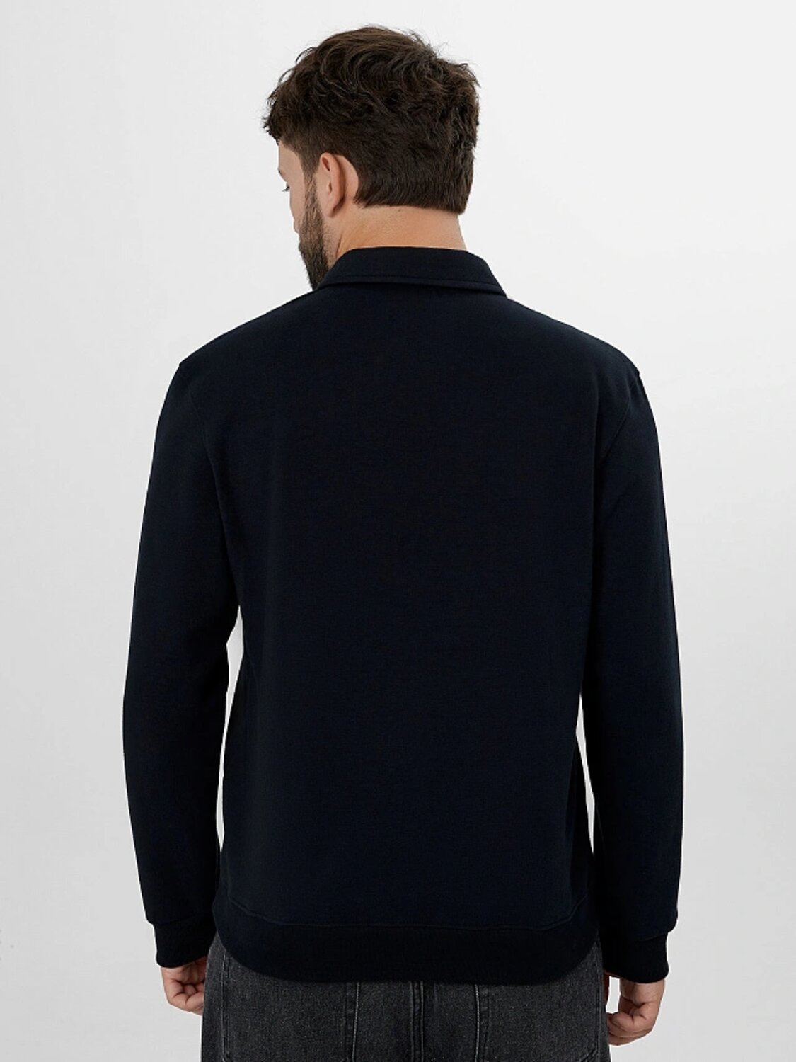 Мужской черный свитшот — это базовая вещь для создания современного образа. Модель выполнена из плотного хлопкового материала с добавлением полиэстера для сохранения формы. Удлиненные плечи и свободный крой обеспечивают комфорт и свободу движений. Короткий воротник-стойка мягко поддерживает шею, добавляя образу аккуратности.