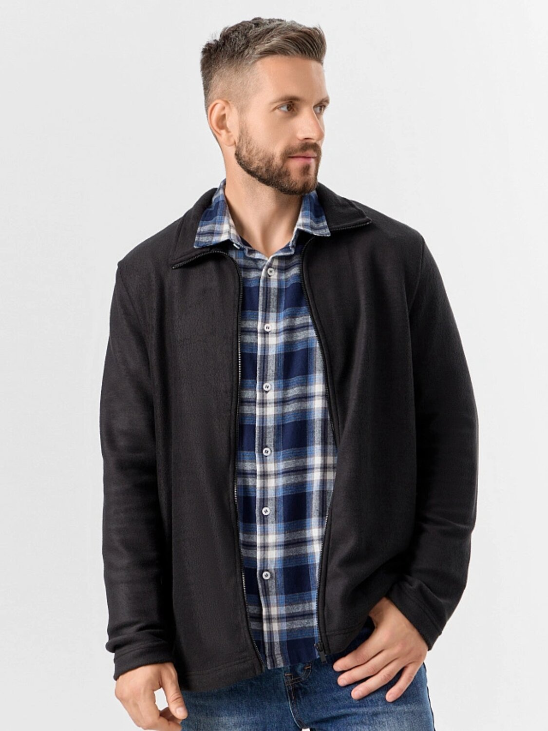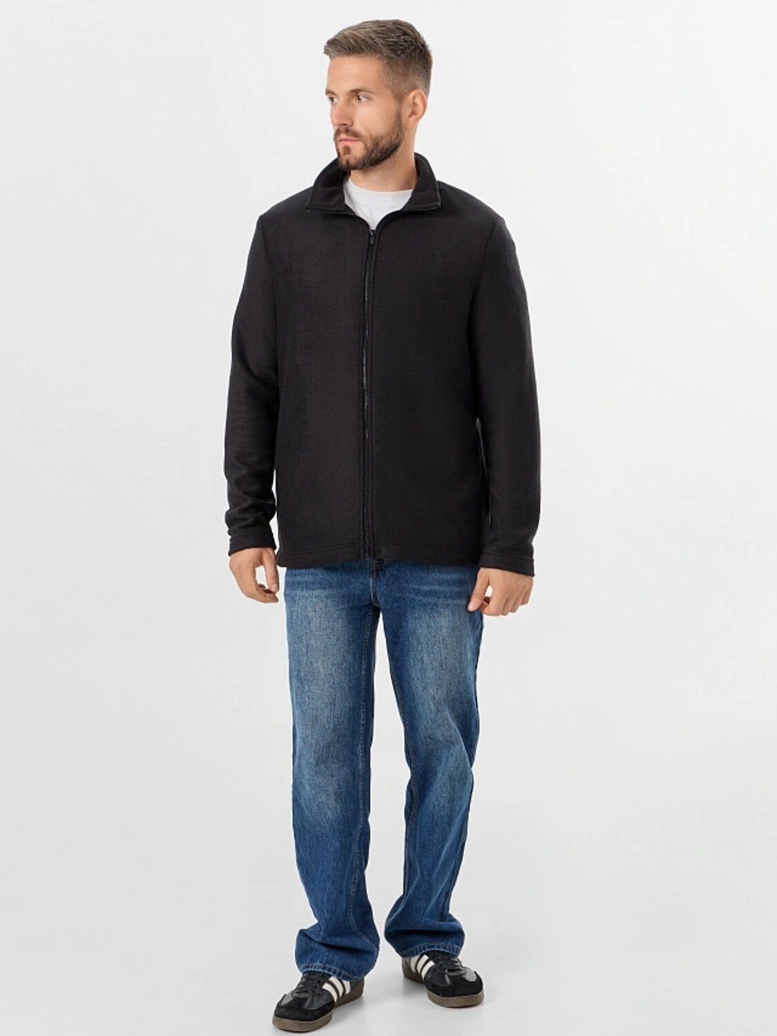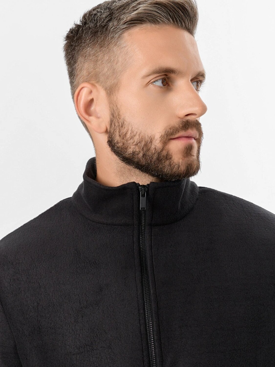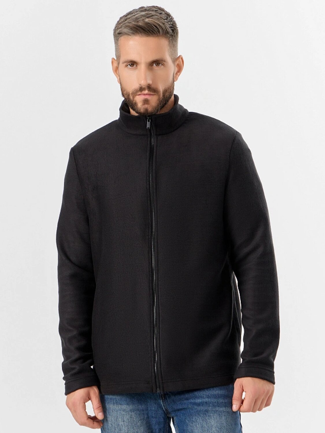 Толстовка мужская изготовлена из трикотажного полотна флис. Толстовка прямая. Горловина округлой формы с воротником стойкой из основного полотна. Рукава втачные длинные. Центральная застежка на тесьму-молнию. Карманы в боковых швах. Нижний срез изделия и рукавов обработан швом вподгибку.