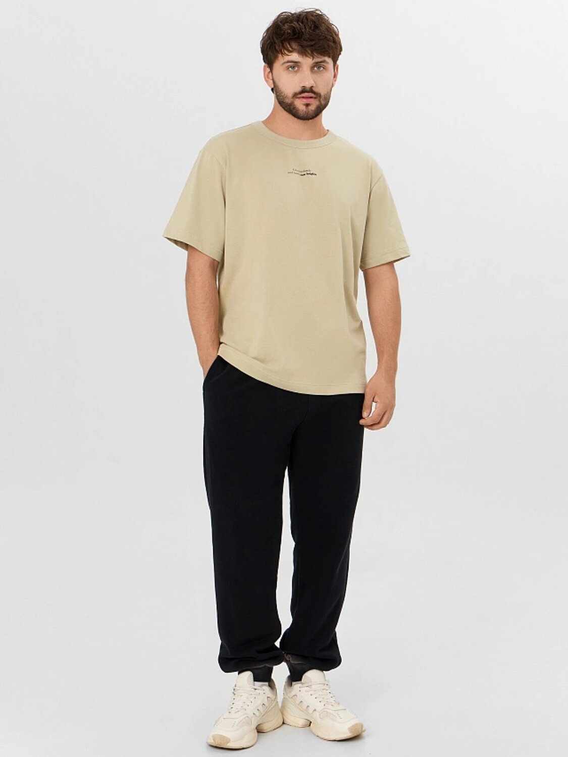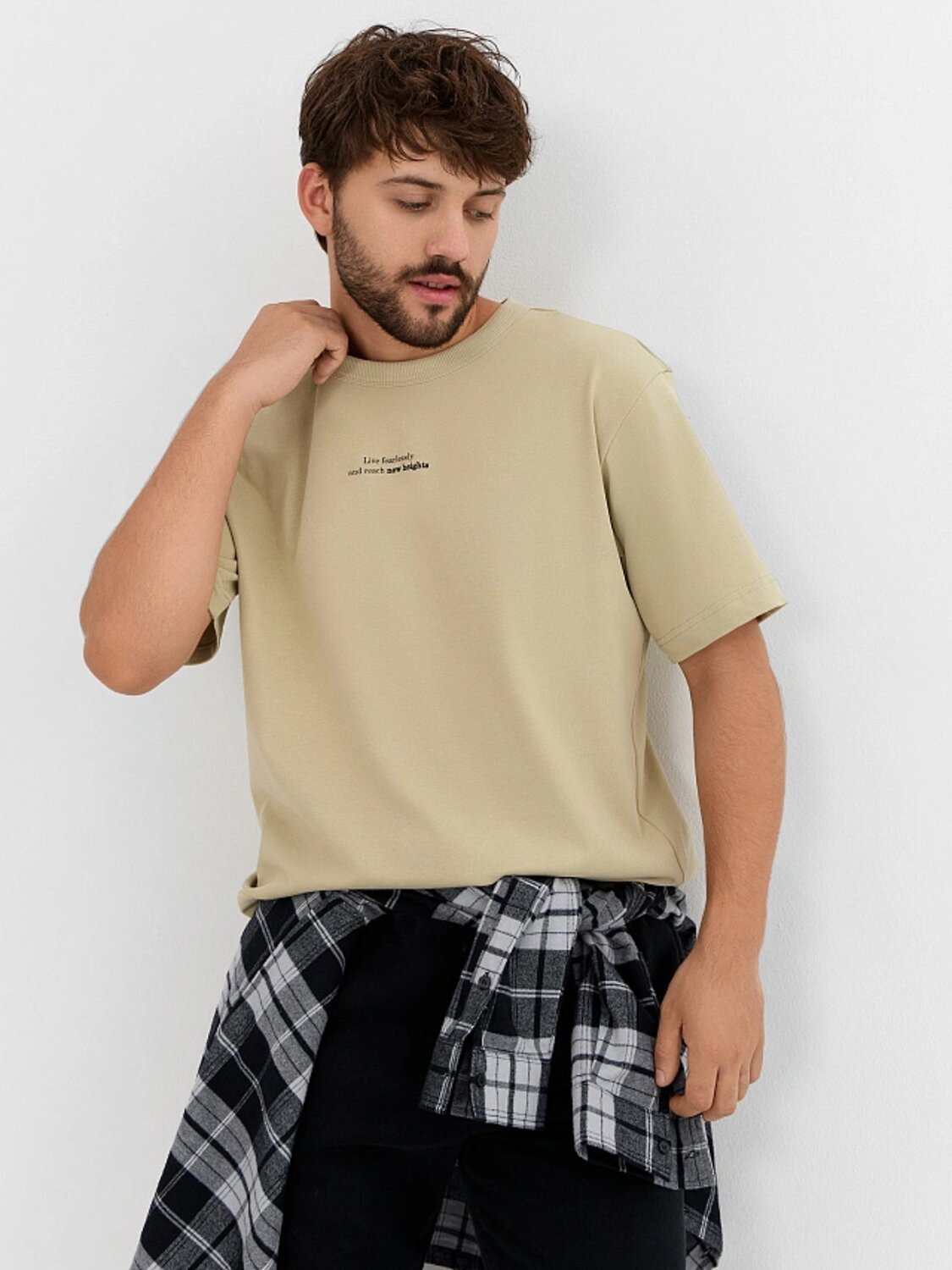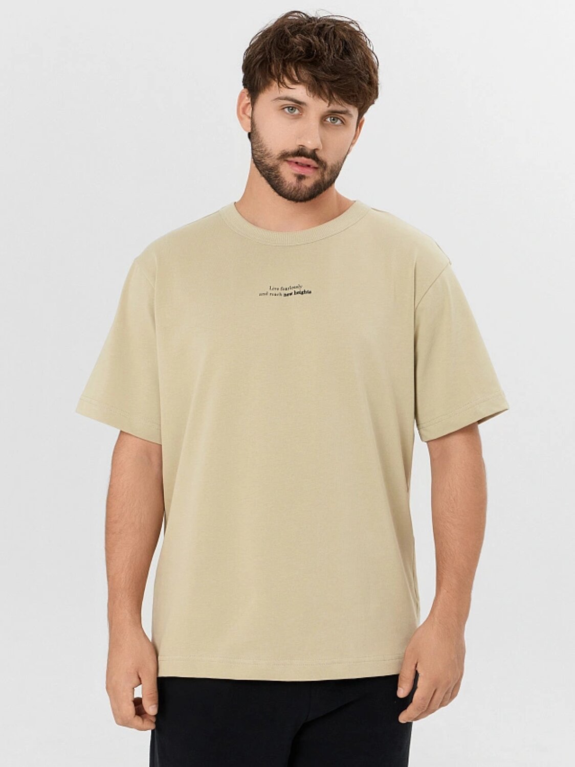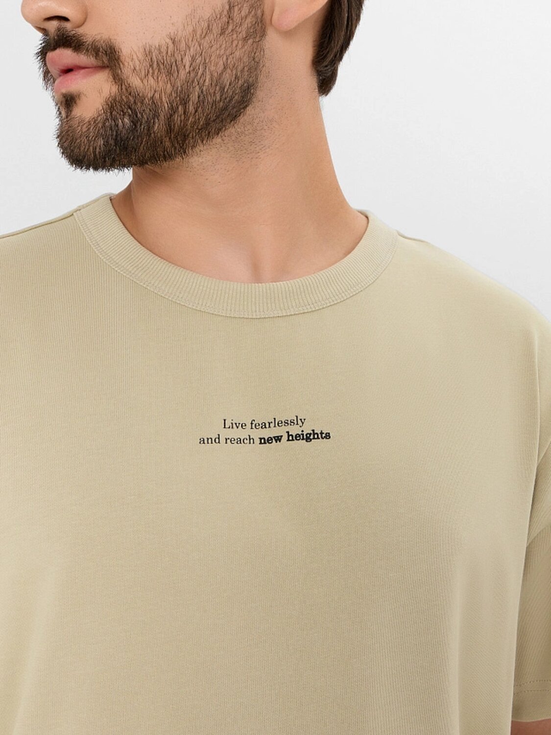 Мужская футболка с надписью "Life fearlessly and reach new heights" («Живи без страха и достигай новых высот») — это стиль с философией. Модель свободного прямого кроя выполнена из натурального хлопка, который обеспечивает легкость, воздухообмен и комфорт даже в жаркие дни. Округлая горловина и слегка спущенные плечи создают расслабленный силуэт, а короткие рукава и аккуратная обработка швов гарантируют удобство. Надпись с мотивирующим посылом добавляет образу уверенности и целеустремленности.