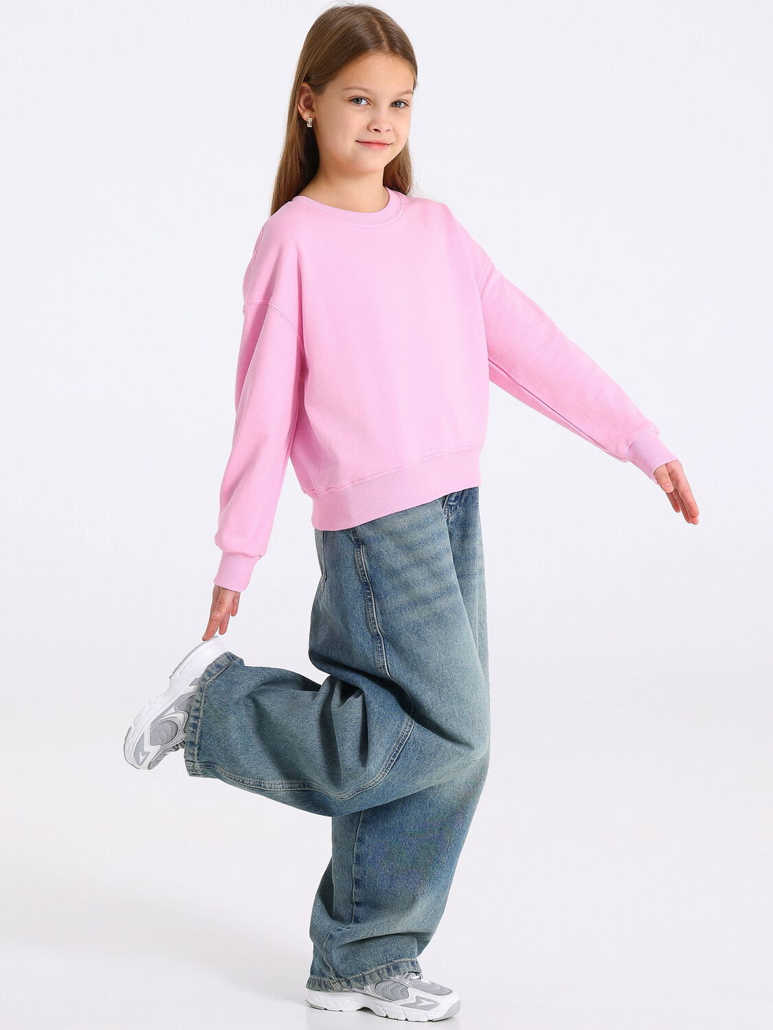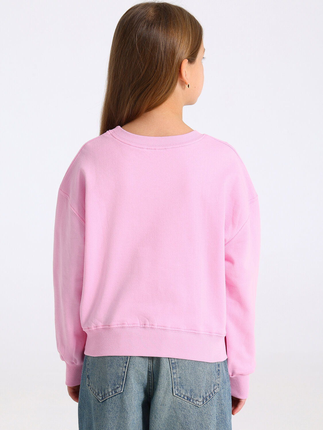 Свитшот для девочки из футера - плотного теплого хлопкового полотна. Изделие свободного силуэта со спущенным плечом и поясом по низу изделия. Рукава длинные с манжетами. Уход: только машинная стирка (руками не стирать!) при температуре 40 градусов, без предварительного замачивания.
