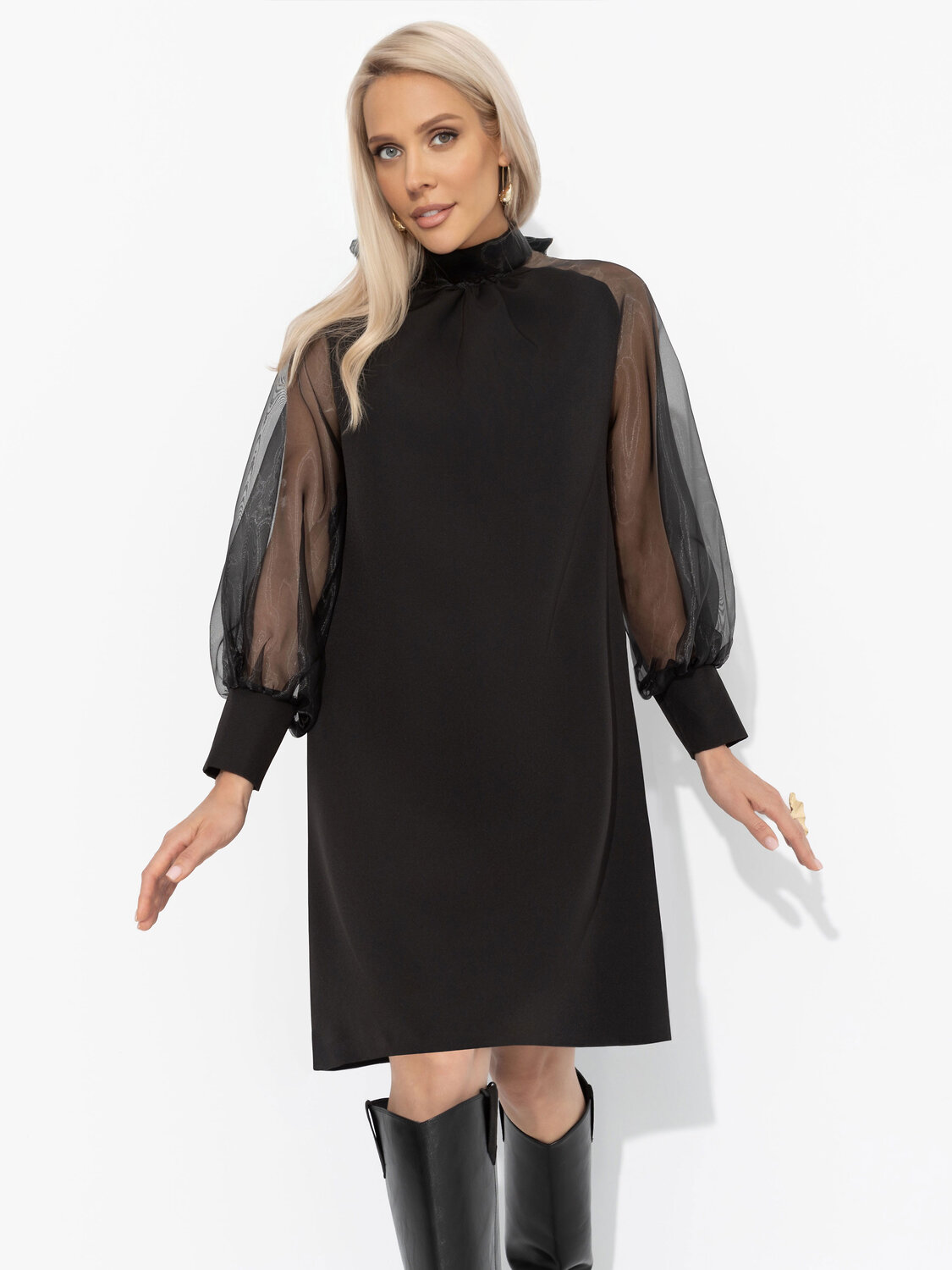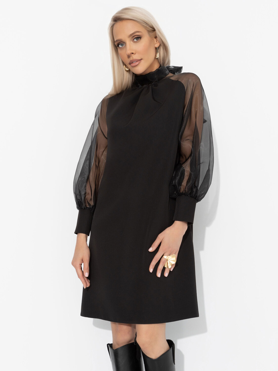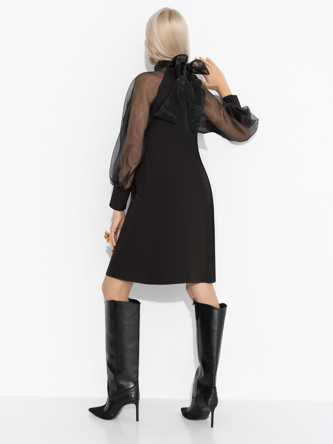 Воплощение вечной элегантности Коко Шанель от ЧАРУТТИ. Идеальный силуэт как симфония безупречного вкуса и сдержанной чувственности. Органза на рукавах добавляет шлейф тайны, напоминая о парижских вечерах, где каждая деталь — намёк на изысканность. Она не просто одета, она облачена в наследие, которое никогда не выйдет из моды. Платье трапециевидного силуэта в длине до колена. Длинные рукава сделаны из тонкой органзы в тон изделия. Платье хорошо смотрится на любом типе фигуры. Воротник-стойка, сзади оформлен бантом из органзы.