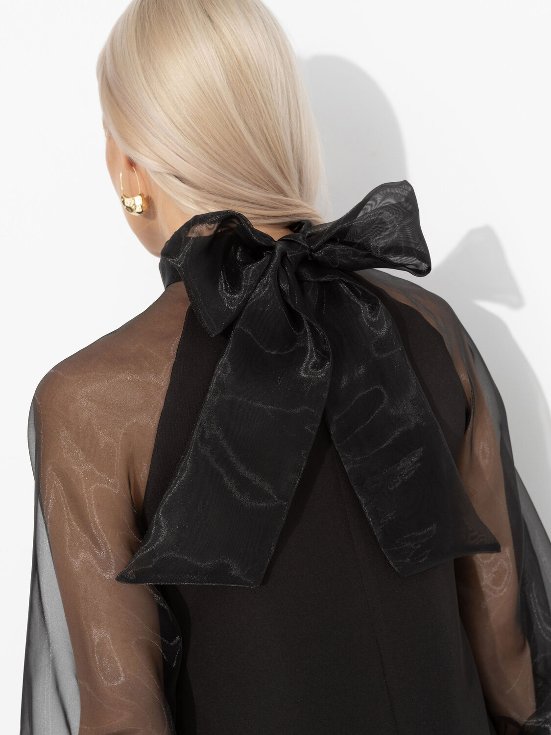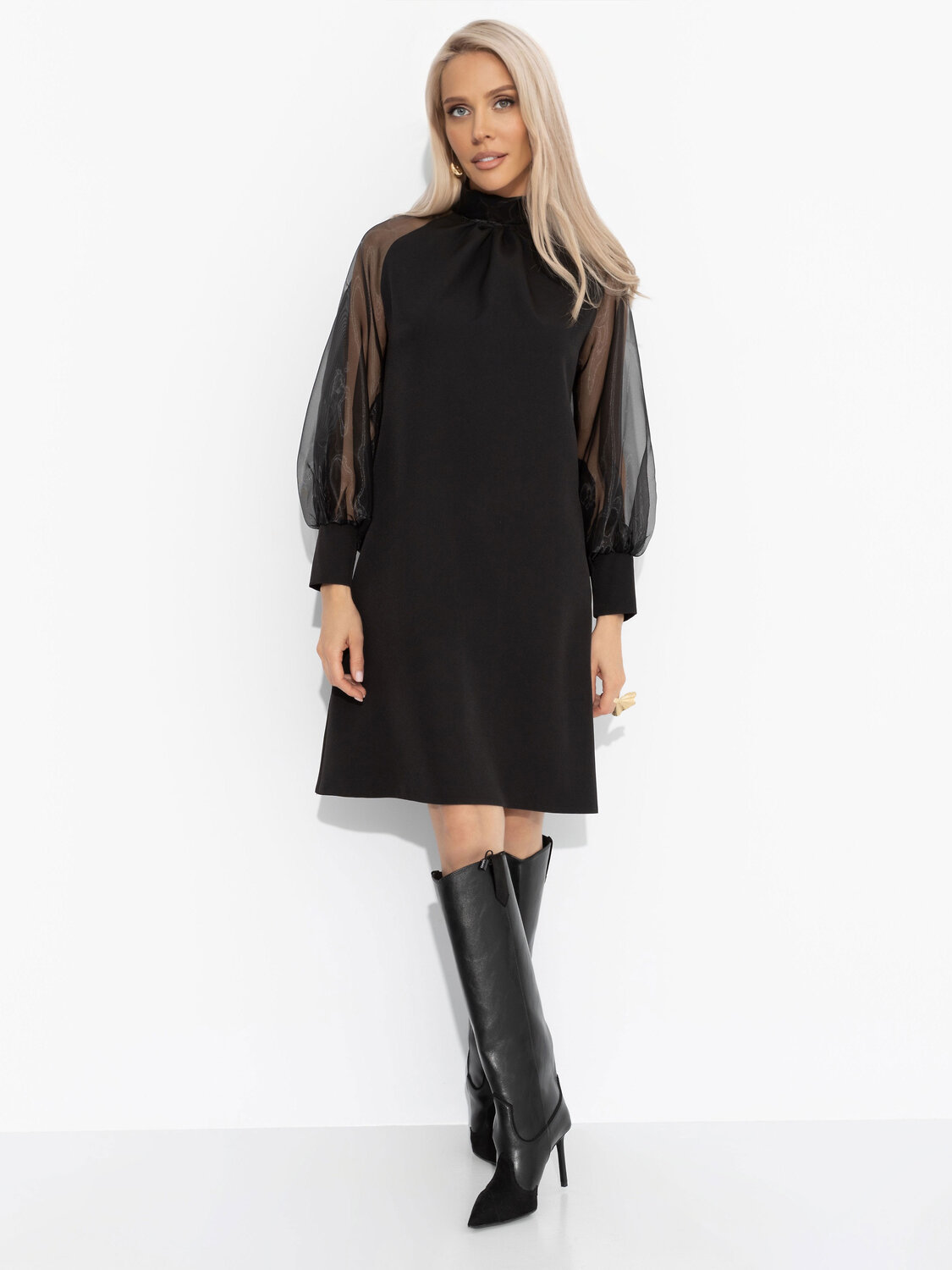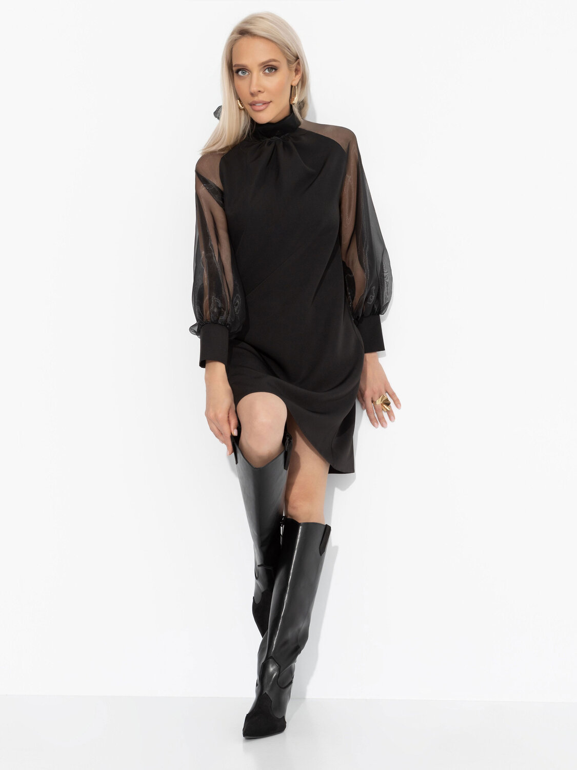 Воплощение вечной элегантности Коко Шанель от ЧАРУТТИ. Идеальный силуэт как симфония безупречного вкуса и сдержанной чувственности. Органза на рукавах добавляет шлейф тайны, напоминая о парижских вечерах, где каждая деталь — намёк на изысканность. Она не просто одета, она облачена в наследие, которое никогда не выйдет из моды. Платье трапециевидного силуэта в длине до колена. Длинные рукава сделаны из тонкой органзы в тон изделия. Платье хорошо смотрится на любом типе фигуры. Воротник-стойка, сзади оформлен бантом из органзы.