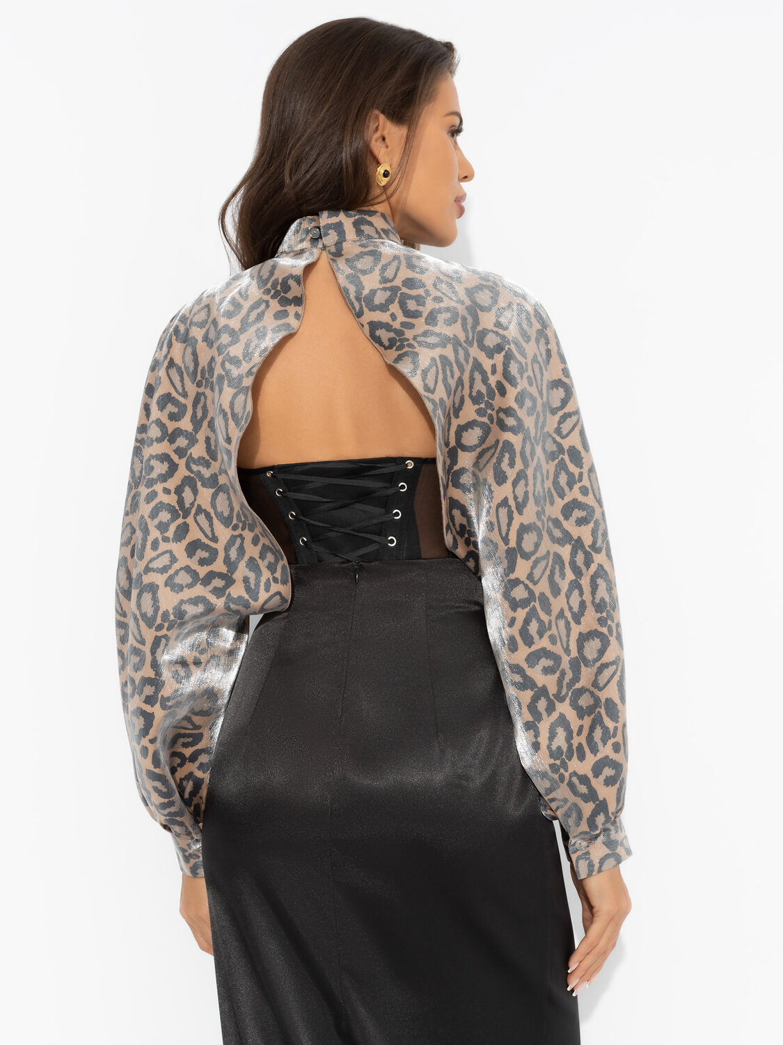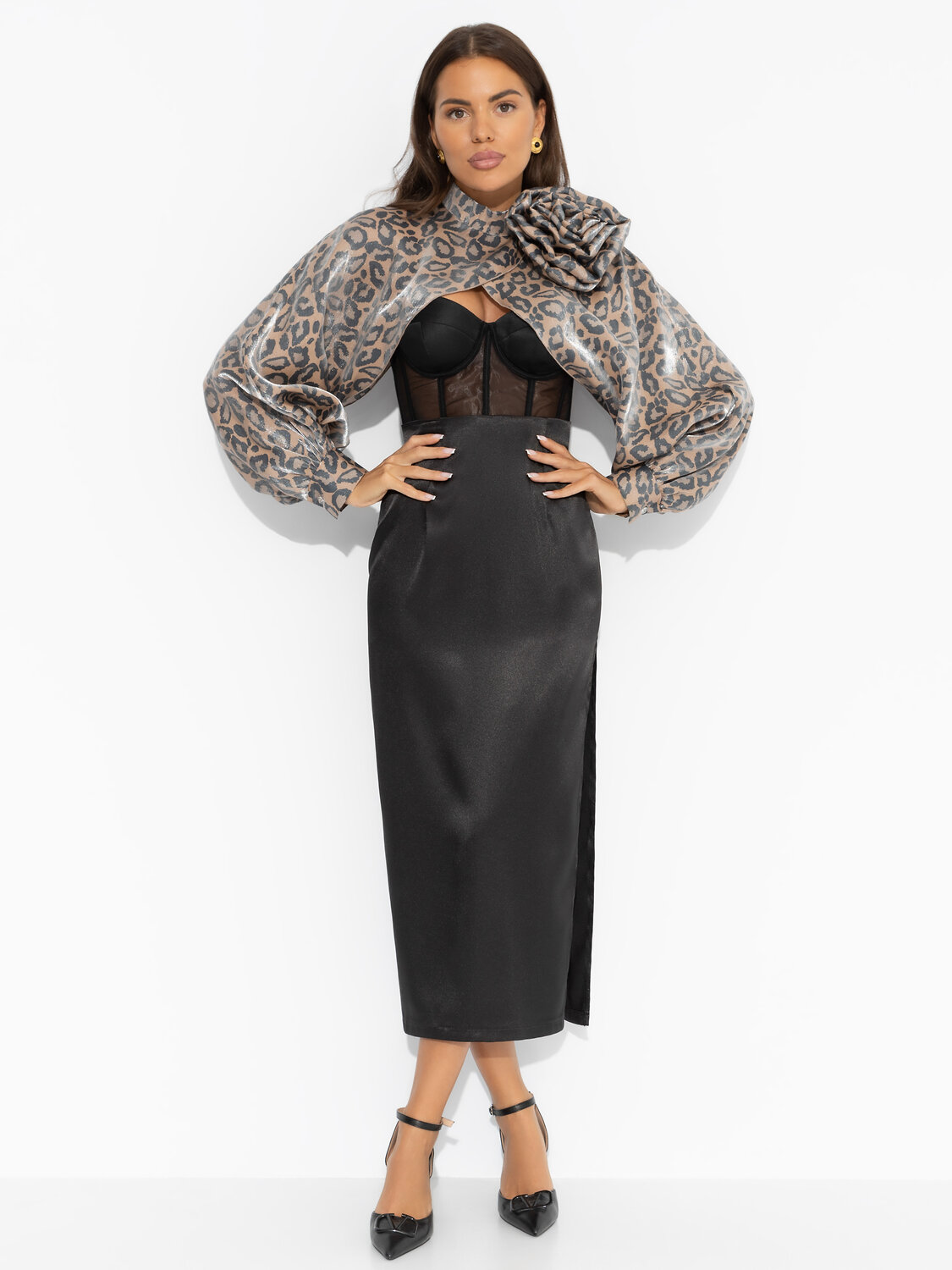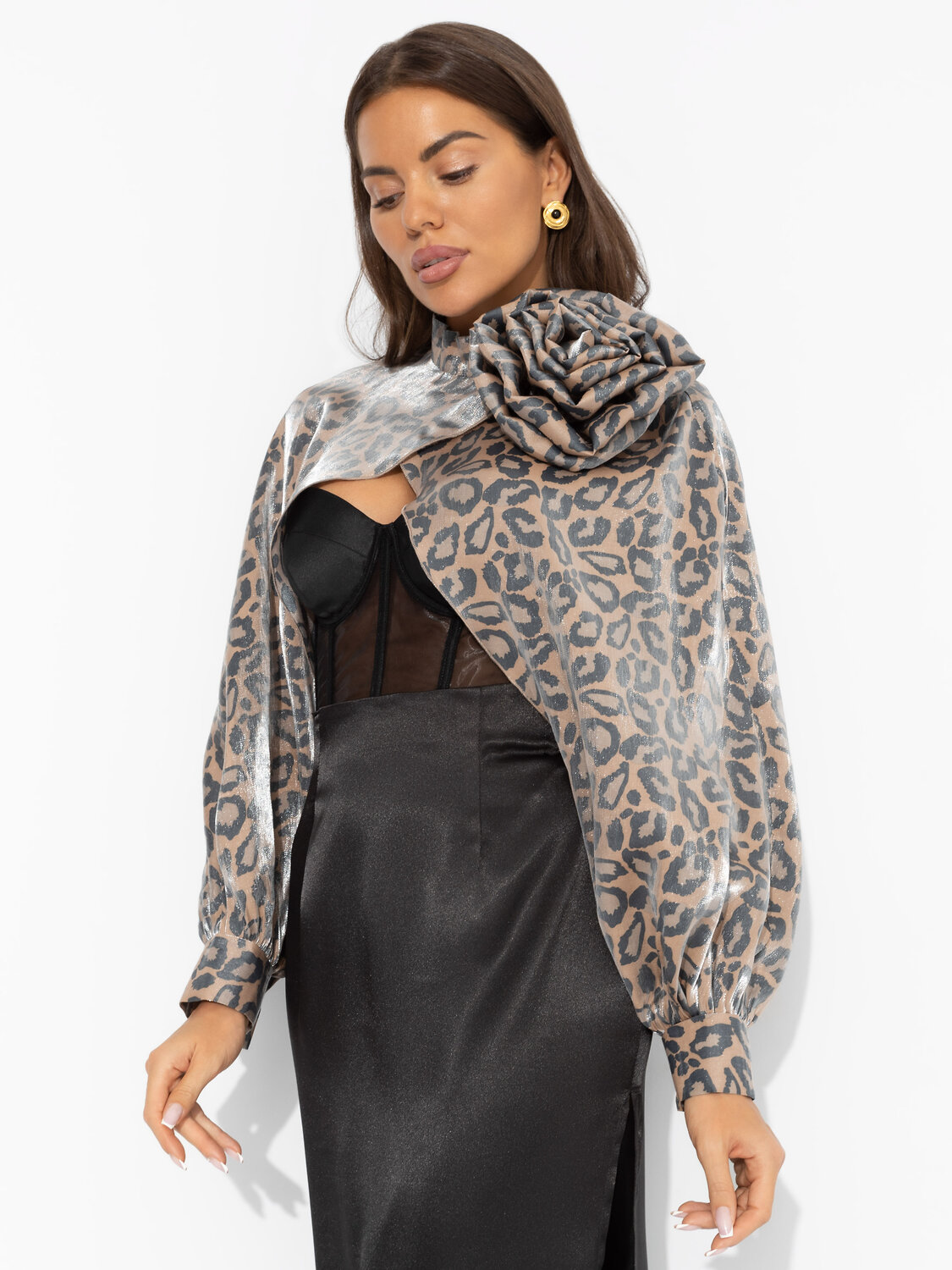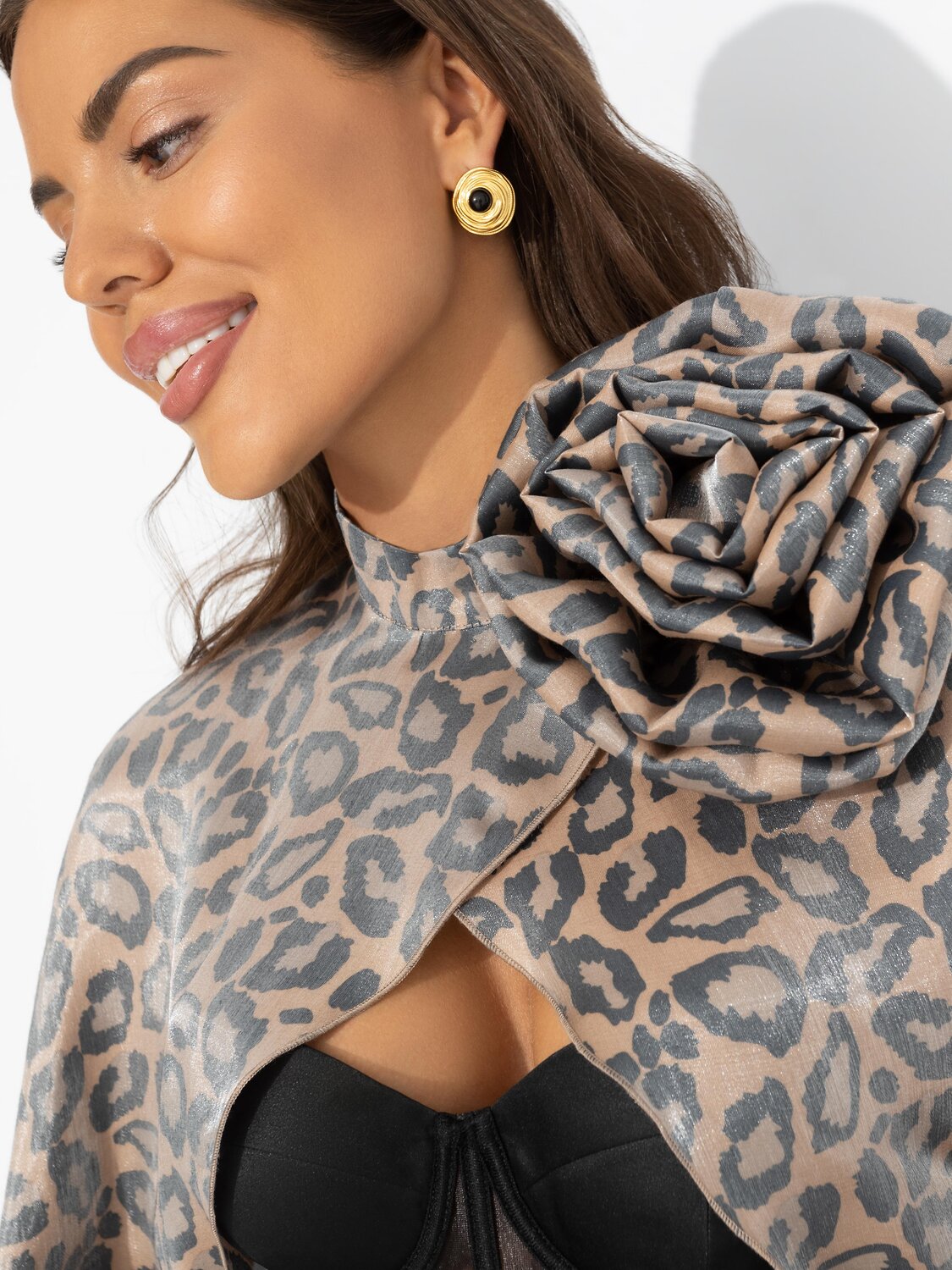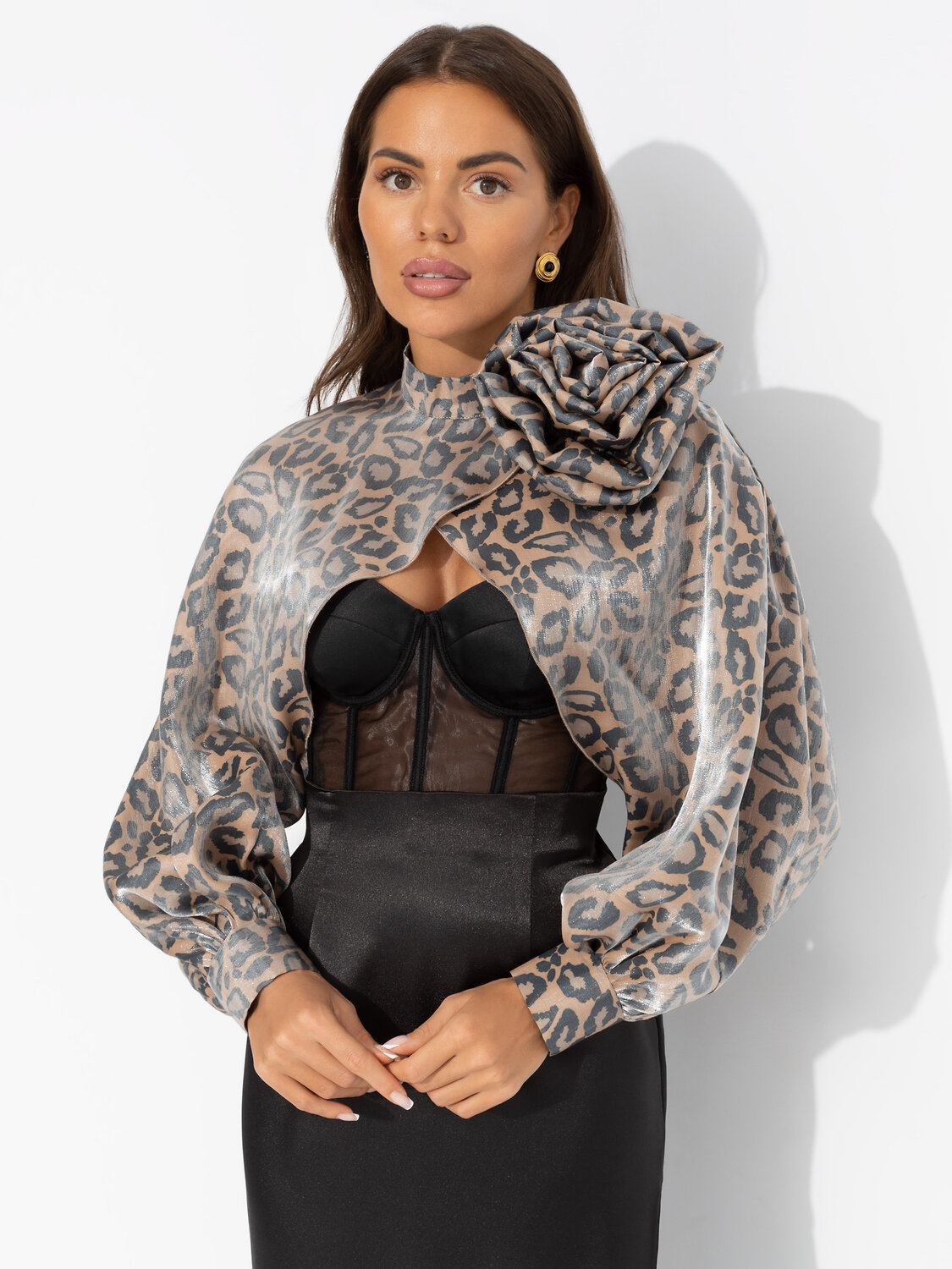 Для тех, кто избегает масштабного леопардового принта, дизайнеры ЧАРУТТИ создали болеро. Добавляйте дозированную порцию анималистичной расцветки в любые образы – с джинсами, вечерними платьями или деловыми юбками. Болеро из мерцающей органзы со свободными рукавами. Брошь-роза съемная. Деликатная пуговица в тон изделия сзади.