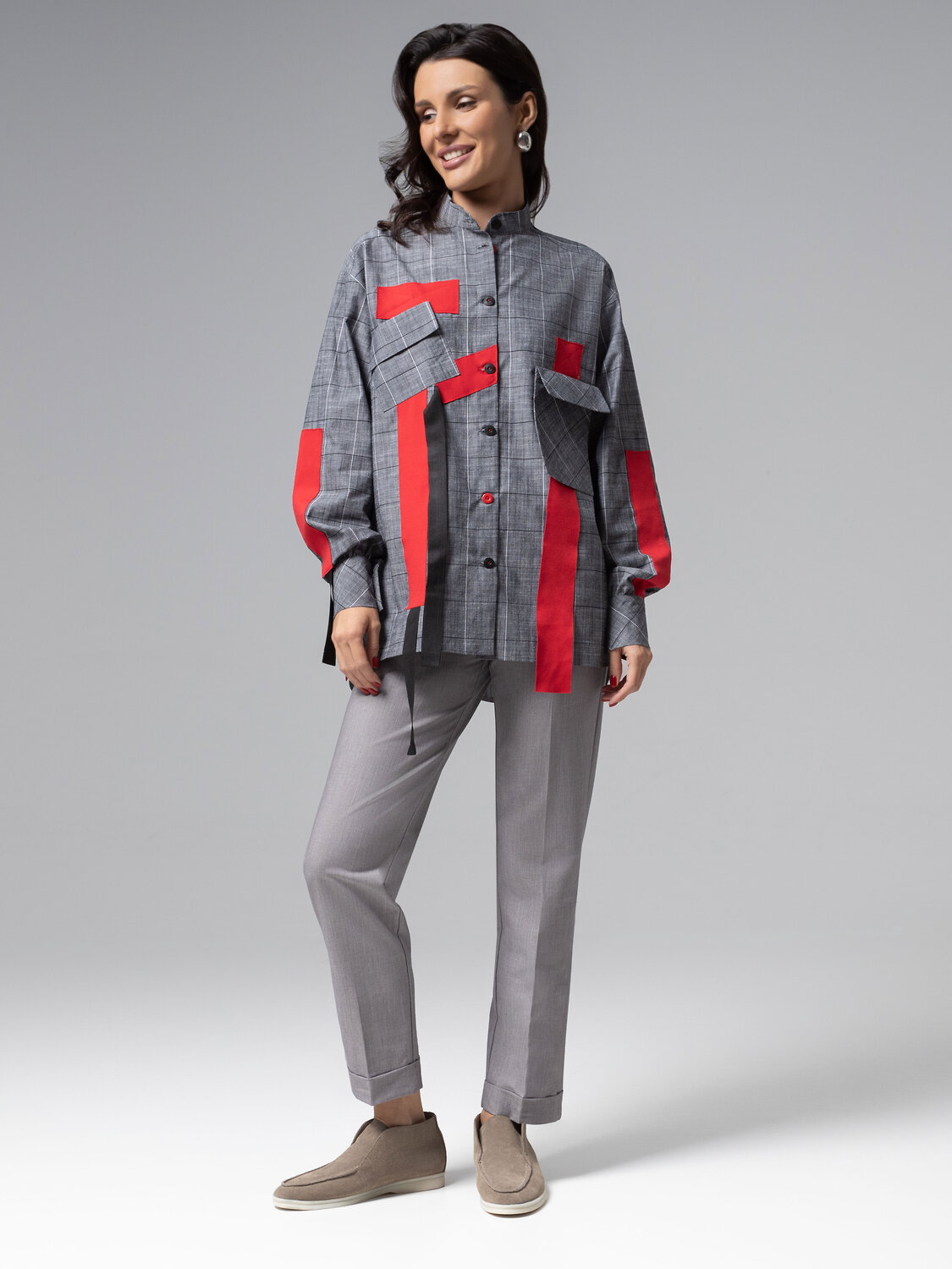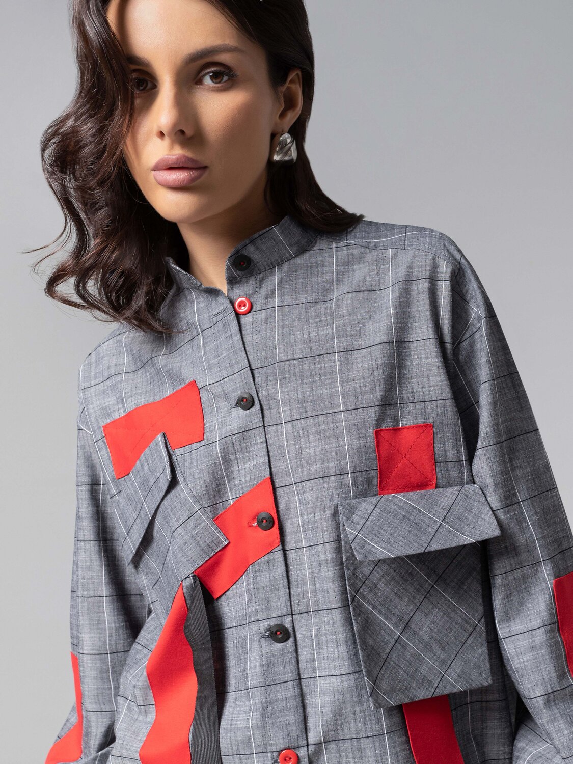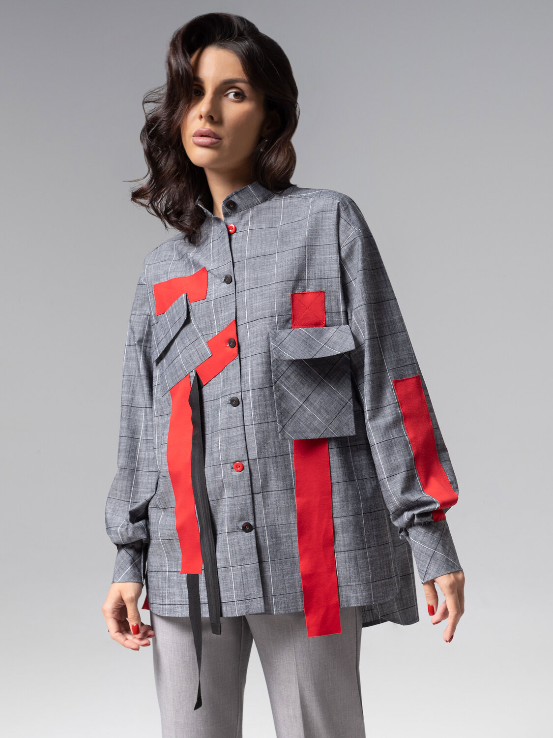 Элегантное противостояние традициям в рубашке ЧАРУТТИ. Асимметричные ленты радикального красного цвета разрезают серый холст хлопка премиального качества. Это модный манифест против канонов классического стиля. Смещенные карманы бросают вызов симметрии, превращая утилитарные детали в элементы концептуального искусства. Игра пропорций подчеркивается свободным силуэтом, где нарочитая небрежность кроя скрывает выверенную точность конструкторского расчета.