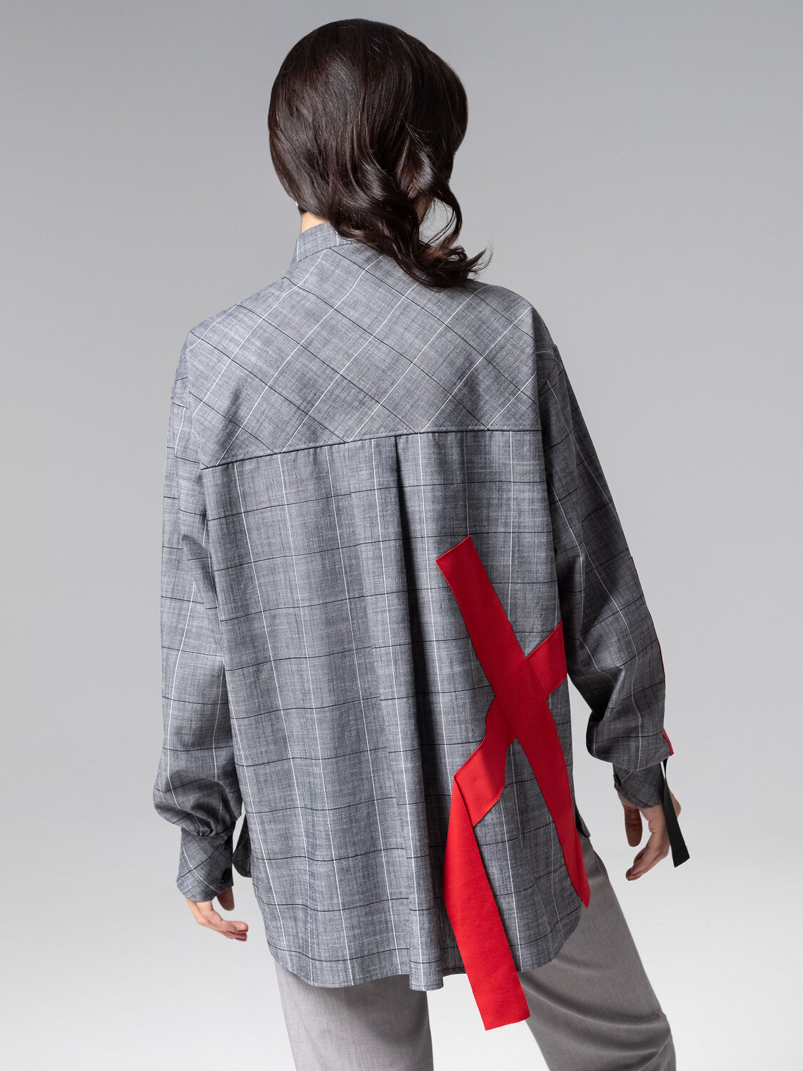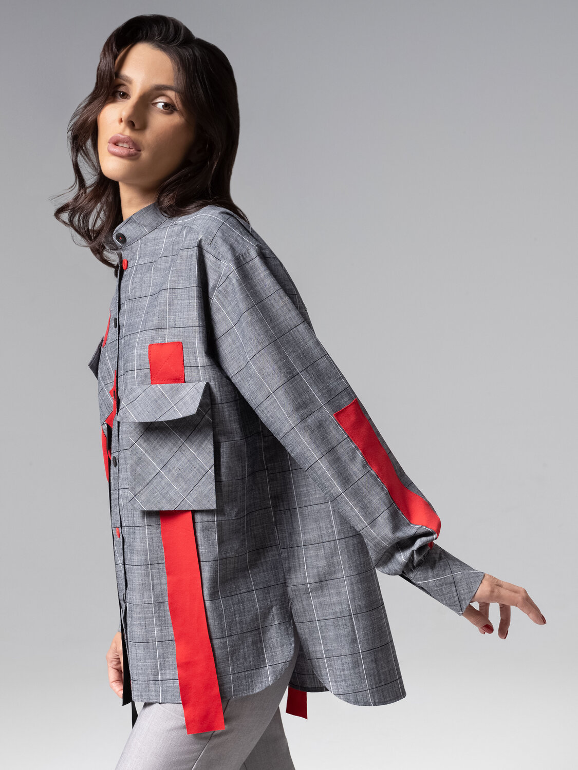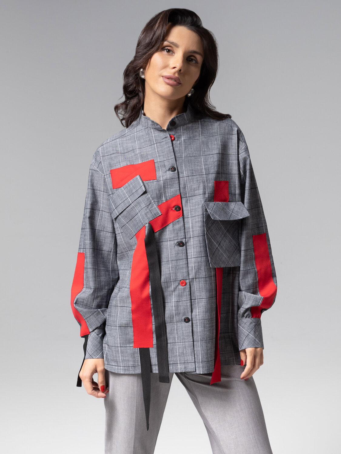 Элегантное противостояние традициям в рубашке ЧАРУТТИ. Асимметричные ленты радикального красного цвета разрезают серый холст хлопка премиального качества. Это модный манифест против канонов классического стиля. Смещенные карманы бросают вызов симметрии, превращая утилитарные детали в элементы концептуального искусства. Игра пропорций подчеркивается свободным силуэтом, где нарочитая небрежность кроя скрывает выверенную точность конструкторского расчета.