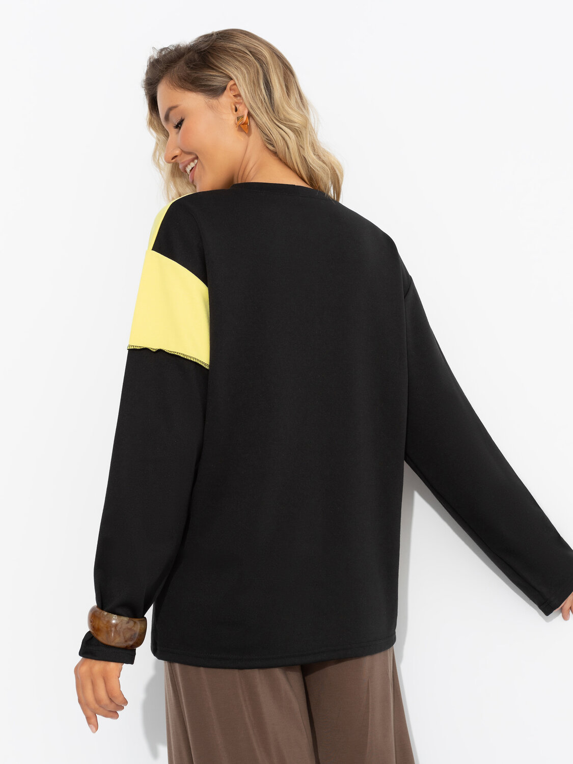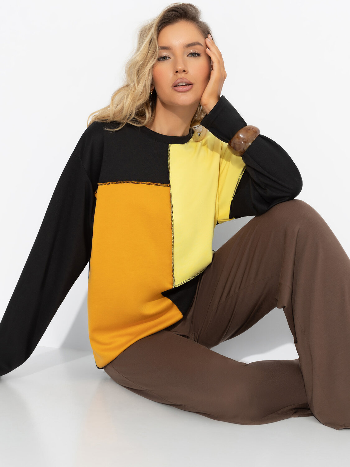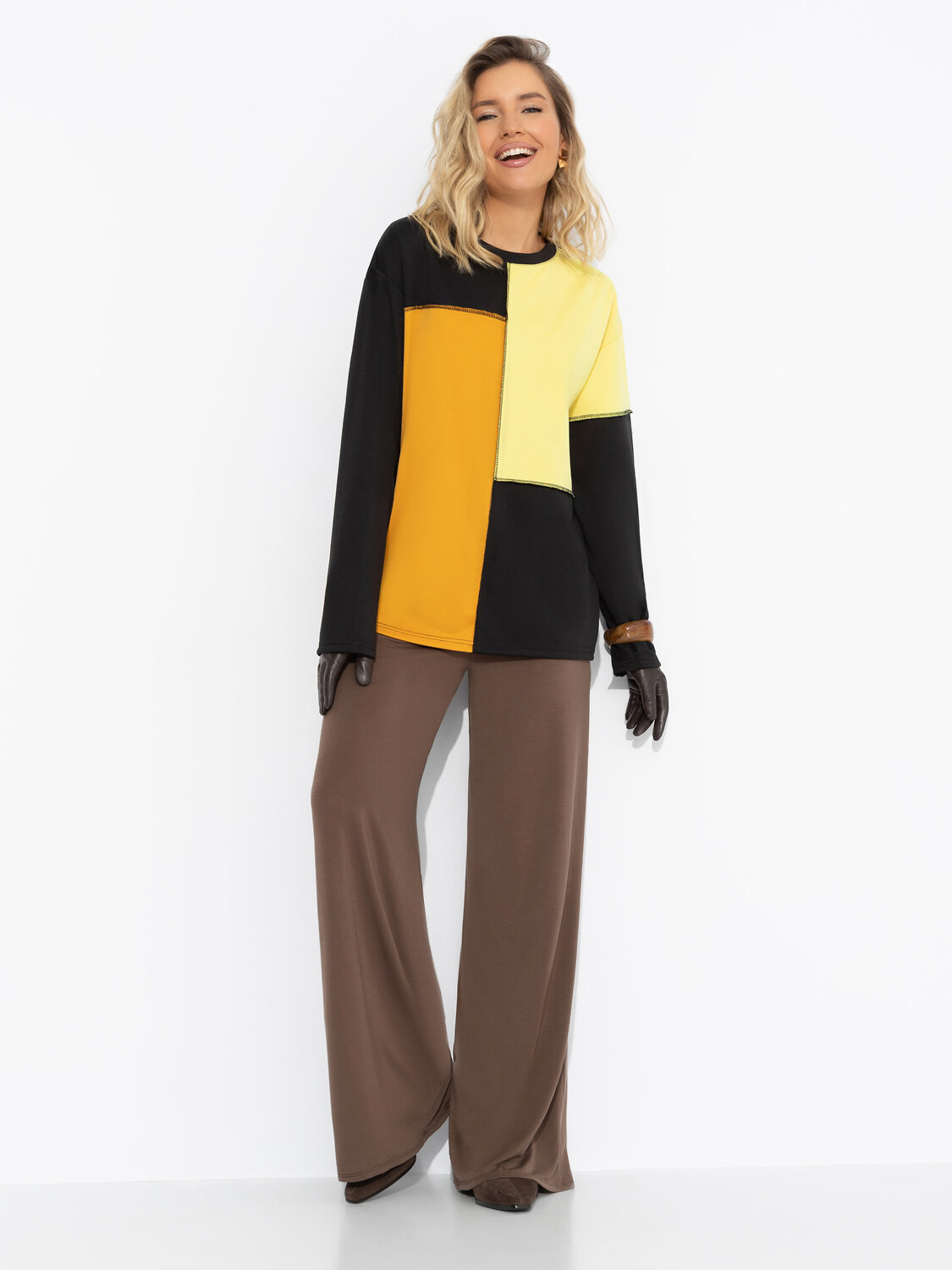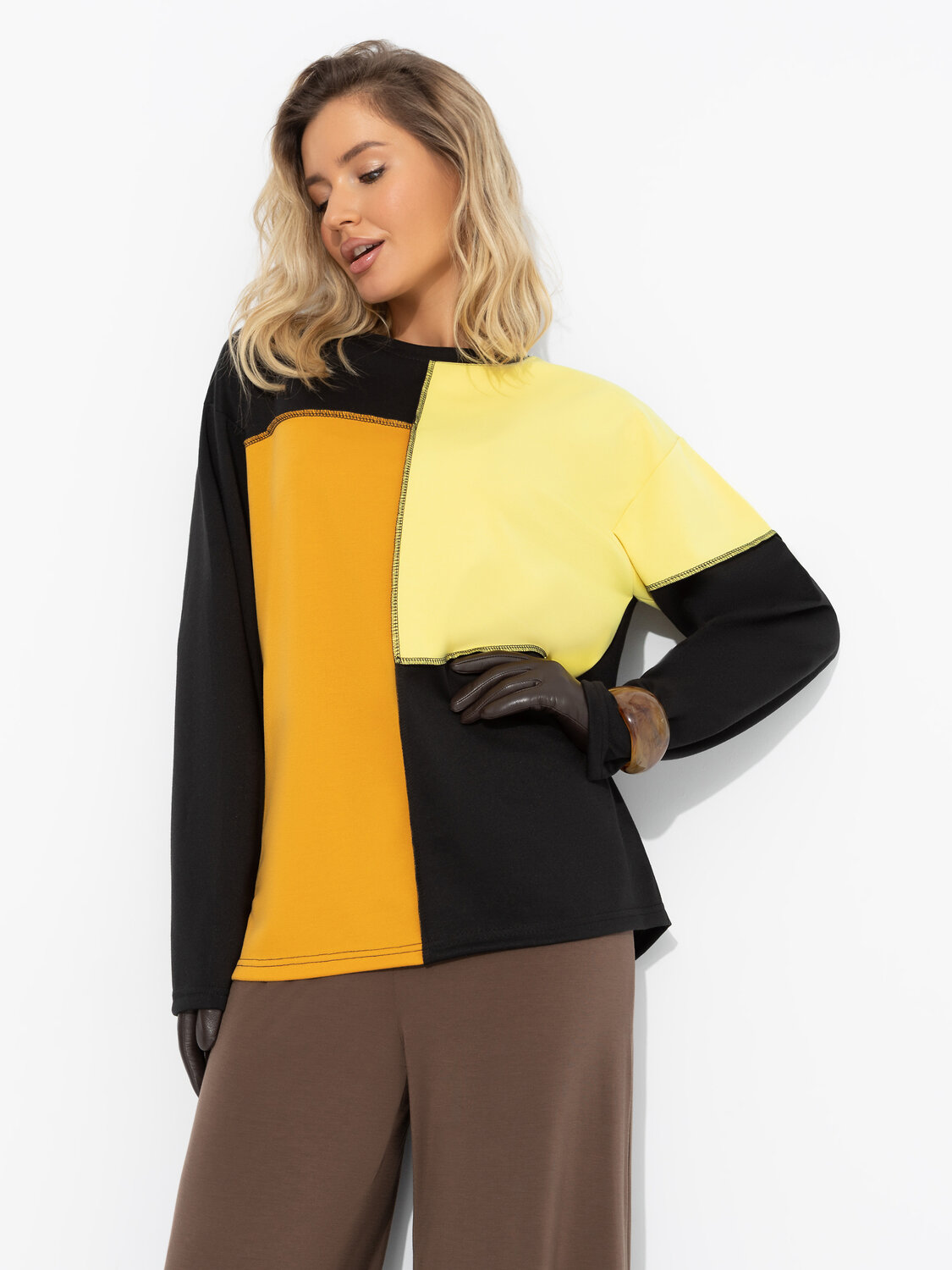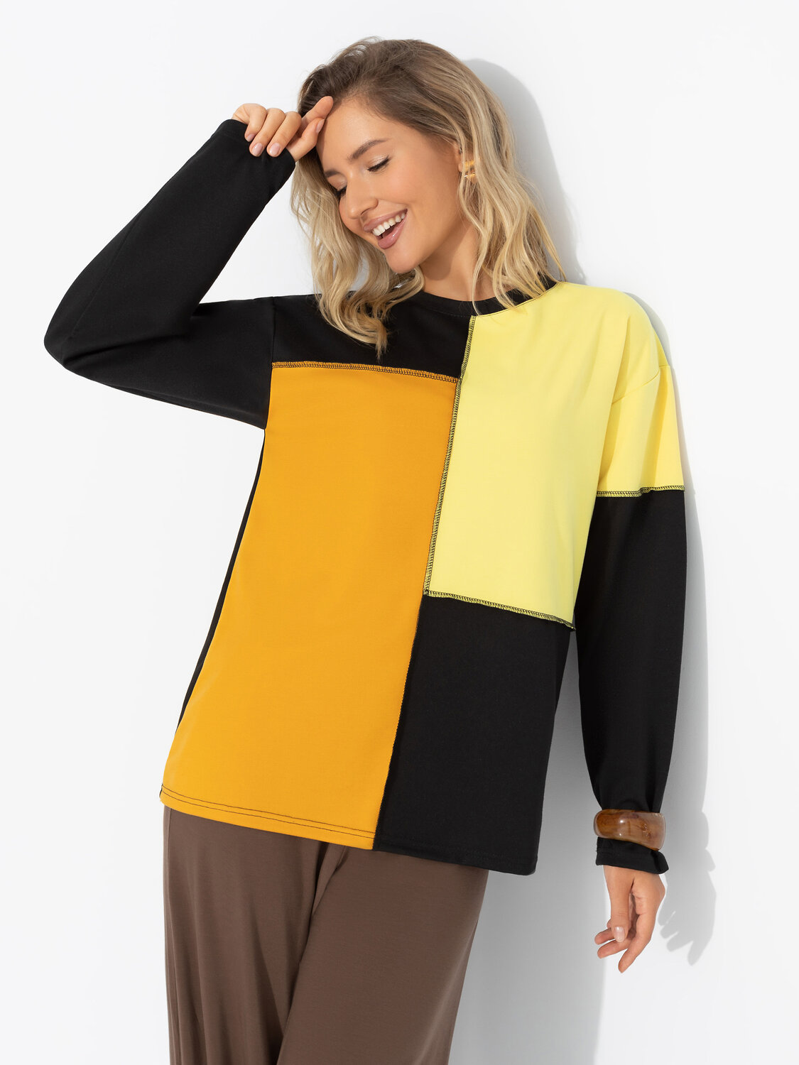 Каждой женщине нужна пауза. От социальных ярлыков, узкой одежды и каблуков. Лонгслив ЧАРУТТИ – манифест комфорта. Его свободный крой обнимает вас мягкой тканью и напоминает, что в жизни важен баланс. Лонгслив объемного кроя, удлиненный. Комбинация нескольких цветов материала. По передней стороне изделия наружние швы.