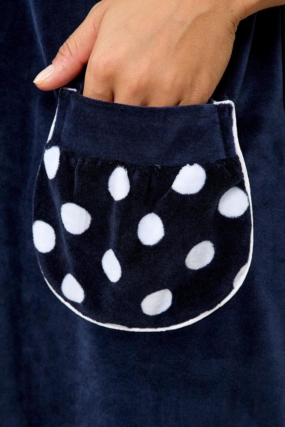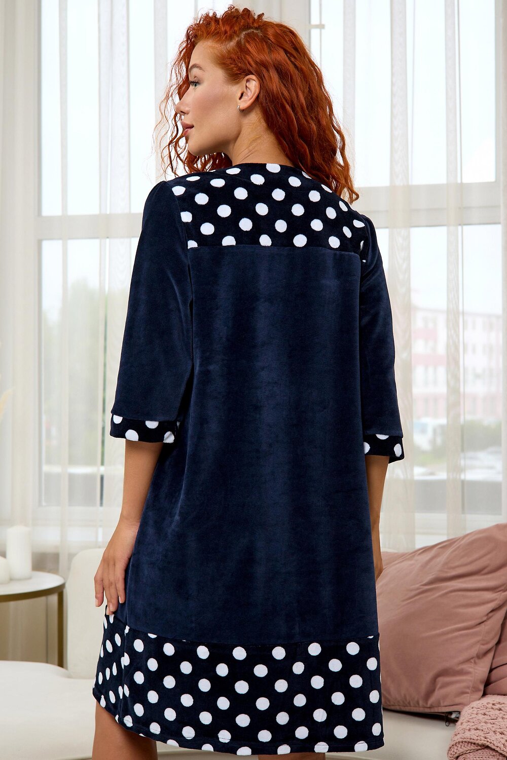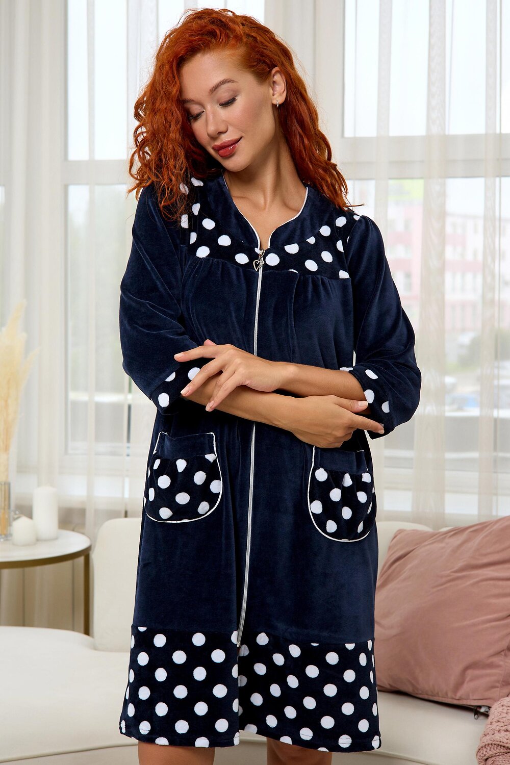 Красивый велюровый халат для дома. Застежка на молнии, свободный крой, два больших накладных кармашка для мелочей, воротник стоечка, длина до колена – все детали идеально сочетаются в модели. Удобный, повседневный женский халат для домашних дел.