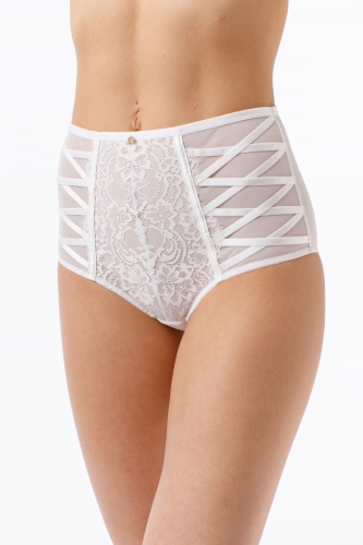Трусы макси с высокой линией талии. выполнены из эластичного кружева и эластичной сетки.Украшение декоративные ленты и металлический медальон с логтипом COQUETTE REVUE.