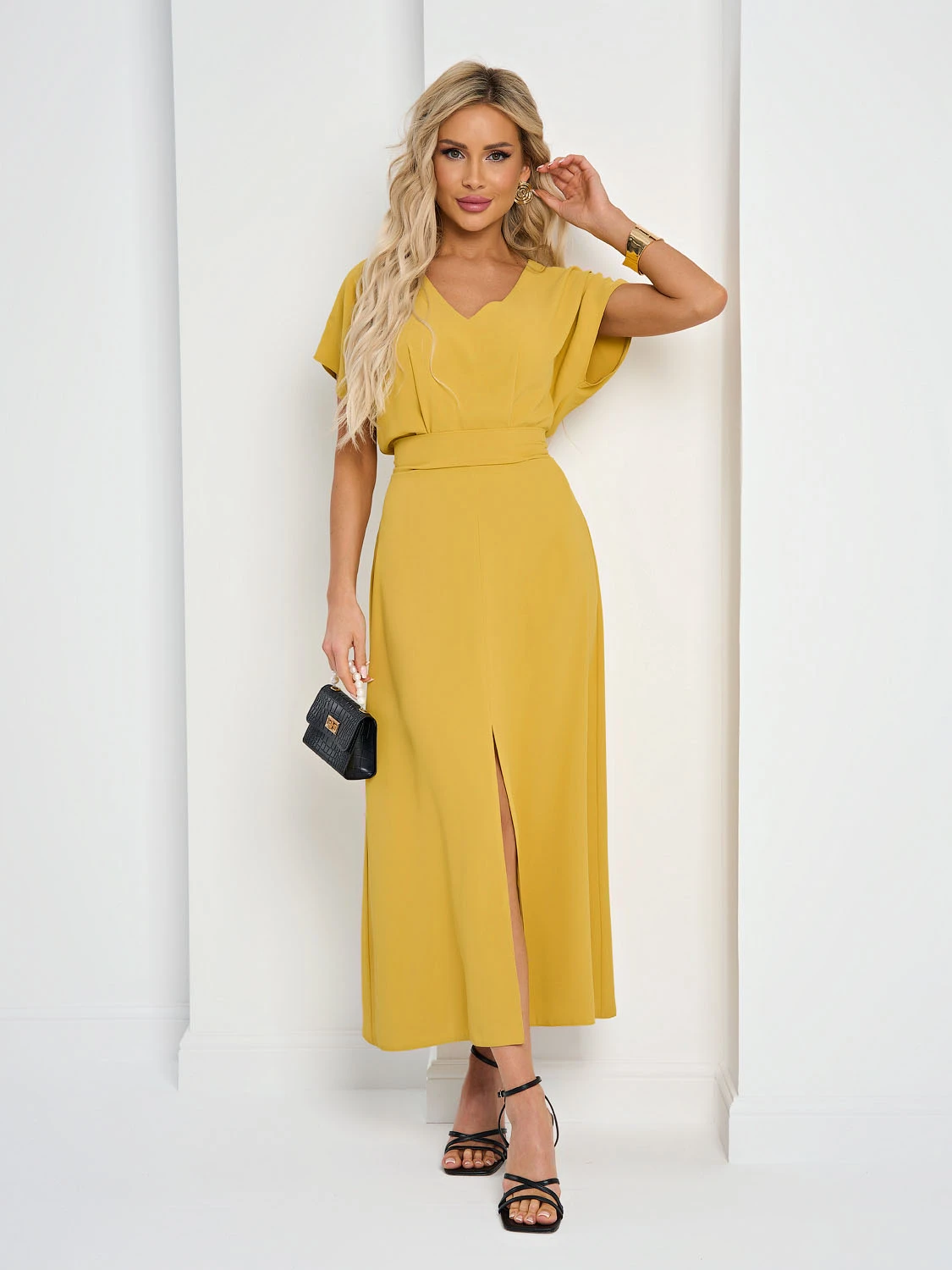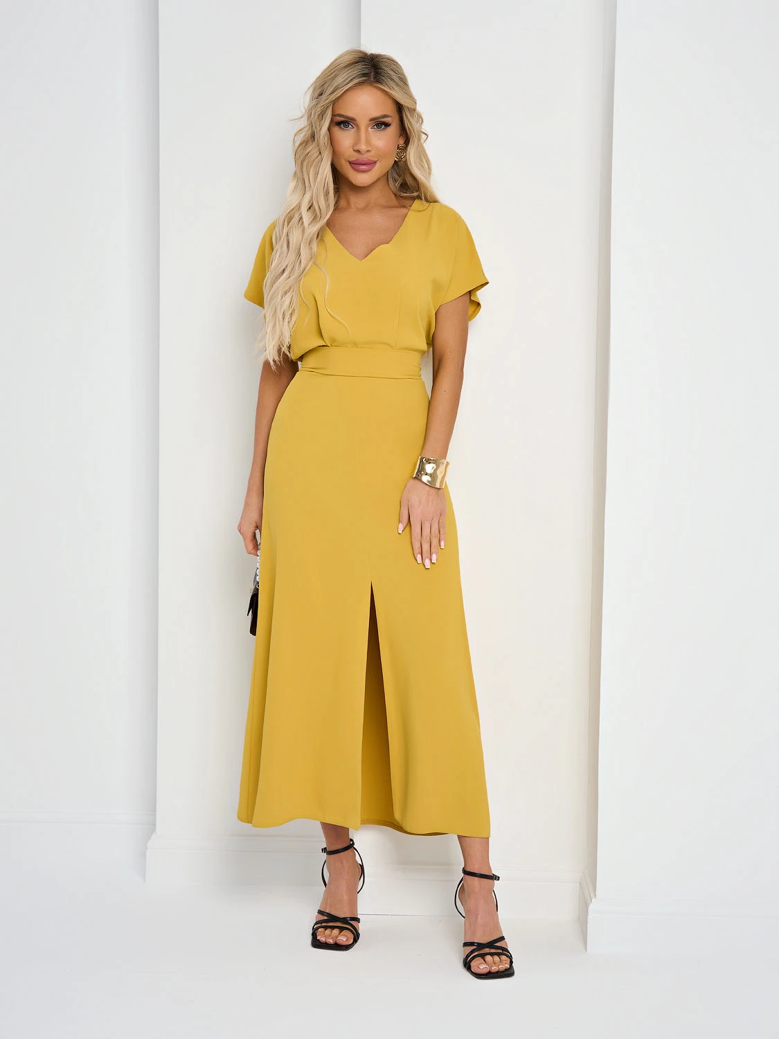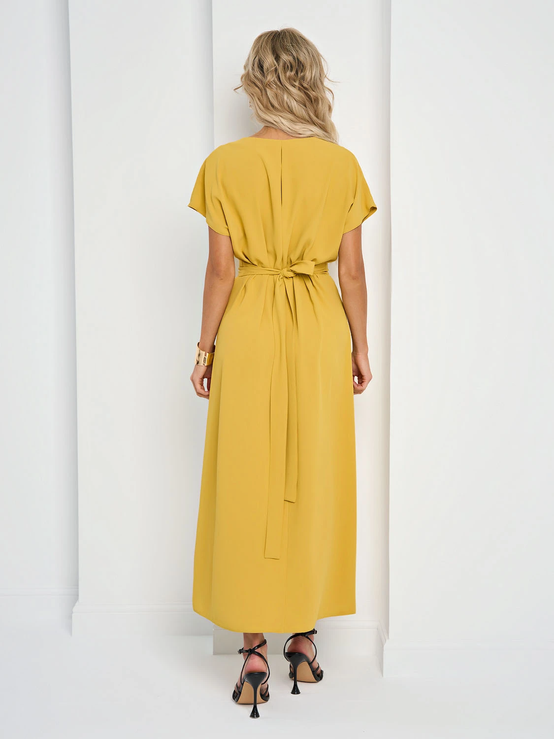 Платье с отрезной талией по переду, в шов вшит широкий пояс, который завязывается сзади.